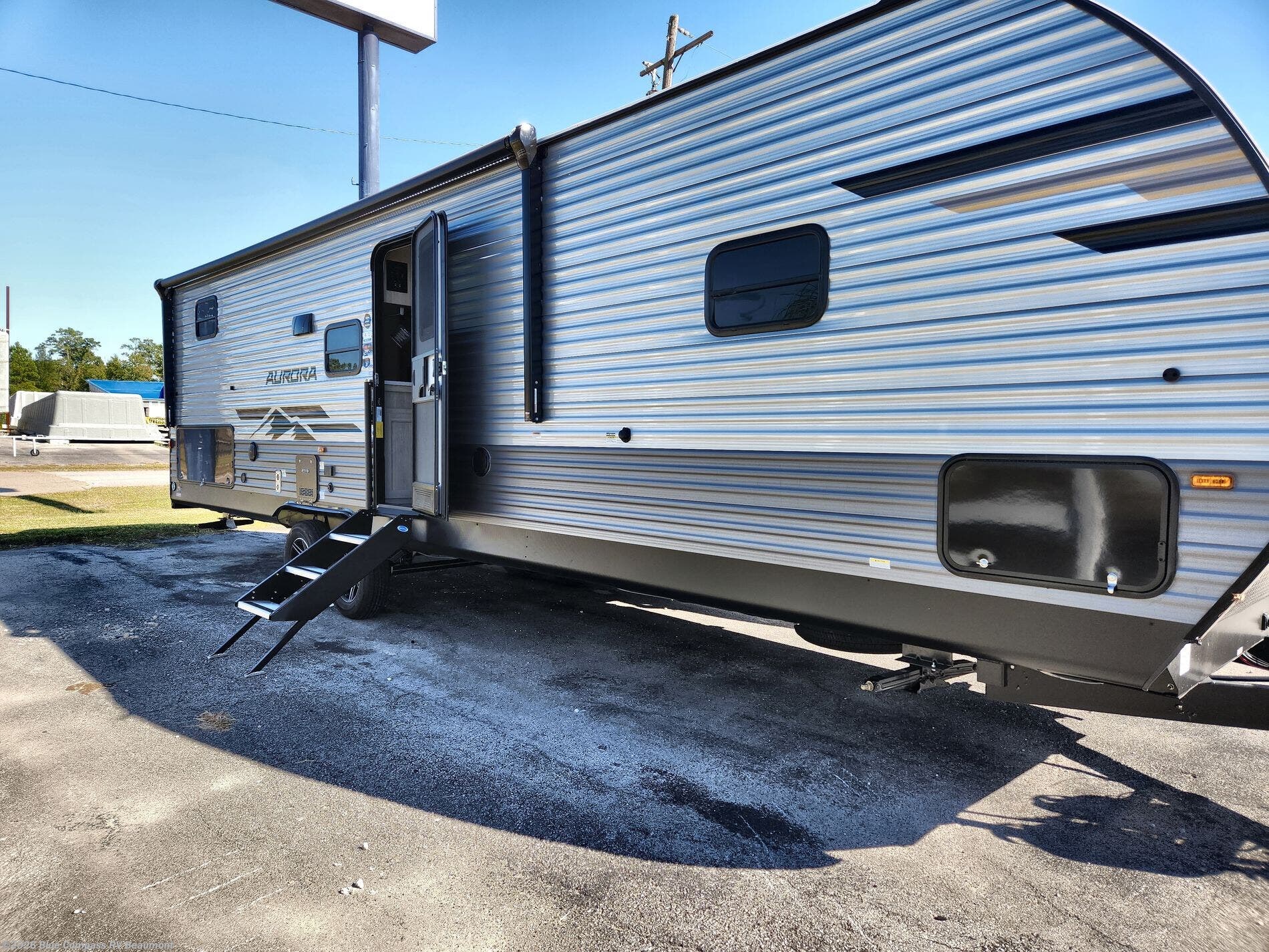Comfortability, usability, and quality is what you will find in each one of these Forest River Aurora travel trailers, toy haulers or destination trailers! They are designed with a superior build and packed full with industry leading, functional, and distinctive standard features. SolidStep entrance steps and a Safe-T rail door assist on main entry door to help you safely enter and exit the unit. The diamond plate rock guard will protect your unit from road debris and the nitrogen filled radial tires, which keep their pressure longer, offer better fuel economy. You will also find upgraded JBL Elite exterior speakers outside, an electric awning with multicolor lights and remote, plus flush mount baggage doors for easy packing. The interiors are beautifully designed with a deep undermount farm style sink, stainless steel appliances, and linoleum flooring in the slide outs which will be easy to clean. Come find your favorite model today!