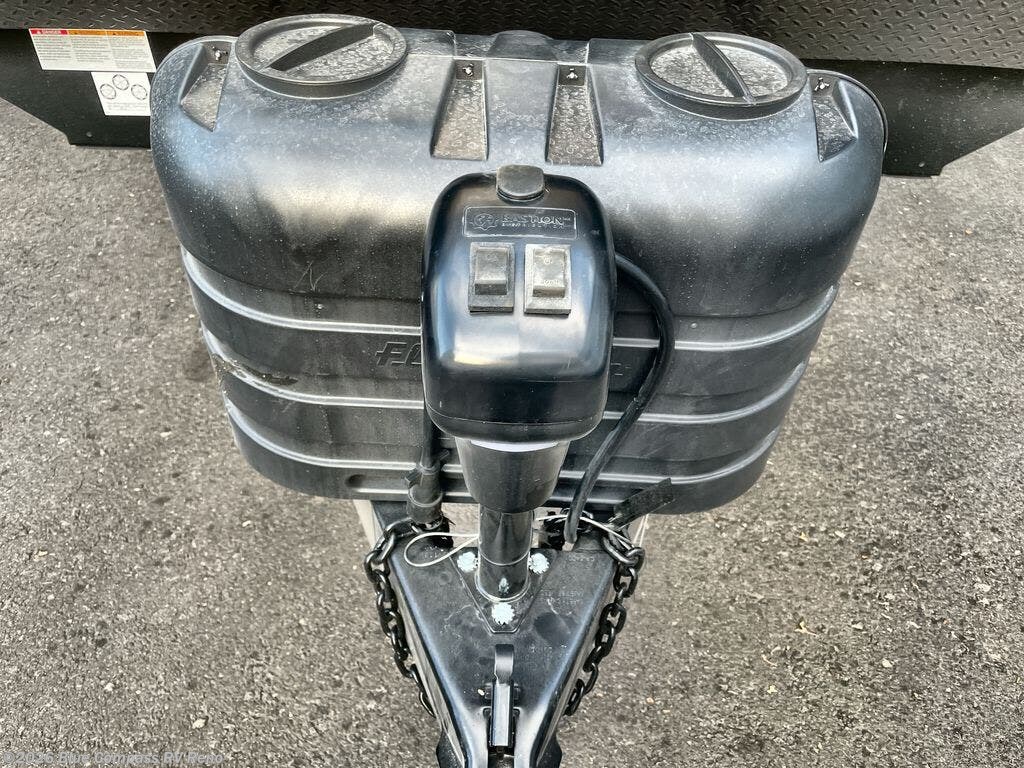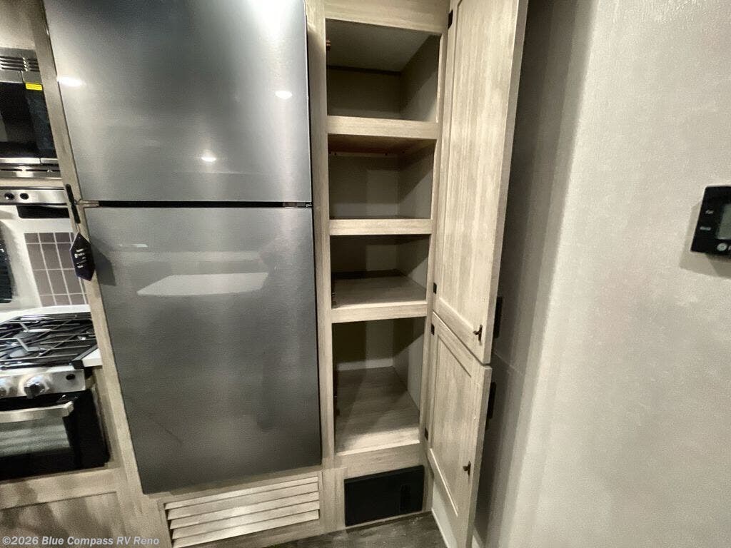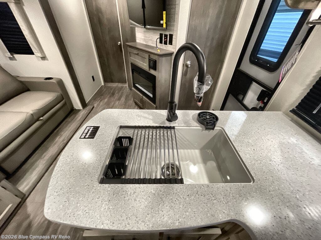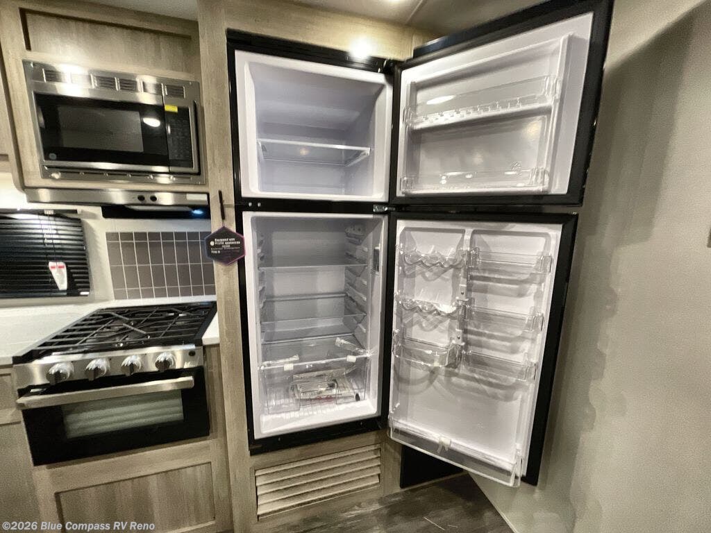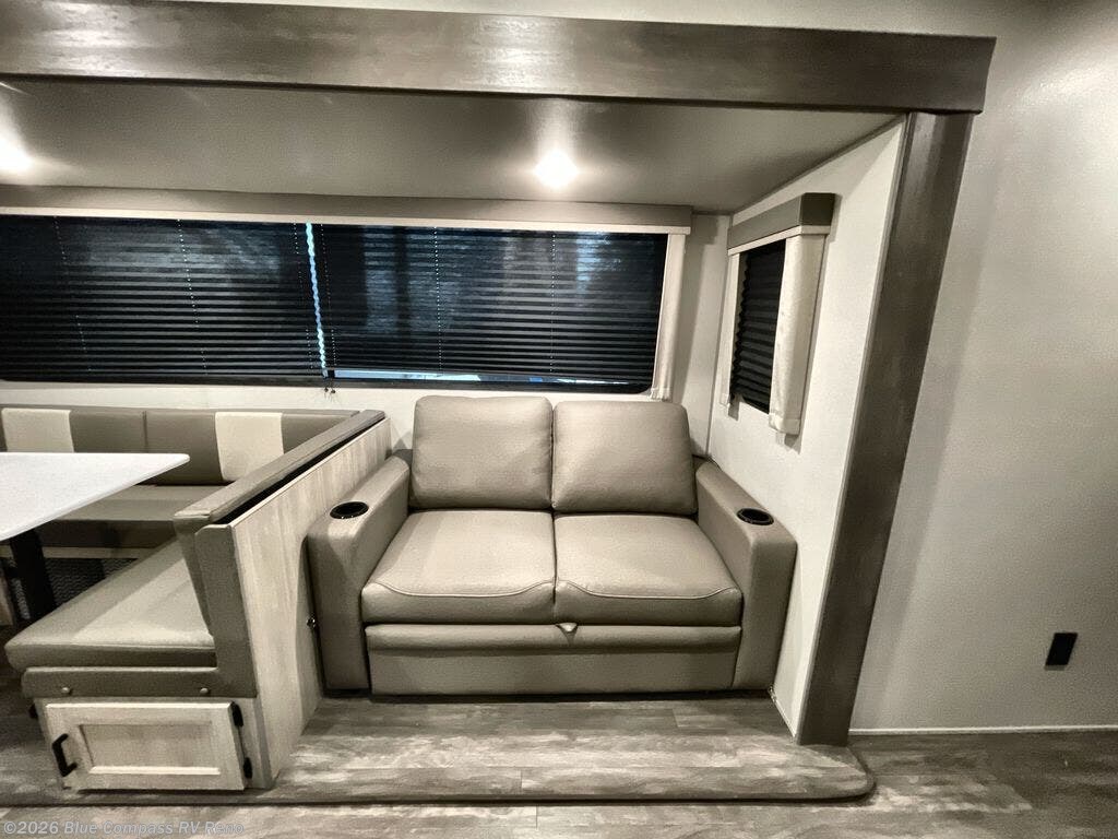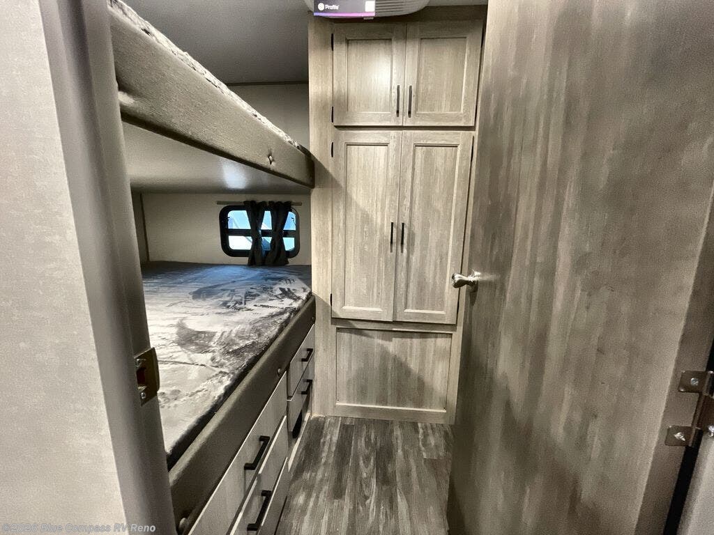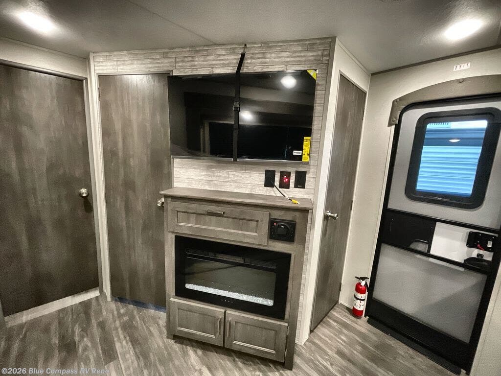 The rear private bunkhouse in this travel trailer is perfect for the kids or guests! It has a set of queen bunk beds with storage totes underneath and a linen closet. The dual entry bathroom is convenient for all to access it and has a 34" x 34" radius shower with a skylight above for natural lighting as you get ready. The chef can prepare their best meals with the three burner cooktop and everyone can enjoy them at the U-shaped dinette. The sofa is across from the entertainment center with an optional fireplace to add for extra comfort. The front private bedroom has a 60" x 74" queen bed to lay your head on at night and wardrobes on either side of it to keep your clothes out of the way and looking their best, plus an entrance into the dual entry bathroom!