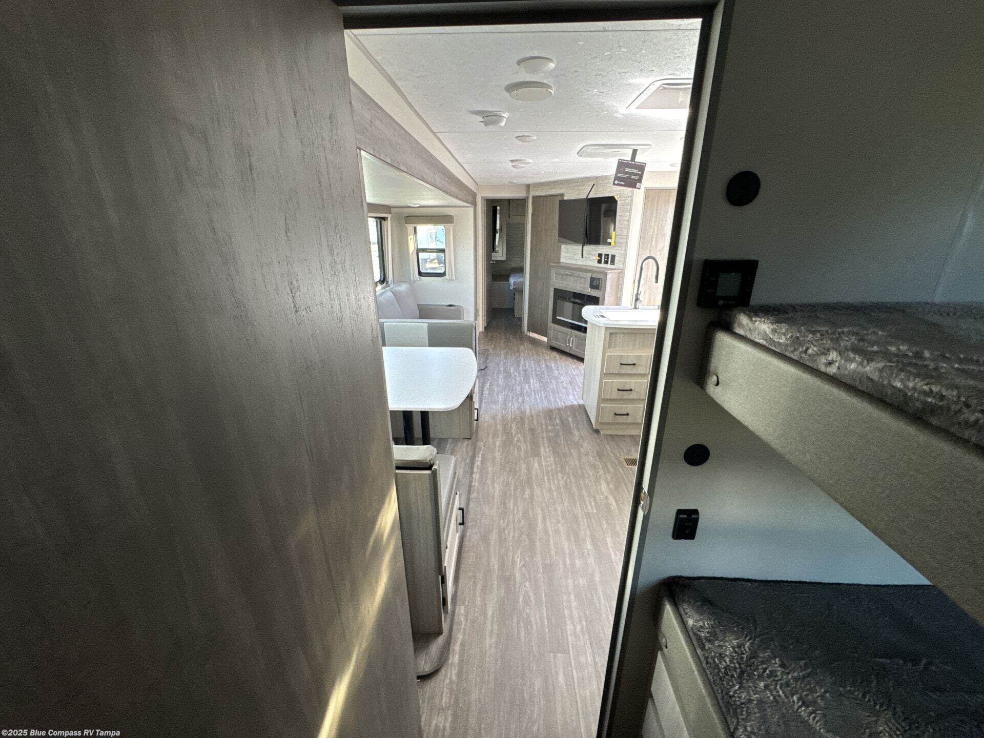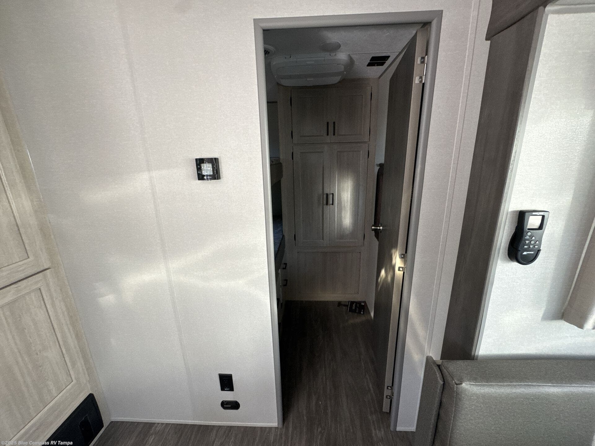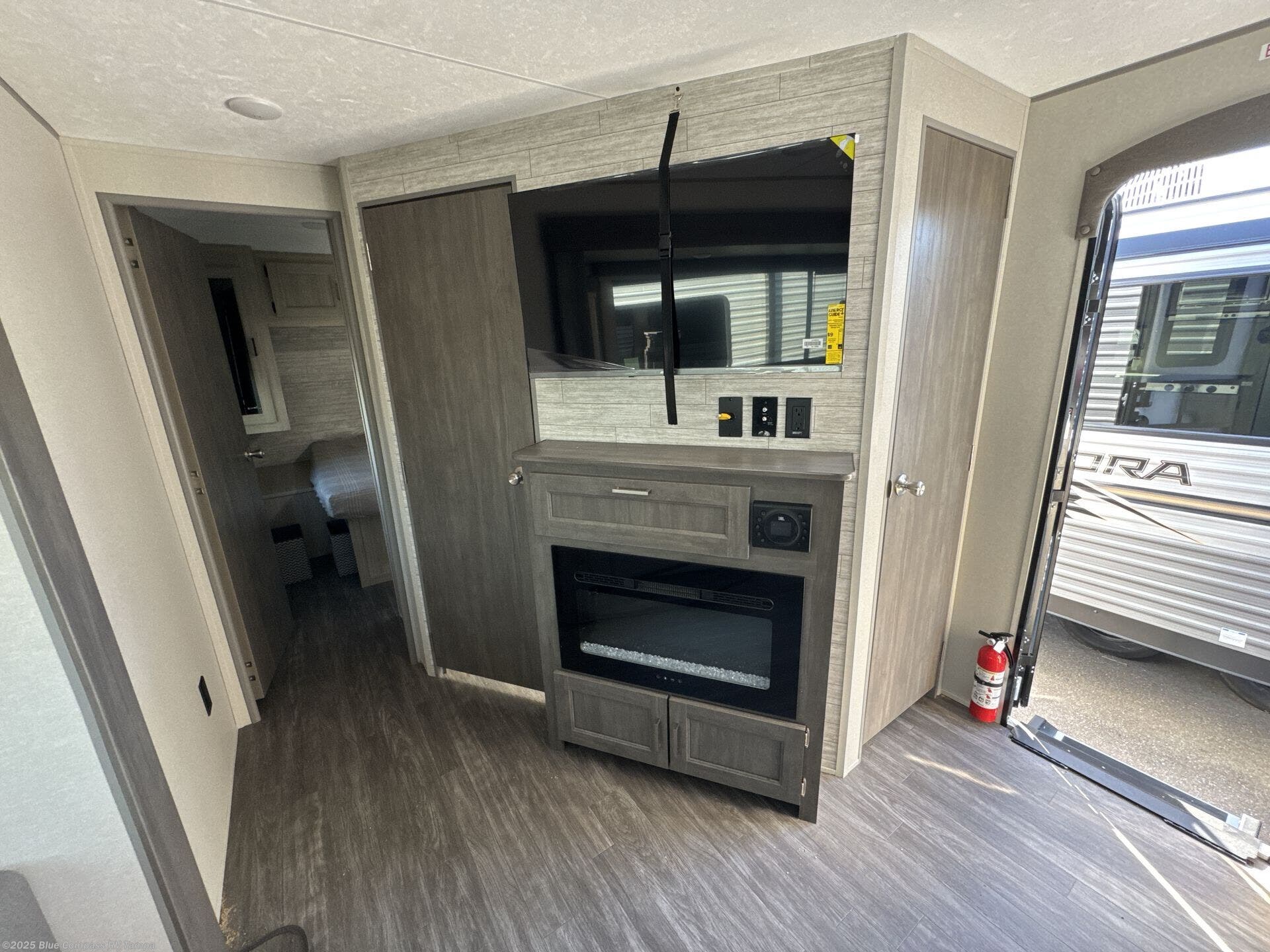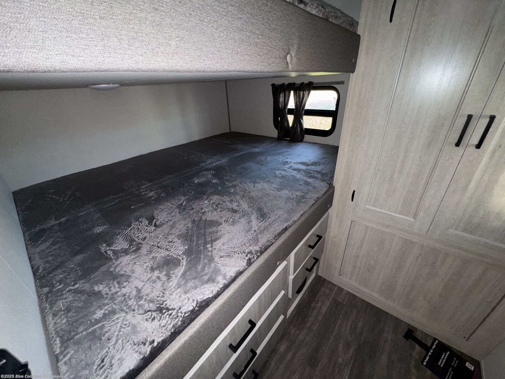 The rear private bunkhouse in this travel trailer is perfect for the kids or guests! It has a set of queen bunk beds with storage totes underneath and a linen closet. The dual entry bathroom is convenient for all to access it and has a 34" x 34" radius shower with a skylight above for natural lighting as you get ready. The chef can prepare their best meals with the three burner cooktop and everyone can enjoy them at the U-shaped dinette. The sofa is across from the entertainment center with an optional fireplace to add for extra comfort. The front private bedroom has a 60" x 74" queen bed to lay your head on at night and wardrobes on either side of it to keep your clothes out of the way and looking their best, plus an entrance into the dual entry bathroom!