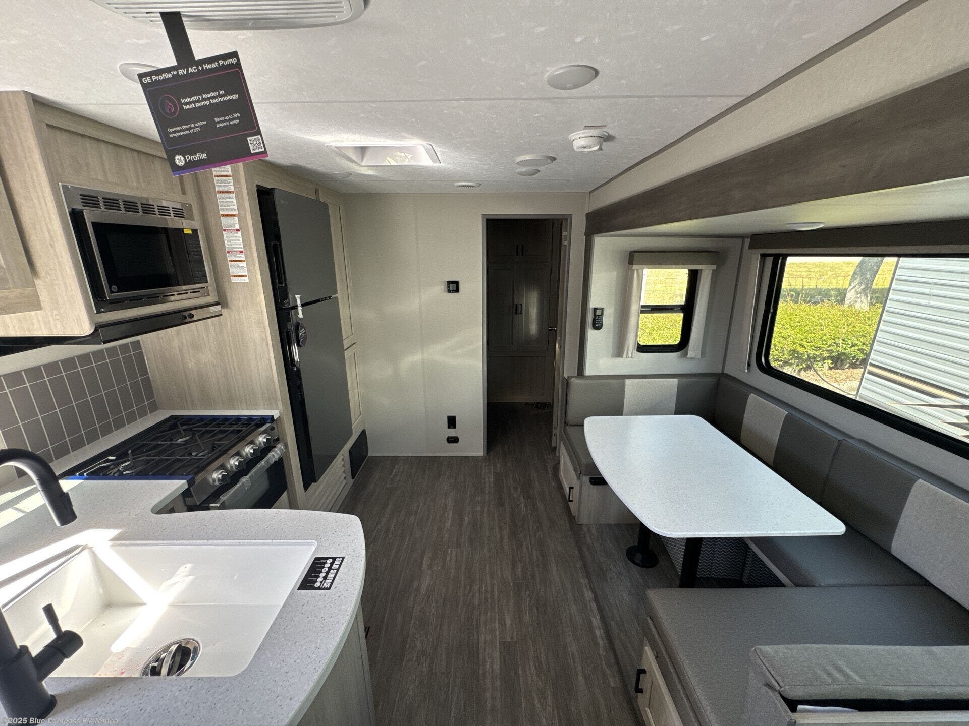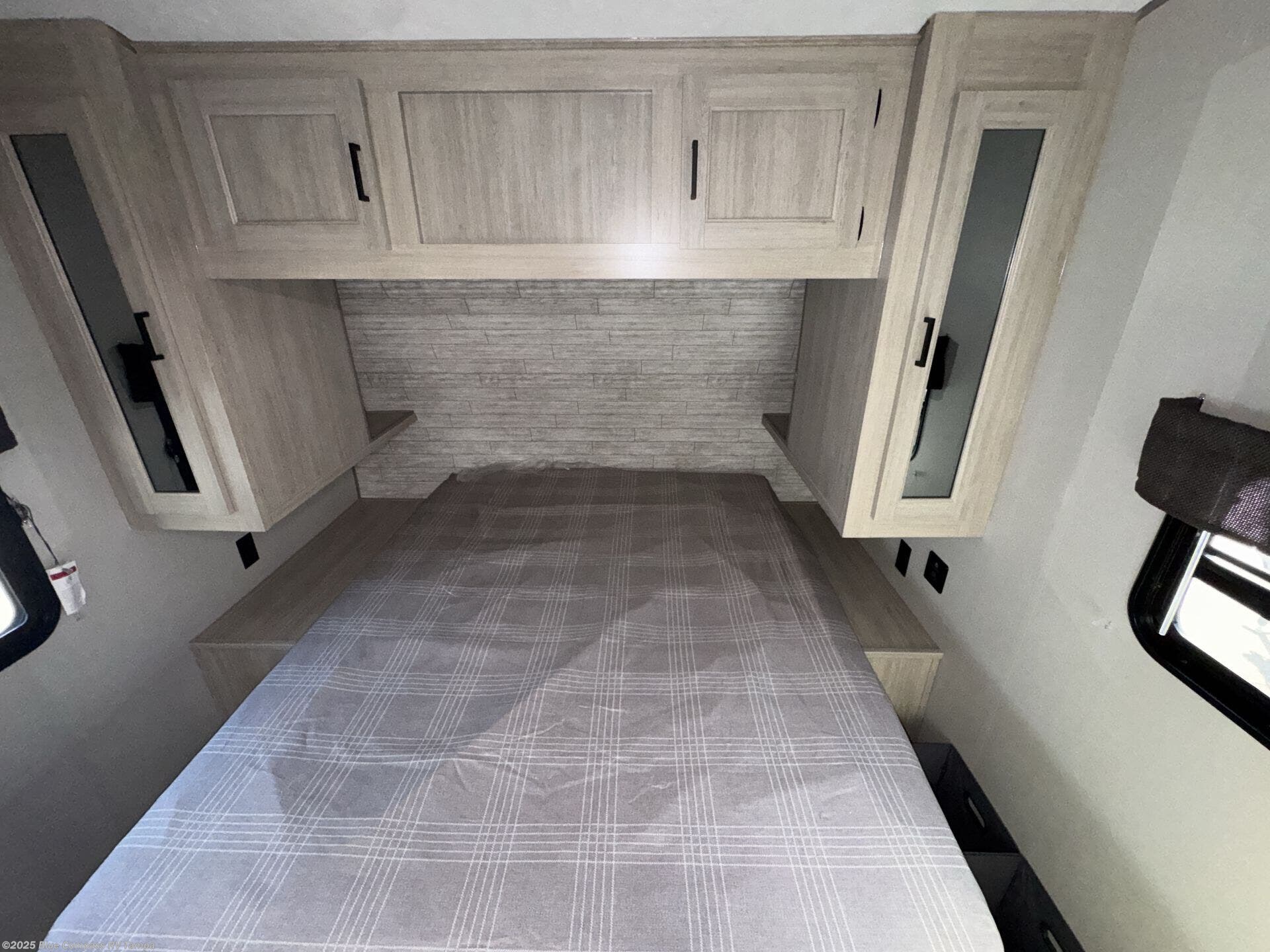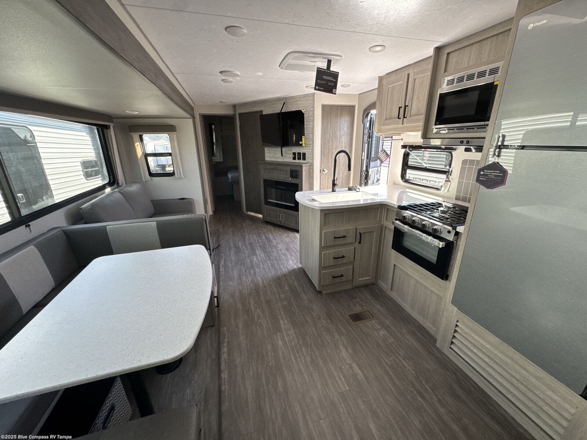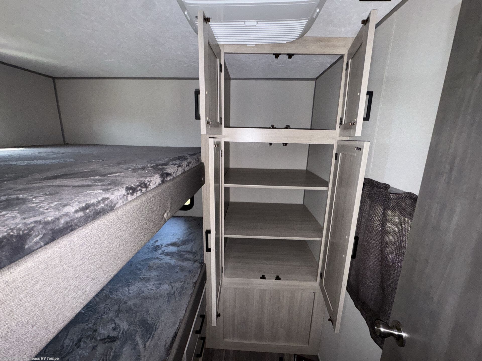 The rear private bunkhouse in this travel trailer is perfect for the kids or guests! It has a set of queen bunk beds with storage totes underneath and a linen closet. The dual entry bathroom is convenient for all to access it and has a 34" x 34" radius shower with a skylight above for natural lighting as you get ready. The chef can prepare their best meals with the three burner cooktop and everyone can enjoy them at the U-shaped dinette. The sofa is across from the entertainment center with an optional fireplace to add for extra comfort. The front private bedroom has a 60" x 74" queen bed to lay your head on at night and wardrobes on either side of it to keep your clothes out of the way and looking their best, plus an entrance into the dual entry bathroom!