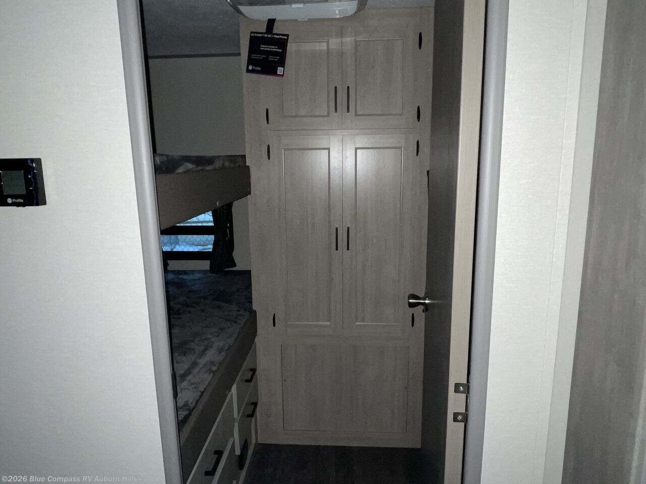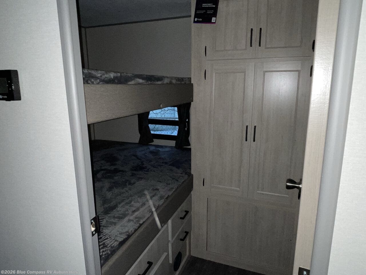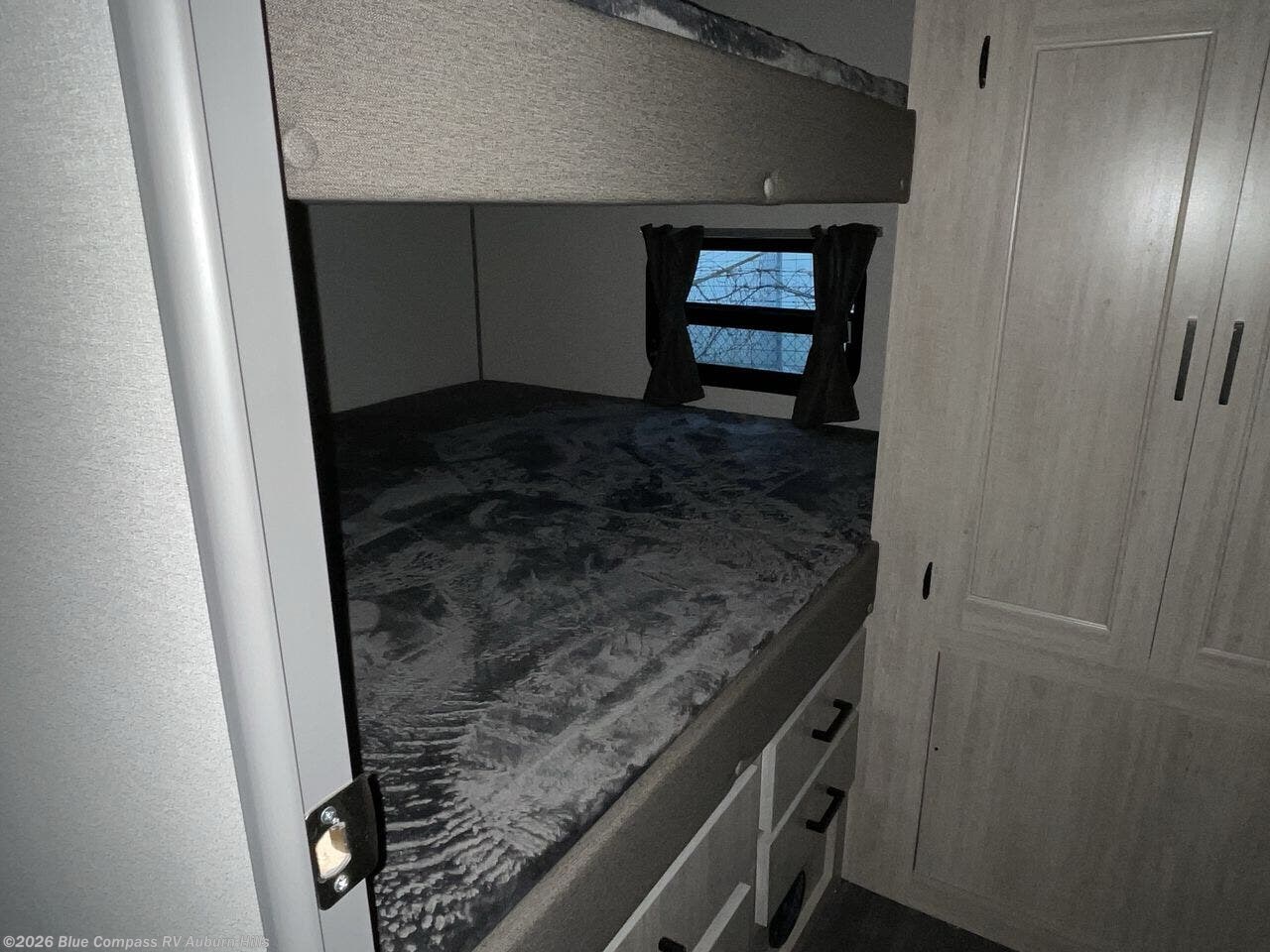 The rear private bunkhouse in this travel trailer is perfect for the kids or guests! It has a set of queen bunk beds with storage totes underneath and a linen closet. The dual entry bathroom is convenient for all to access it and has a 34" x 34" radius shower with a skylight above for natural lighting as you get ready. The chef can prepare their best meals with the three burner cooktop and everyone can enjoy them at the U-shaped dinette. The sofa is across from the entertainment center with an optional fireplace to add for extra comfort. The front private bedroom has a 60" x 74" queen bed to lay your head on at night and wardrobes on either side of it to keep your clothes out of the way and looking their best, plus an entrance into the dual entry bathroom!