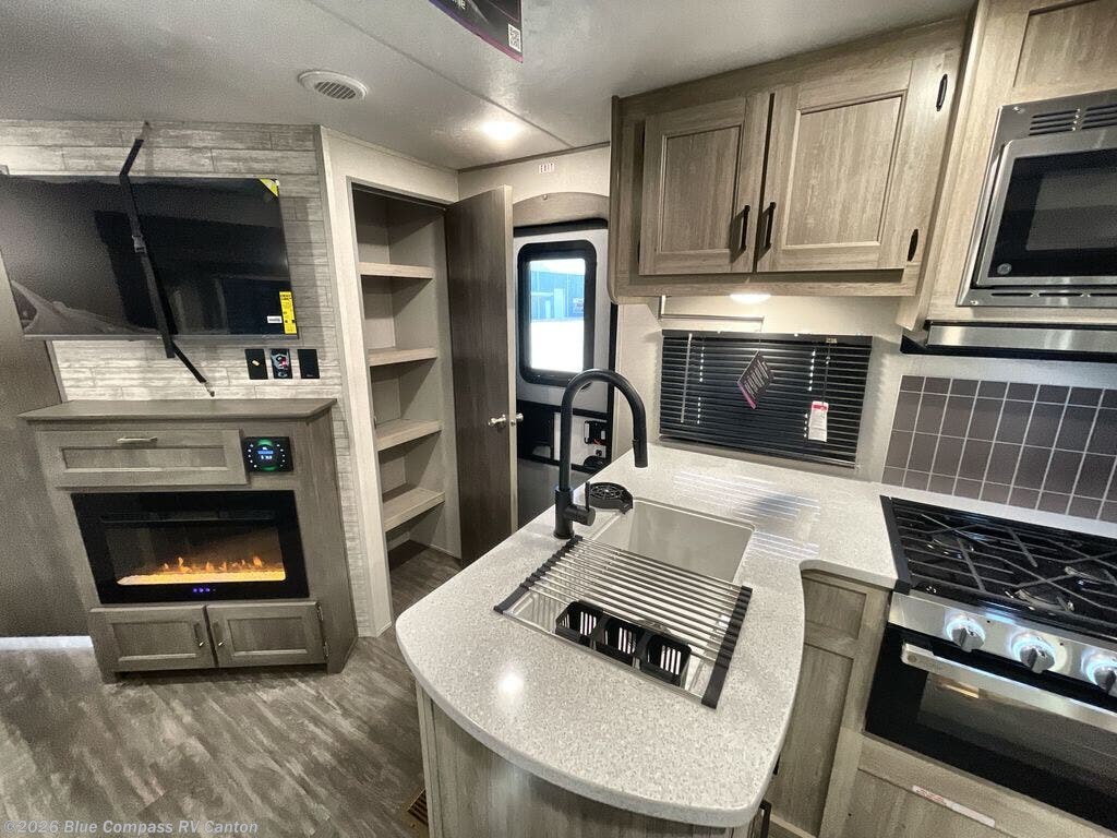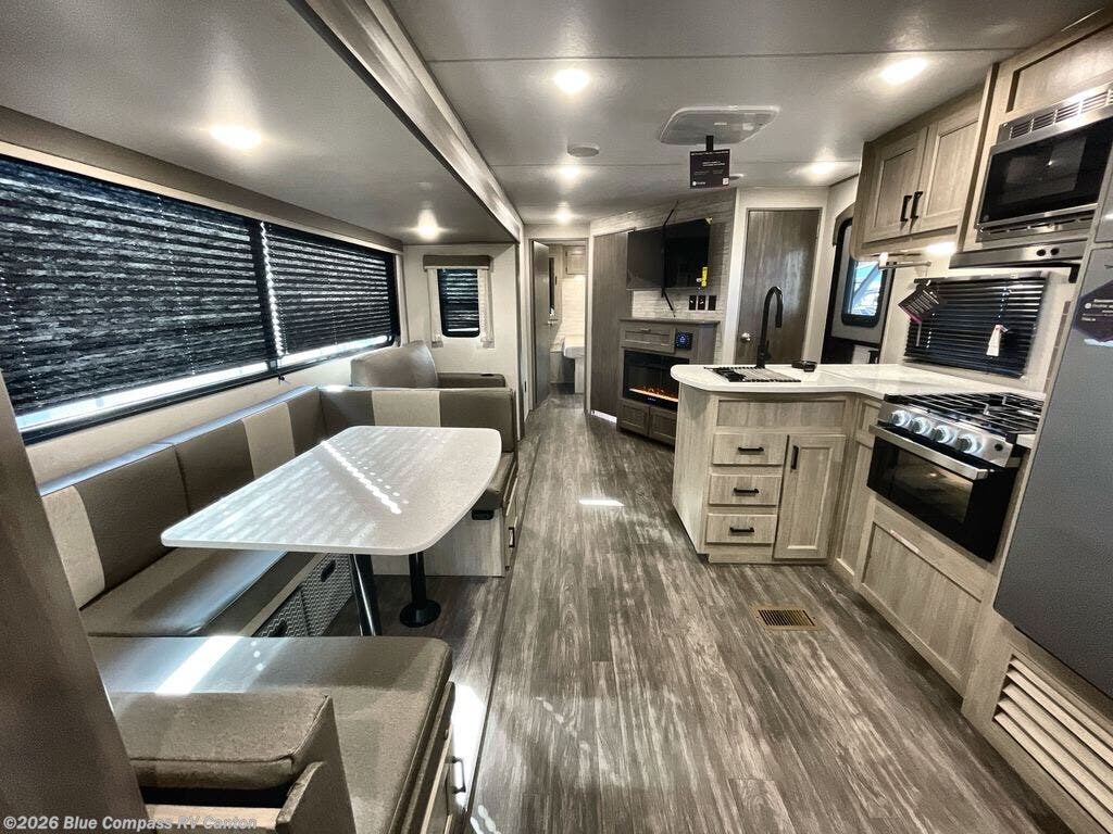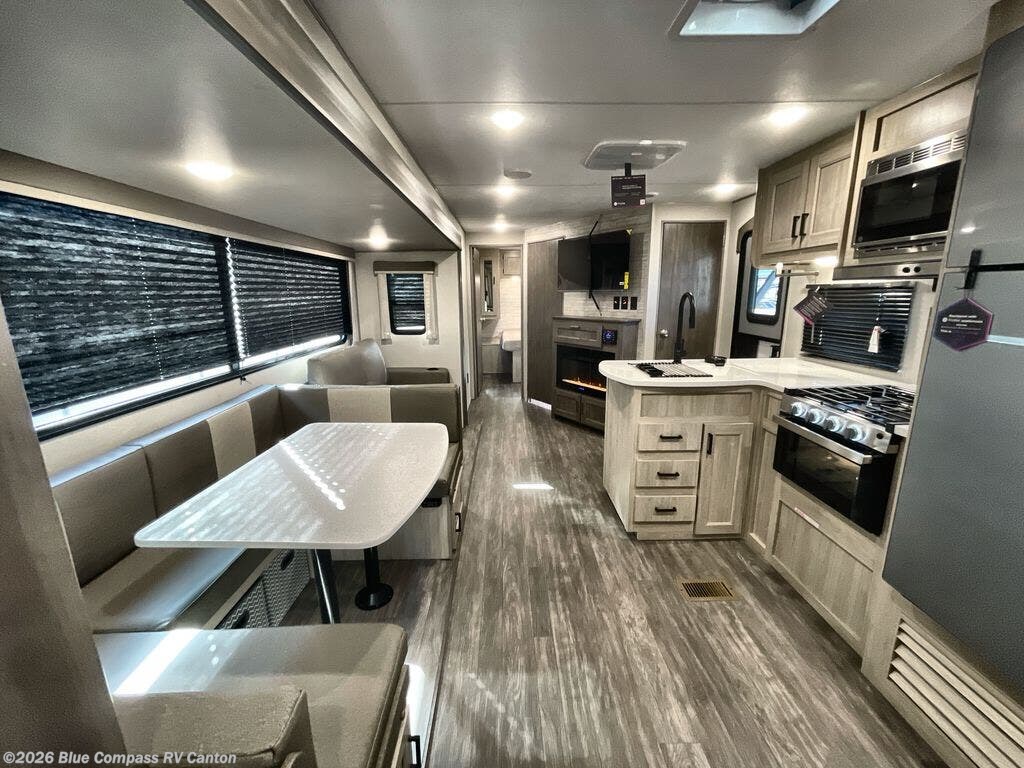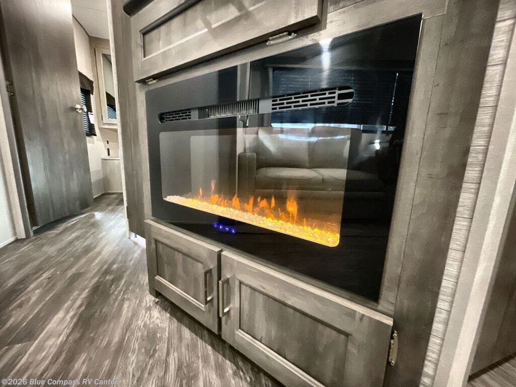 The rear private bunkhouse in this travel trailer is perfect for the kids or guests! It has a set of queen bunk beds with storage totes underneath and a linen closet. The dual entry bathroom is convenient for all to access it and has a 34" x 34" radius shower with a skylight above for natural lighting as you get ready. The chef can prepare their best meals with the three burner cooktop and everyone can enjoy them at the U-shaped dinette. The sofa is across from the entertainment center with an optional fireplace to add for extra comfort. The front private bedroom has a 60" x 74" queen bed to lay your head on at night and wardrobes on either side of it to keep your clothes out of the way and looking their best, plus an entrance into the dual entry bathroom!