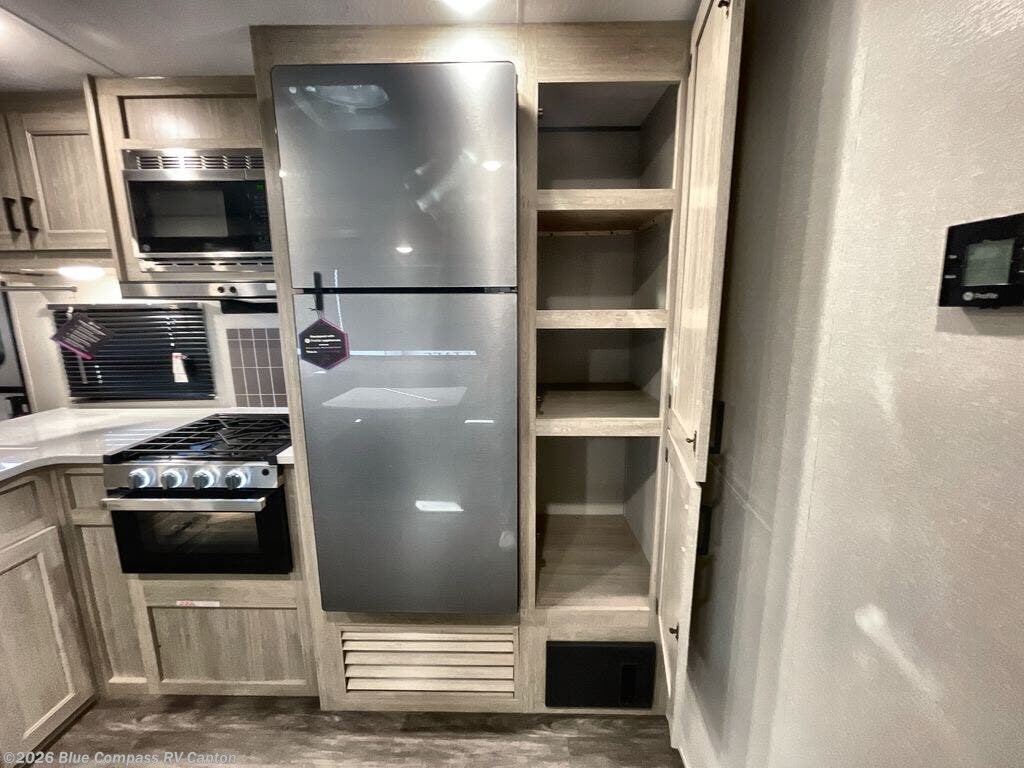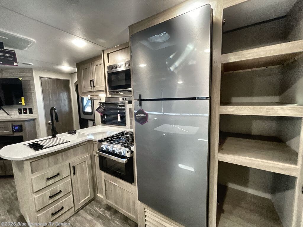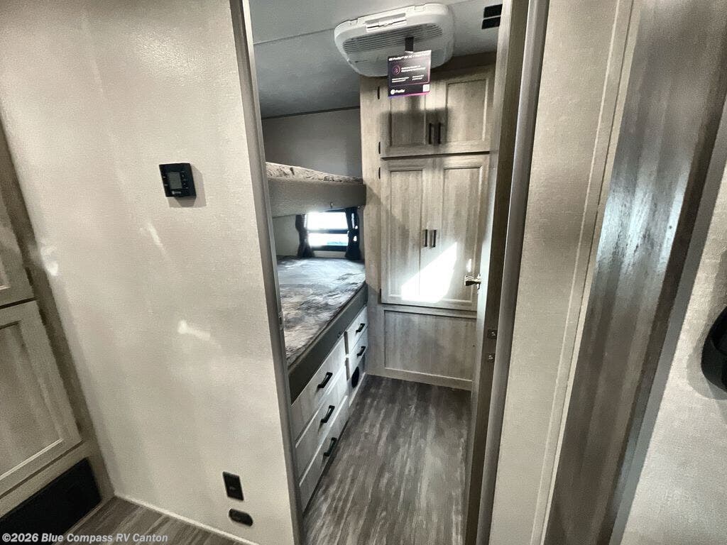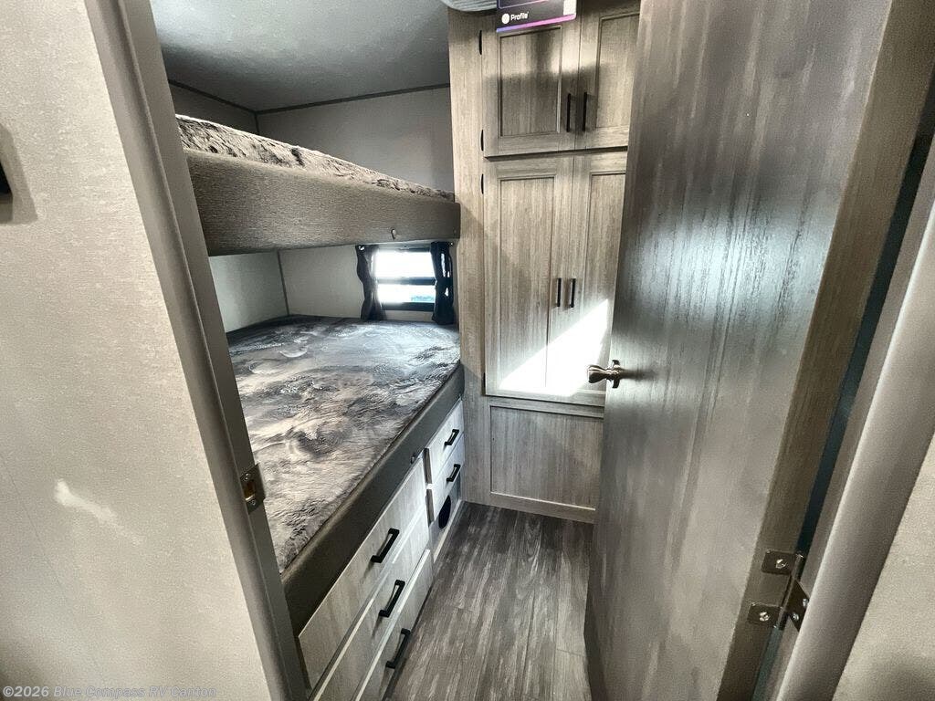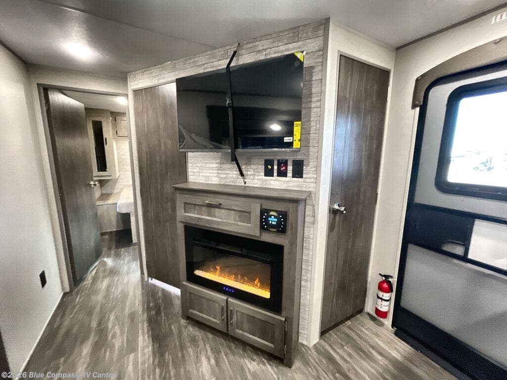 The rear private bunkhouse in this travel trailer is perfect for the kids or guests! It has a set of queen bunk beds with storage totes underneath and a linen closet. The dual entry bathroom is convenient for all to access it and has a 34" x 34" radius shower with a skylight above for natural lighting as you get ready. The chef can prepare their best meals with the three burner cooktop and everyone can enjoy them at the U-shaped dinette. The sofa is across from the entertainment center with an optional fireplace to add for extra comfort. The front private bedroom has a 60" x 74" queen bed to lay your head on at night and wardrobes on either side of it to keep your clothes out of the way and looking their best, plus an entrance into the dual entry bathroom!