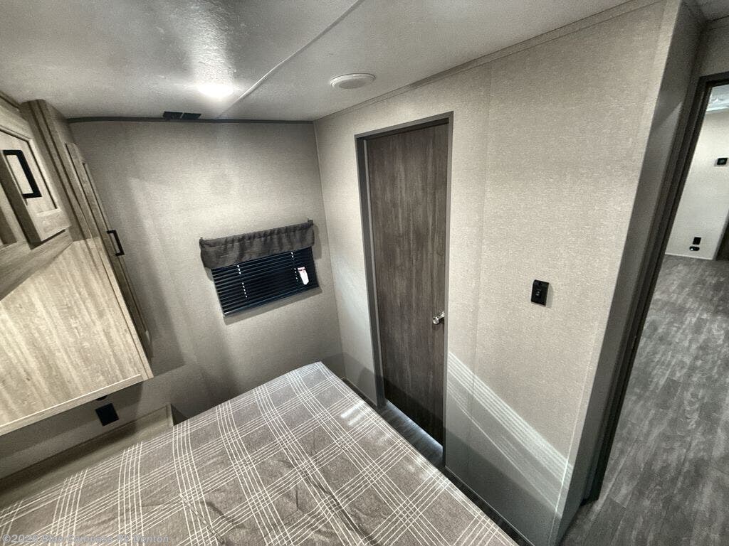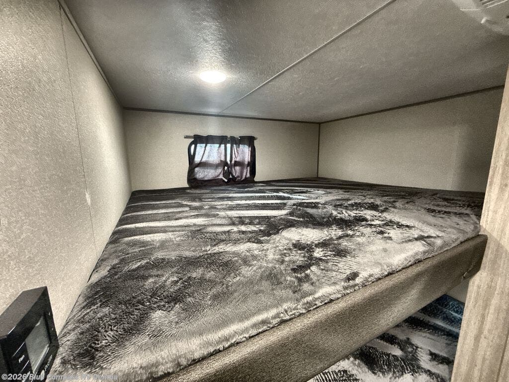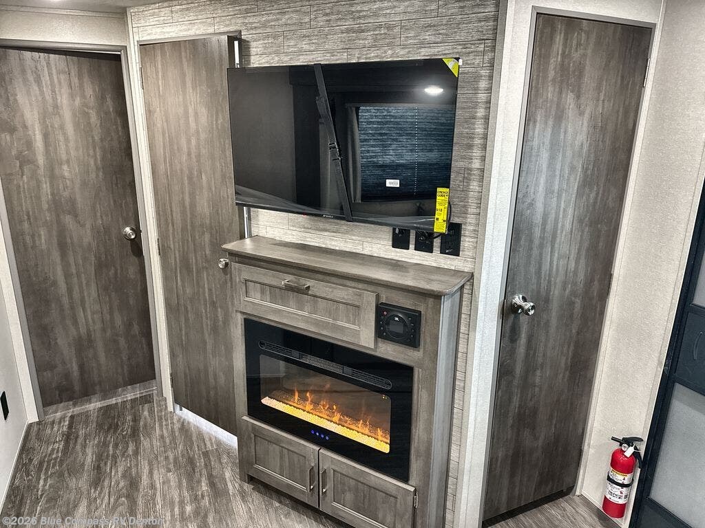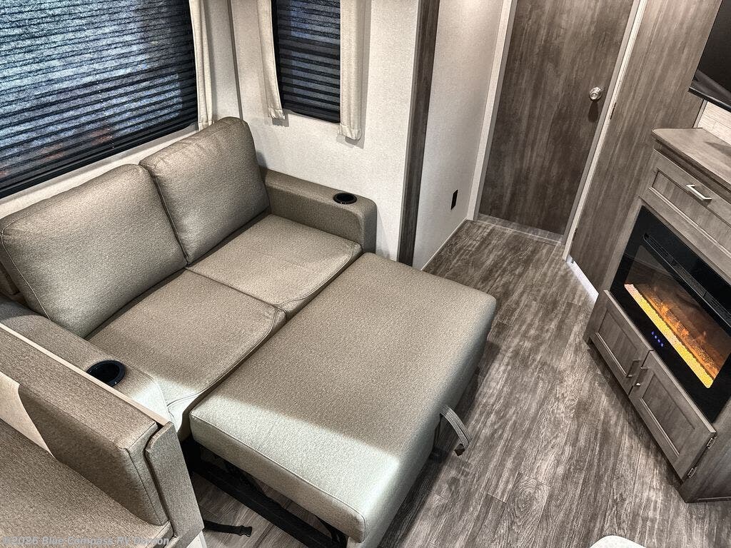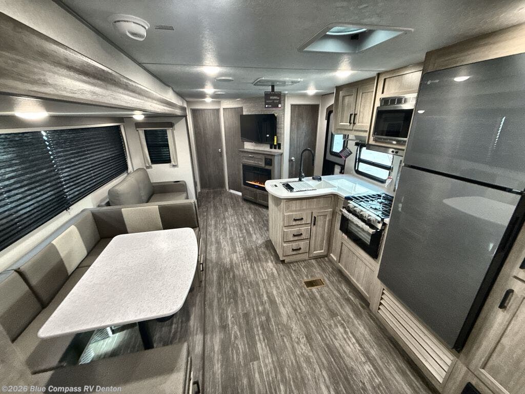 The rear private bunkhouse in this travel trailer is perfect for the kids or guests! It has a set of queen bunk beds with an underbed storage system and a linen closet. The dual entry bathroom is convenient for all to access it and has a 34" x 34" radius shower with a skylight above for natural lighting as you get ready. The chef can prepare their best meals with the three-burner cooktop and everyone can enjoy them at the U-shaped dinette. The trundle sofa is across from the entertainment center with an optional fireplace to add for extra comfort. The front private bedroom has a 60" x 74" queen bed to lay your head on at night and wardrobes on either side of it to keep your clothes out of the way and looking their best, plus an entrance into the dual entry bathroom!