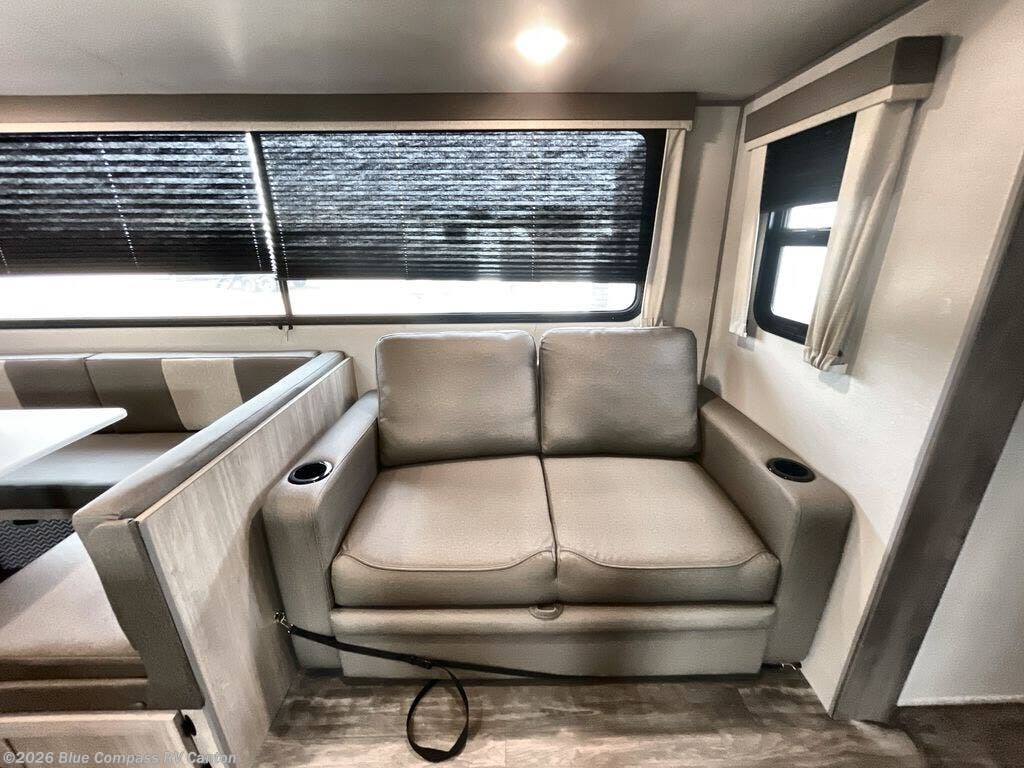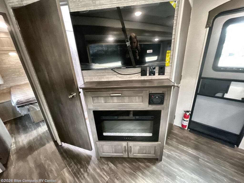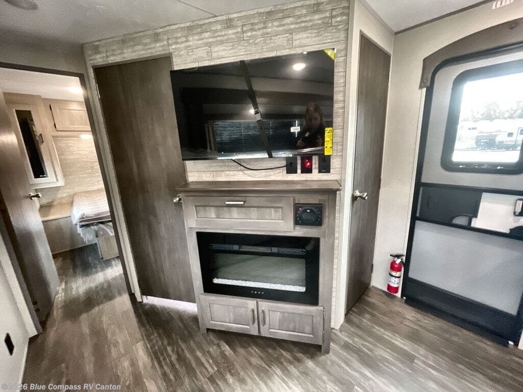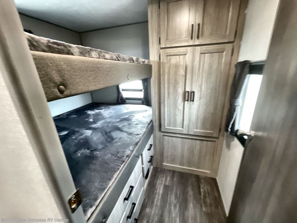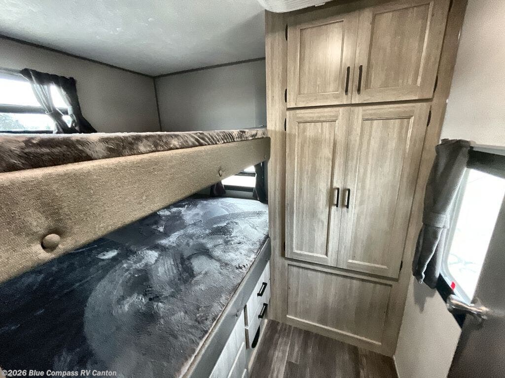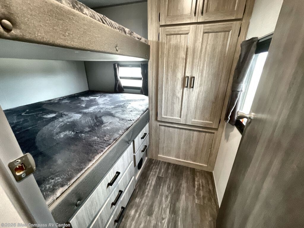 The rear private bunkhouse in this travel trailer is perfect for the kids or guests! It has a set of queen bunk beds with an underbed storage system and a linen closet. The dual entry bathroom is convenient for all to access it and has a 34" x 34" radius shower with a skylight above for natural lighting as you get ready. The chef can prepare their best meals with the three-burner cooktop and everyone can enjoy them at the U-shaped dinette. The trundle sofa is across from the entertainment center with an optional fireplace to add for extra comfort. The front private bedroom has a 60" x 74" queen bed to lay your head on at night and wardrobes on either side of it to keep your clothes out of the way and looking their best, plus an entrance into the dual entry bathroom!