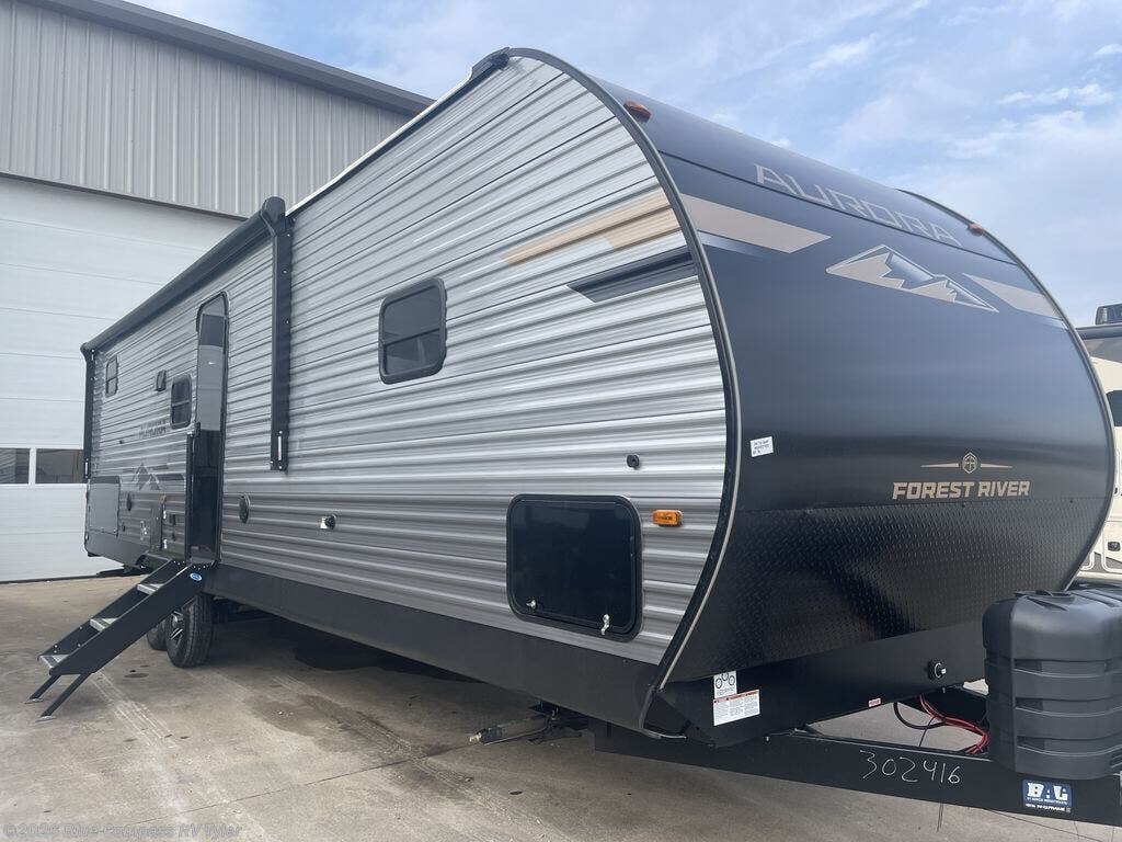 Comfortability, usability, and quality is what you will find in each one of these Forest River Aurora travel trailers, toy haulers or destination trailers! They are designed with a superior build and packed full with industry leading, functional, and distinctive standard features. SolidStep entrance steps and a Safe-T rail door assist on main entry door to help you safely enter and exit the unit. The diamond plate rock guard will protect your unit from road debris and the nitrogen filled radial tires, which keep their pressure longer, offer better fuel economy. You will also find upgraded JBL Elite exterior speakers outside, an electric awning with multicolor lights and remote, plus flush mount baggage doors for easy packing. The interiors are beautifully designed with a deep undermount farm style sink, stainless steel appliances, and linoleum flooring in the slide outs which will be easy to clean. Come find your favorite model today!