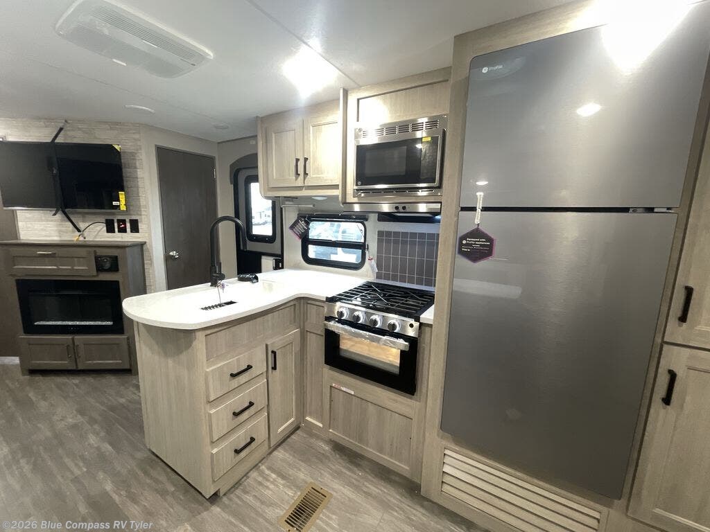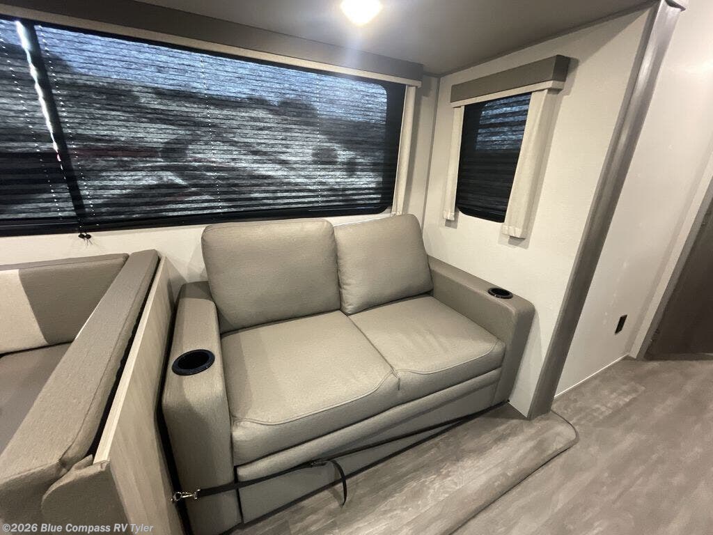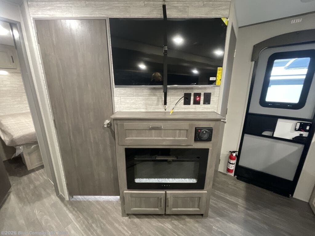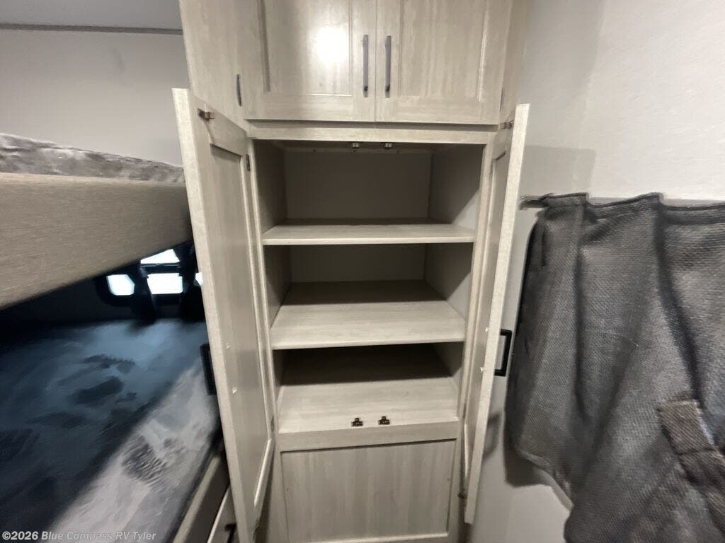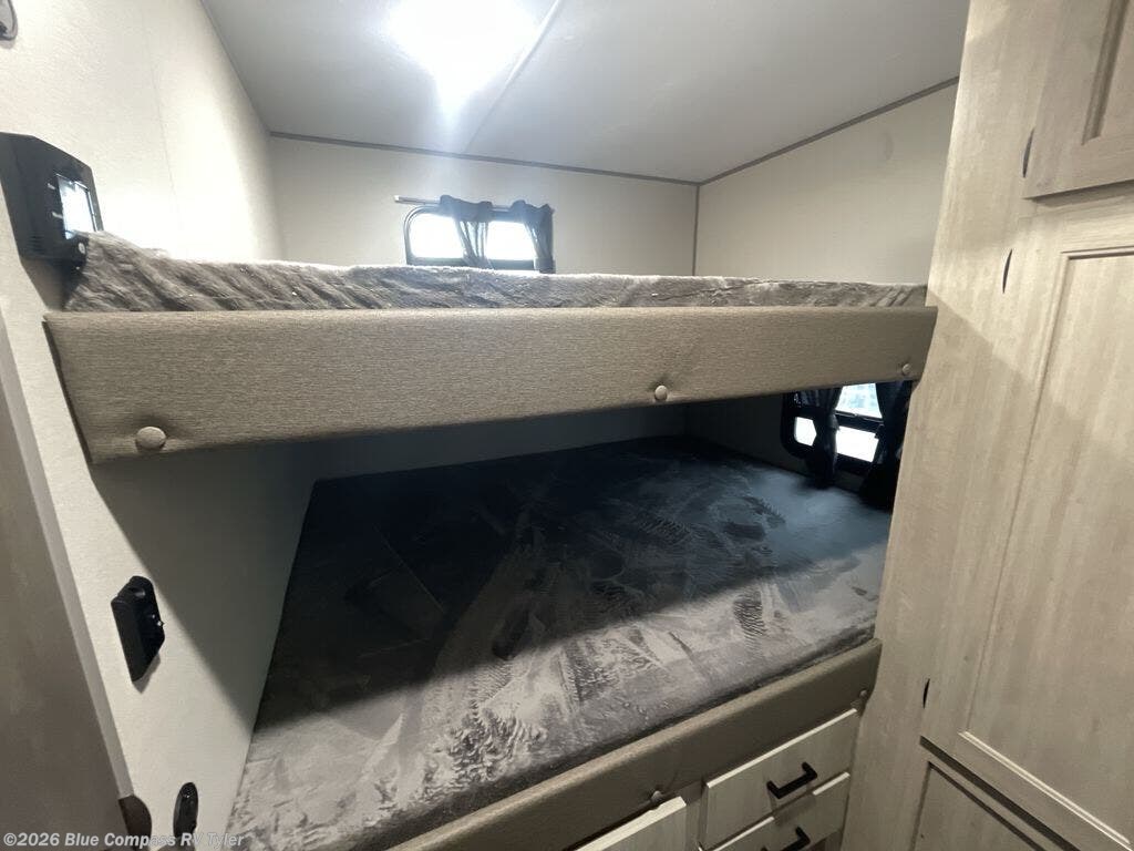 The rear private bunkhouse in this travel trailer is perfect for the kids or guests! It has a set of queen bunk beds with an underbed storage system and a linen closet. The dual entry bathroom is convenient for all to access it and has a 34" x 34" radius shower with a skylight above for natural lighting as you get ready. The chef can prepare their best meals with the three-burner cooktop and everyone can enjoy them at the U-shaped dinette. The trundle sofa is across from the entertainment center with an optional fireplace to add for extra comfort. The front private bedroom has a 60" x 74" queen bed to lay your head on at night and wardrobes on either side of it to keep your clothes out of the way and looking their best, plus an entrance into the dual entry bathroom!