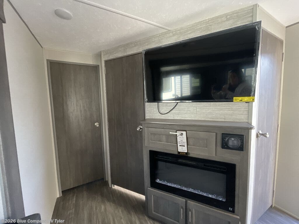 The rear private bunkhouse in this travel trailer is perfect for the kids or guests! It has a set of queen bunk beds with an underbed storage system and a linen closet. The dual entry bathroom is convenient for all to access it and has a 34" x 34" radius shower with a skylight above for natural lighting as you get ready. The chef can prepare their best meals with the three-burner cooktop and everyone can enjoy them at the U-shaped dinette. The trundle sofa is across from the entertainment center with an optional fireplace to add for extra comfort. The front private bedroom has a 60" x 74" queen bed to lay your head on at night and wardrobes on either side of it to keep your clothes out of the way and looking their best, plus an entrance into the dual entry bathroom!