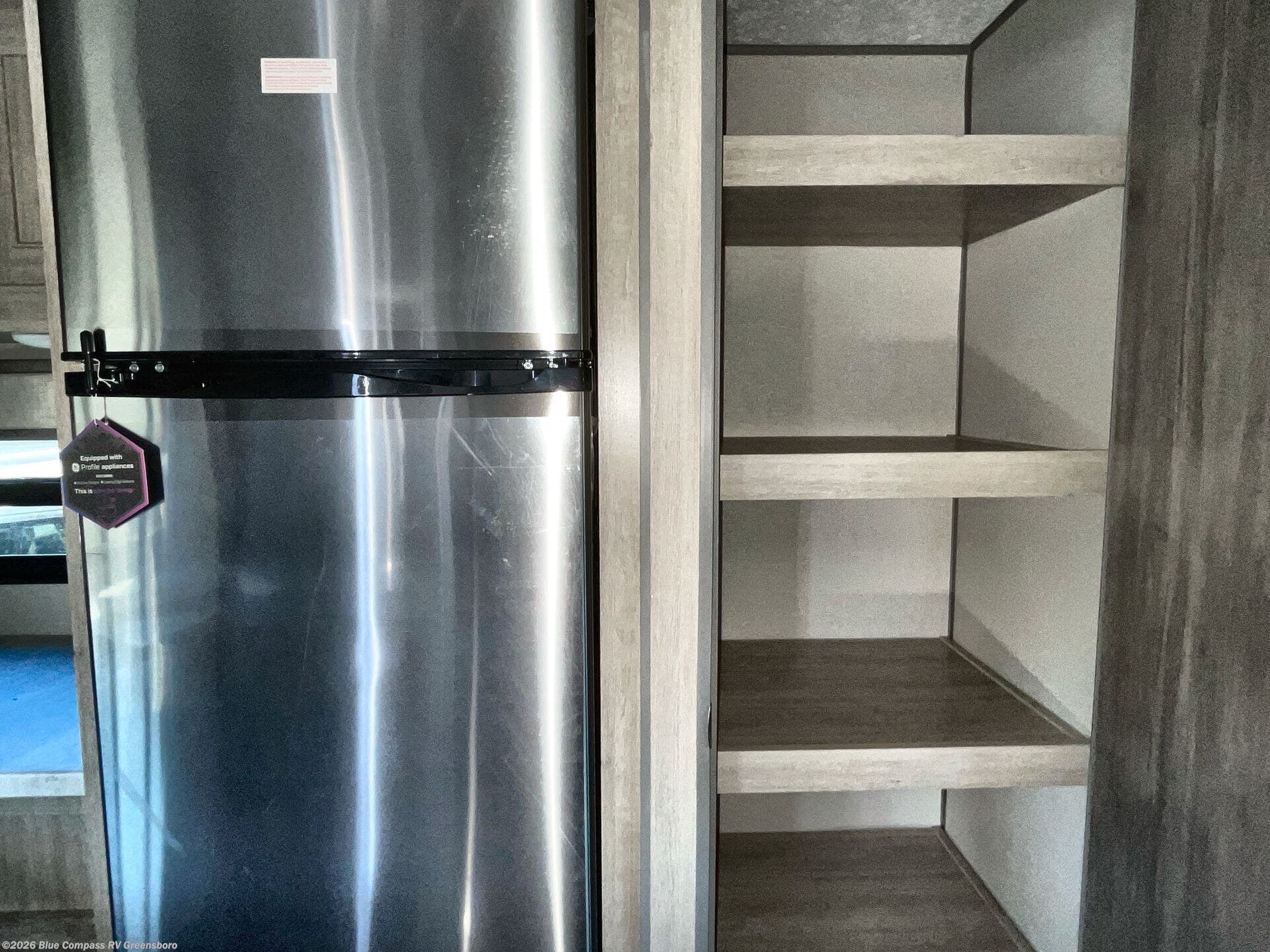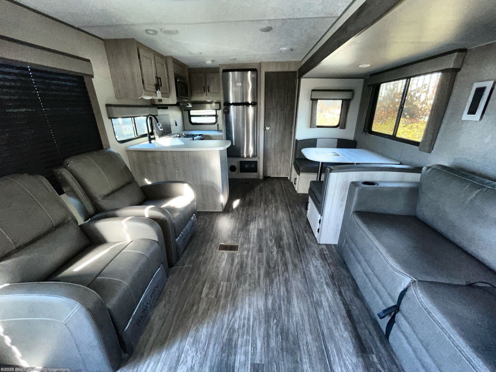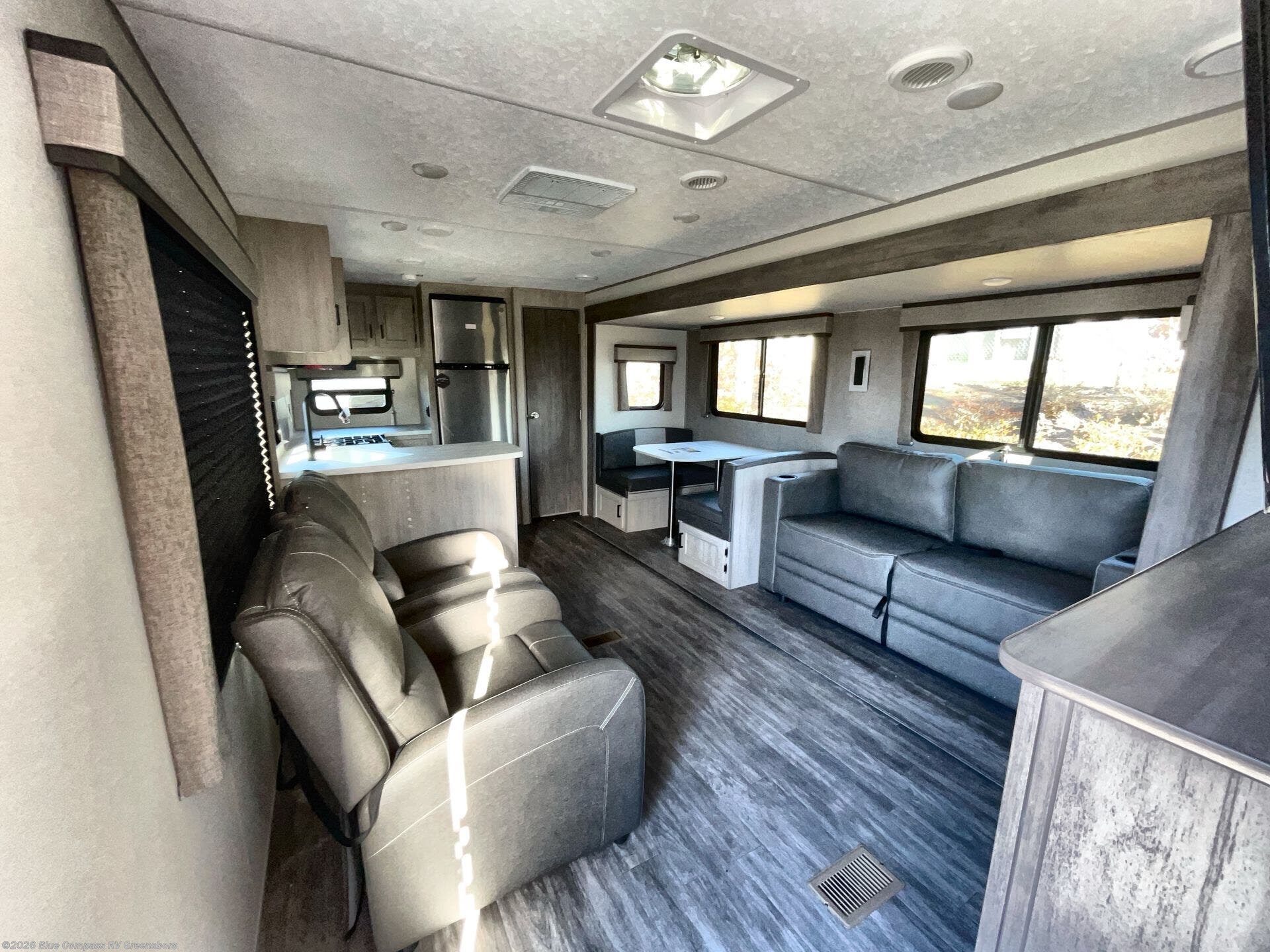The chef will love cooking in the rear kitchen of this travel trailer! You will feel right at home in the front private bedroom with the 60" x 74" queen bed slide across from a dresser and a front closet that has an area prepped for an optional washer and dryer. There is an optional fireplace and entertainment center in the living area in by the two recliners and the 68" trundle sofa next to the booth dinette. Stay clean and fresh with the 36" x 30" shower pan with a skylight above for natural lighting as you get ready in the full bathroom. The 21' electric awning has multicolor lights for you to choose your favorite color as you enjoy a refreshing beverage from the mini fridge!