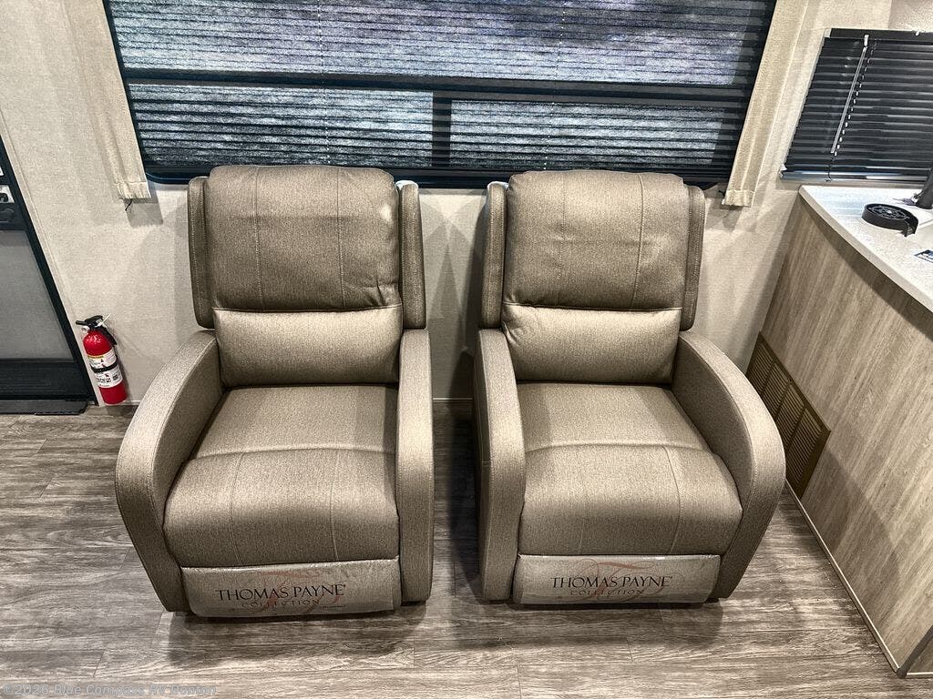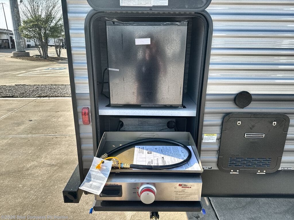 The chef will love cooking in the rear kitchen of this travel trailer! You will feel right at home in the front private bedroom with the 60" x 74" queen bed slide across from a dresser and a front closet that has an area prepped for an optional washer and dryer. There is an optional fireplace and entertainment center in the living area in by the two recliners and the 68" trundle sofa next to the booth dinette. Stay clean and fresh with the 36" x 30" shower pan with a skylight above for natural lighting as you get ready in the full bathroom. The 21' electric awning has multicolor lights for you to choose your favorite color as you enjoy a refreshing beverage from the mini fridge!