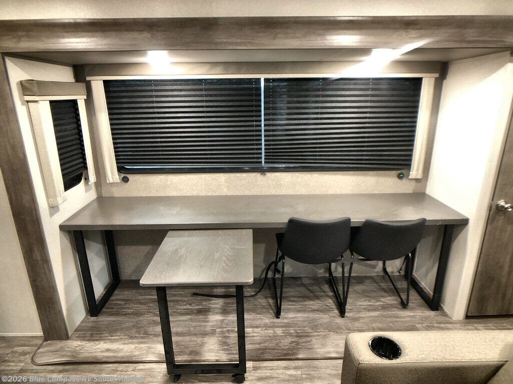 This travel trailer is perfect for those who enjoy comfort at the campground! The rear kitchen lets you make meals each day, and there is an island for additional counter space, plus a large pantry for snacks and dry goods. The sliding desk/table provides a versatile space to dine or get some work done, and the L-shaped sectional sofa gives you place to relax in the evenings. There is also an entertainment center with a TV so you can watch your favorite shows! A full bath on board means you won't have to leave your camper in the middle of the night, and a 60" x 74" RV queen bed provides a comfy place to sleep each night. The large closet, wardrobe and dresser will be great to store your clothes and shoes, and there is a second closet with washer/dryer prep if you choose to add these appliances!