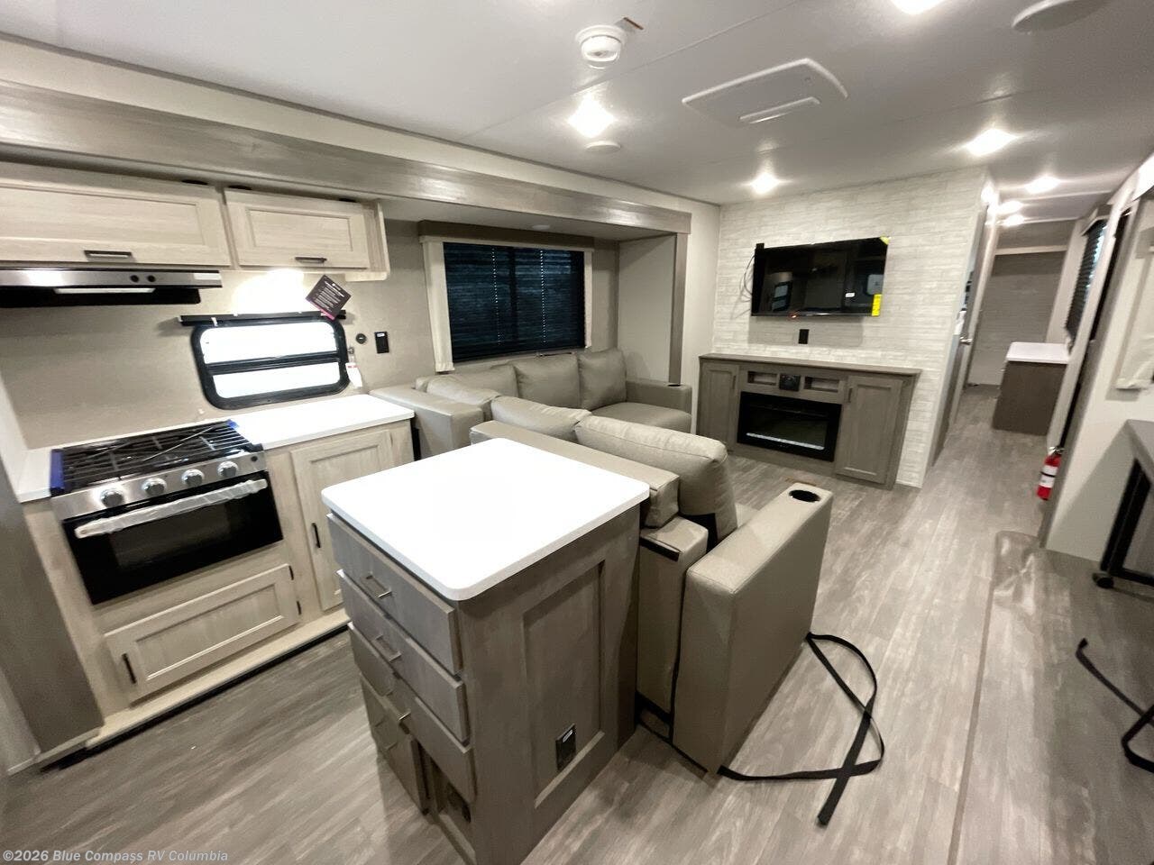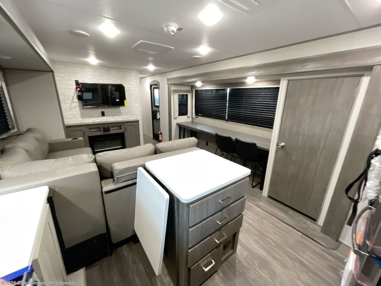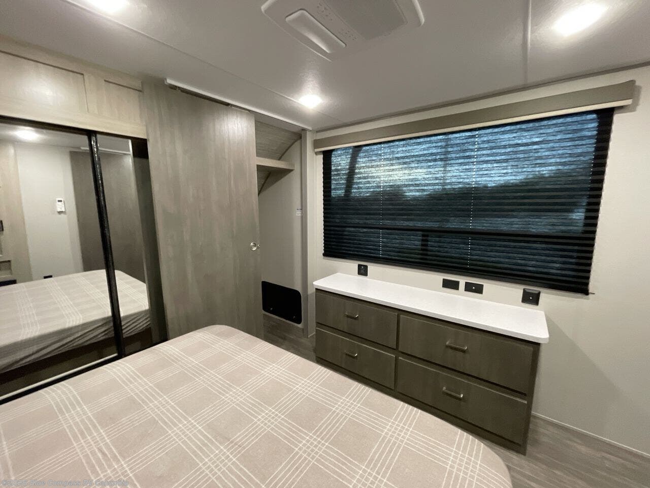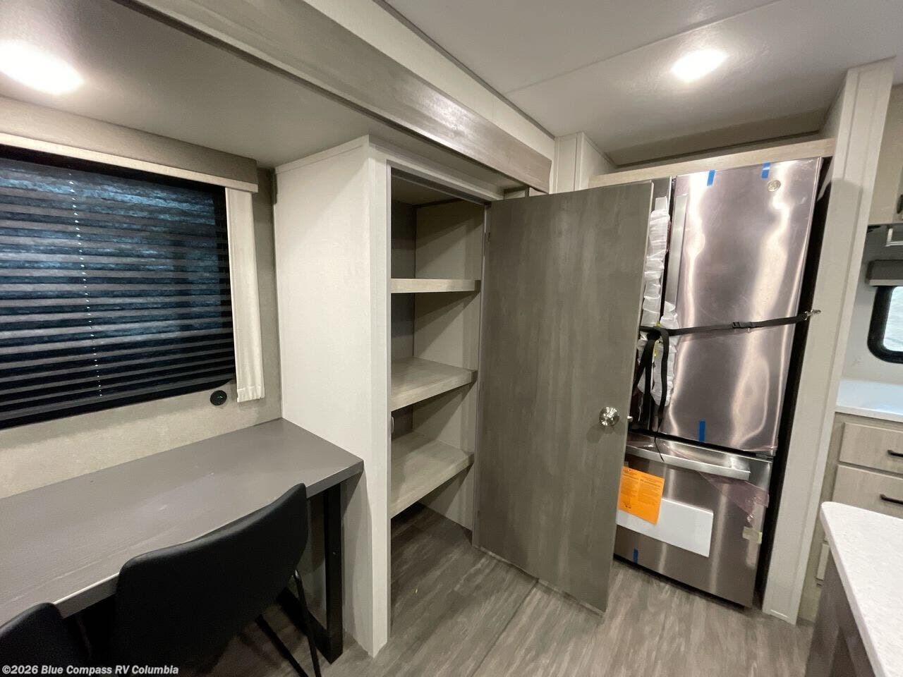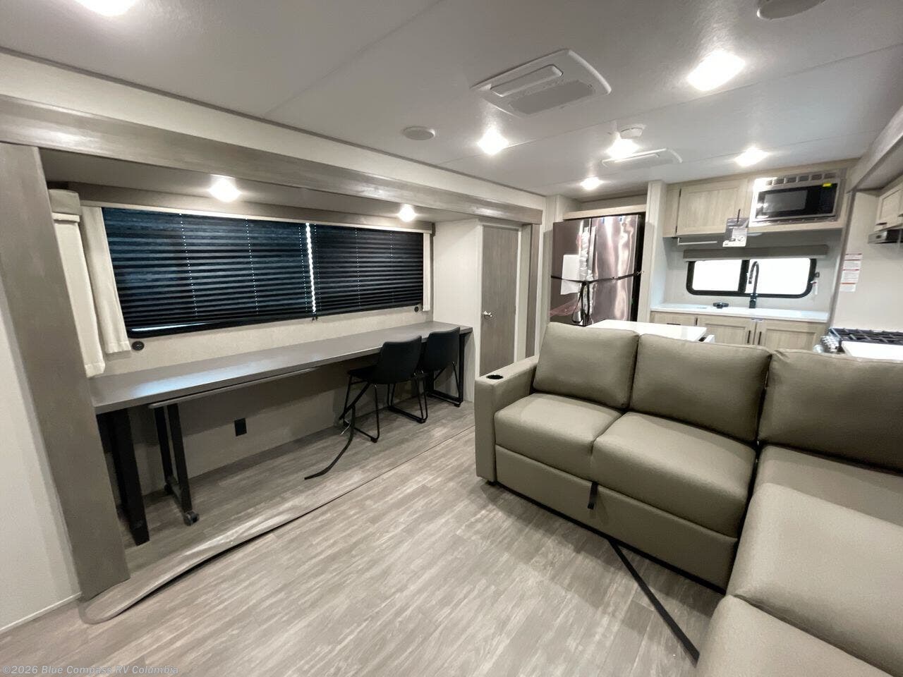 This travel trailer is perfect for those who enjoy comfort at the campground! The rear kitchen lets you make meals each day, and there is an island for additional counter space, plus a large pantry for snacks and dry goods. The sliding desk/table provides a versatile space to dine or get some work done, and the L-shaped sectional sofa gives you place to relax in the evenings. There is also an entertainment center with a TV so you can watch your favorite shows! A full bath on board means you won't have to leave your camper in the middle of the night, and a 60" x 74" RV queen bed provides a comfy place to sleep each night. The large closet, wardrobe and dresser will be great to store your clothes and shoes, and there is a second closet with washer/dryer prep if you choose to add these appliances!
