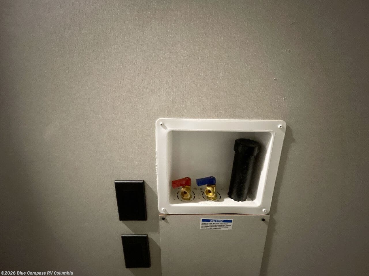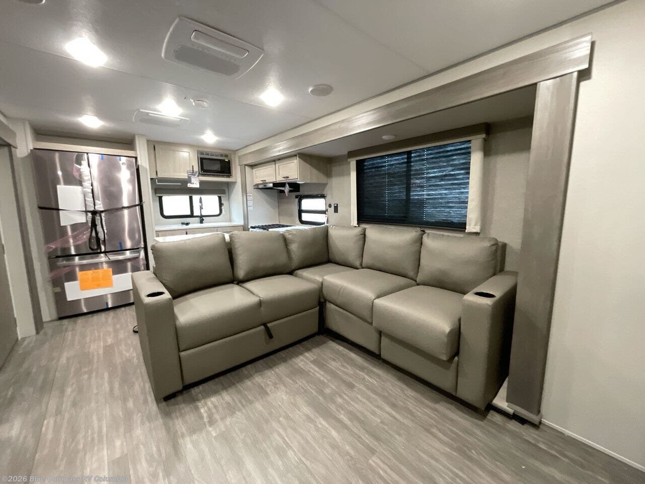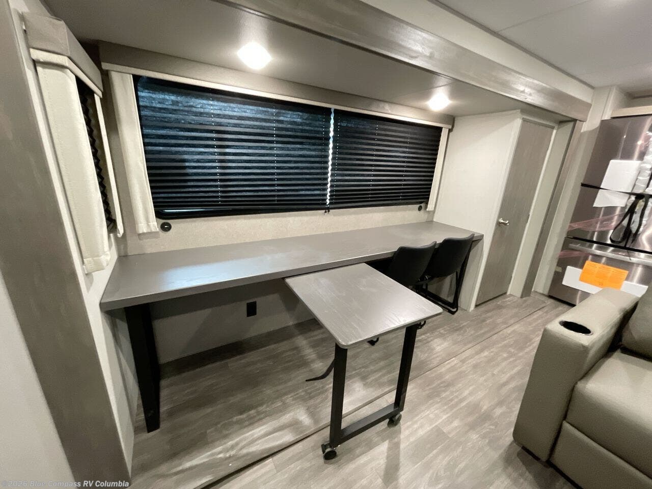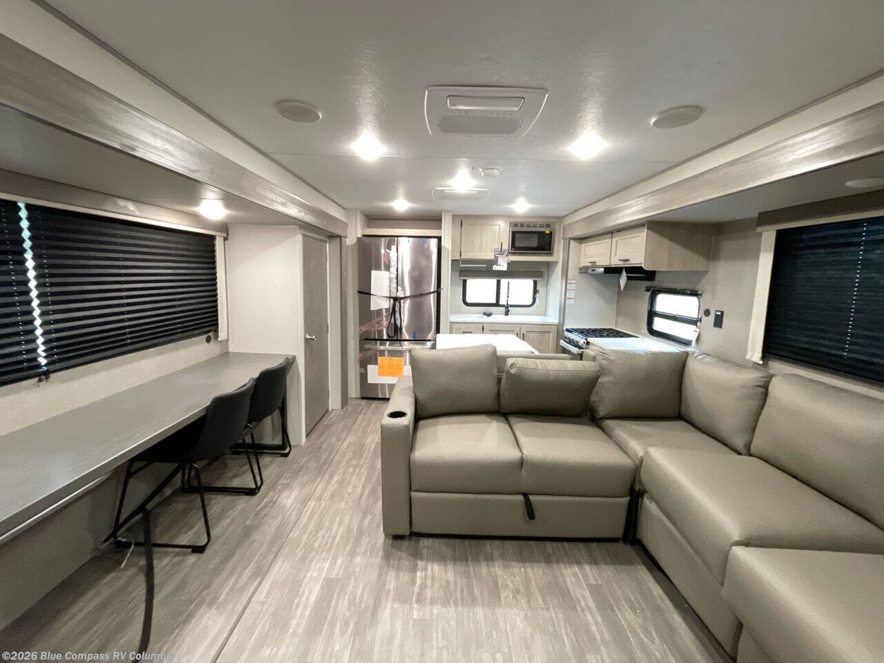 This travel trailer is perfect for those who enjoy comfort at the campground! The rear kitchen lets you make meals each day, and there is an island for additional counter space, plus a large pantry for snacks and dry goods. The sliding desk/table provides a versatile space to dine or get some work done, and the L-shaped sectional sofa gives you place to relax in the evenings. There is also an entertainment center with a TV so you can watch your favorite shows! A full bath on board means you won't have to leave your camper in the middle of the night, and a 60" x 74" RV queen bed provides a comfy place to sleep each night. The large closet, wardrobe and dresser will be great to store your clothes and shoes, and there is a second closet with washer/dryer prep if you choose to add these appliances!
