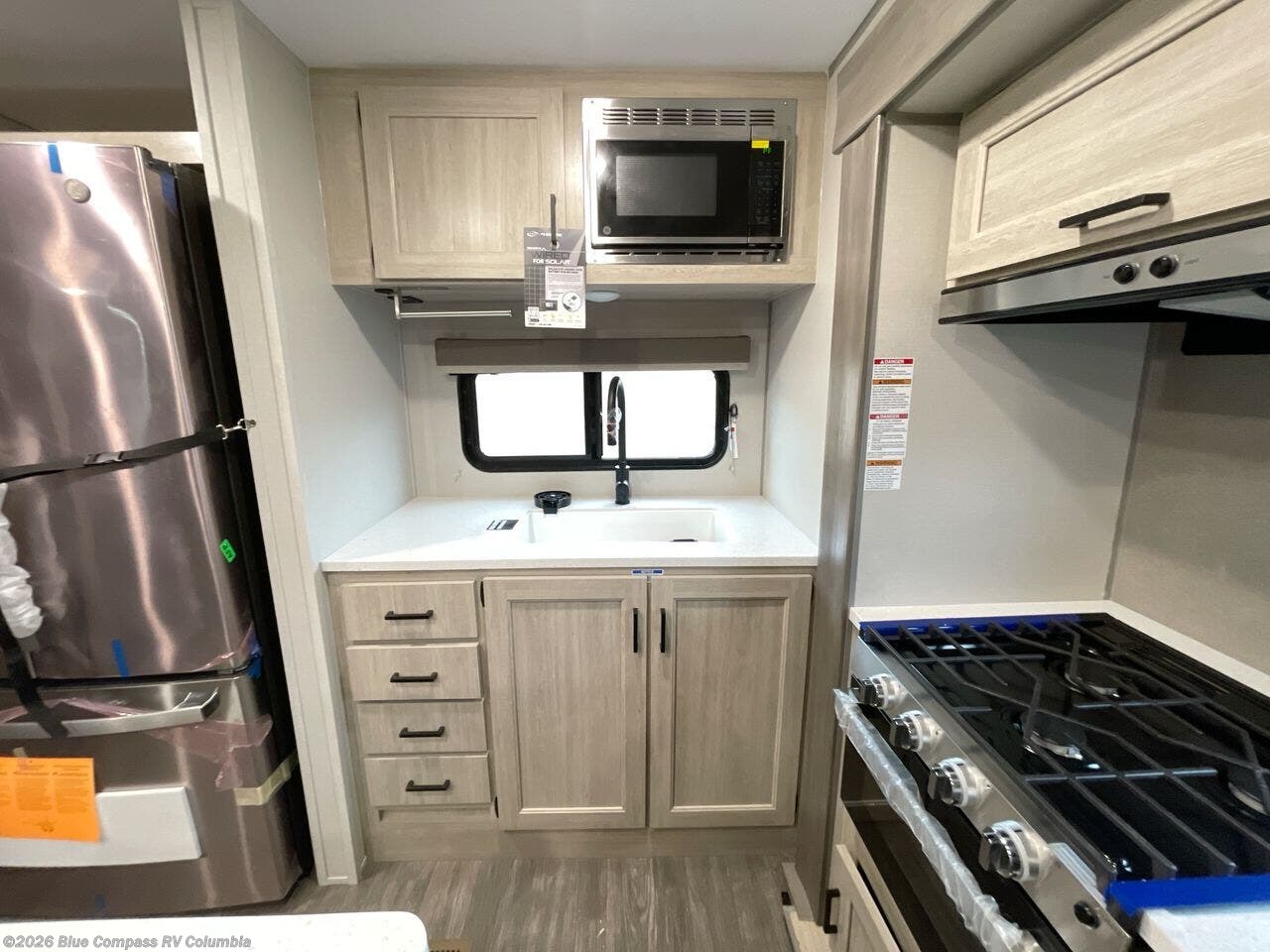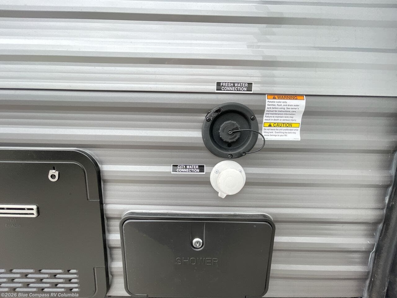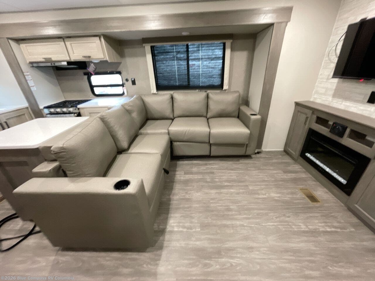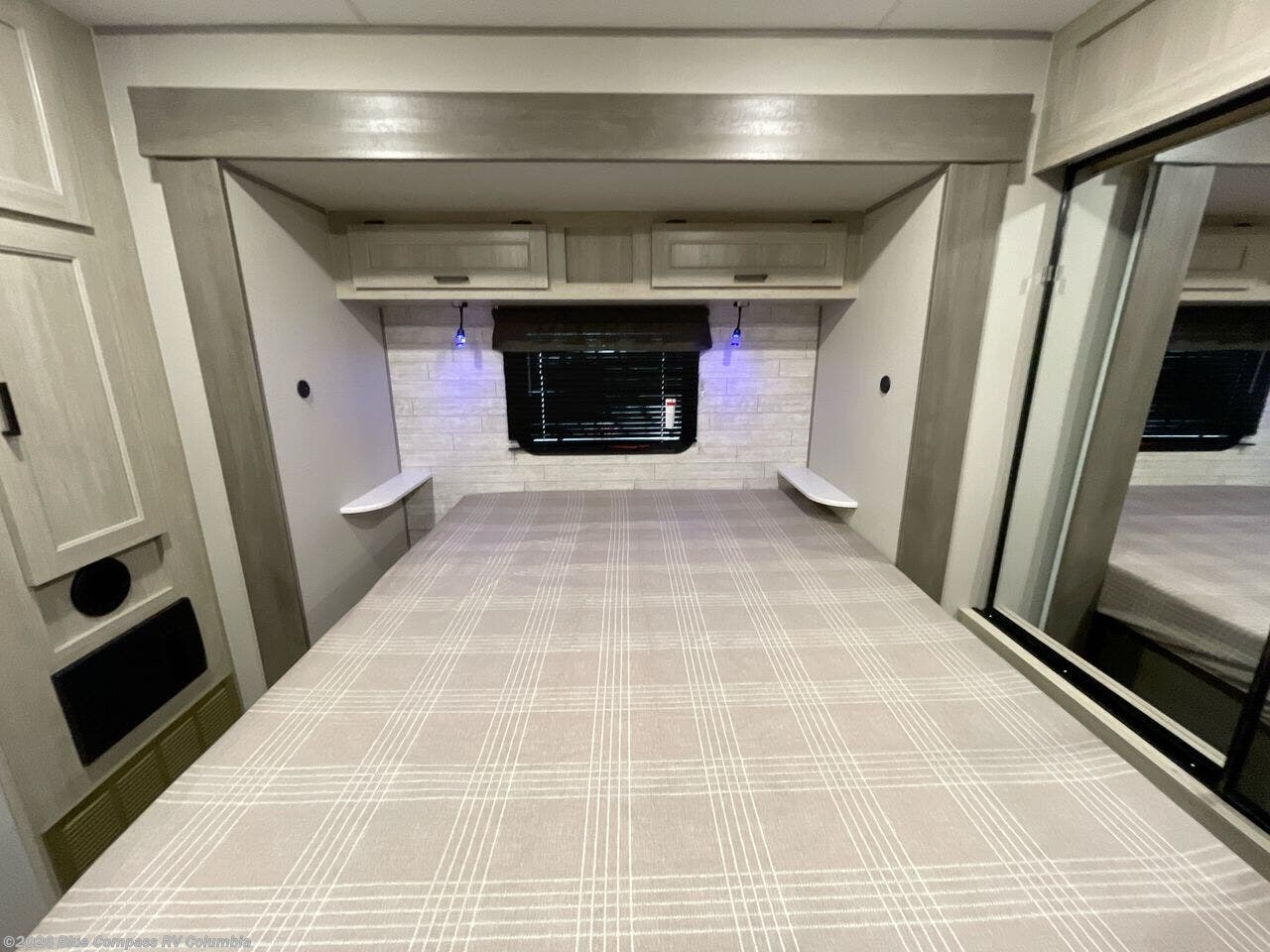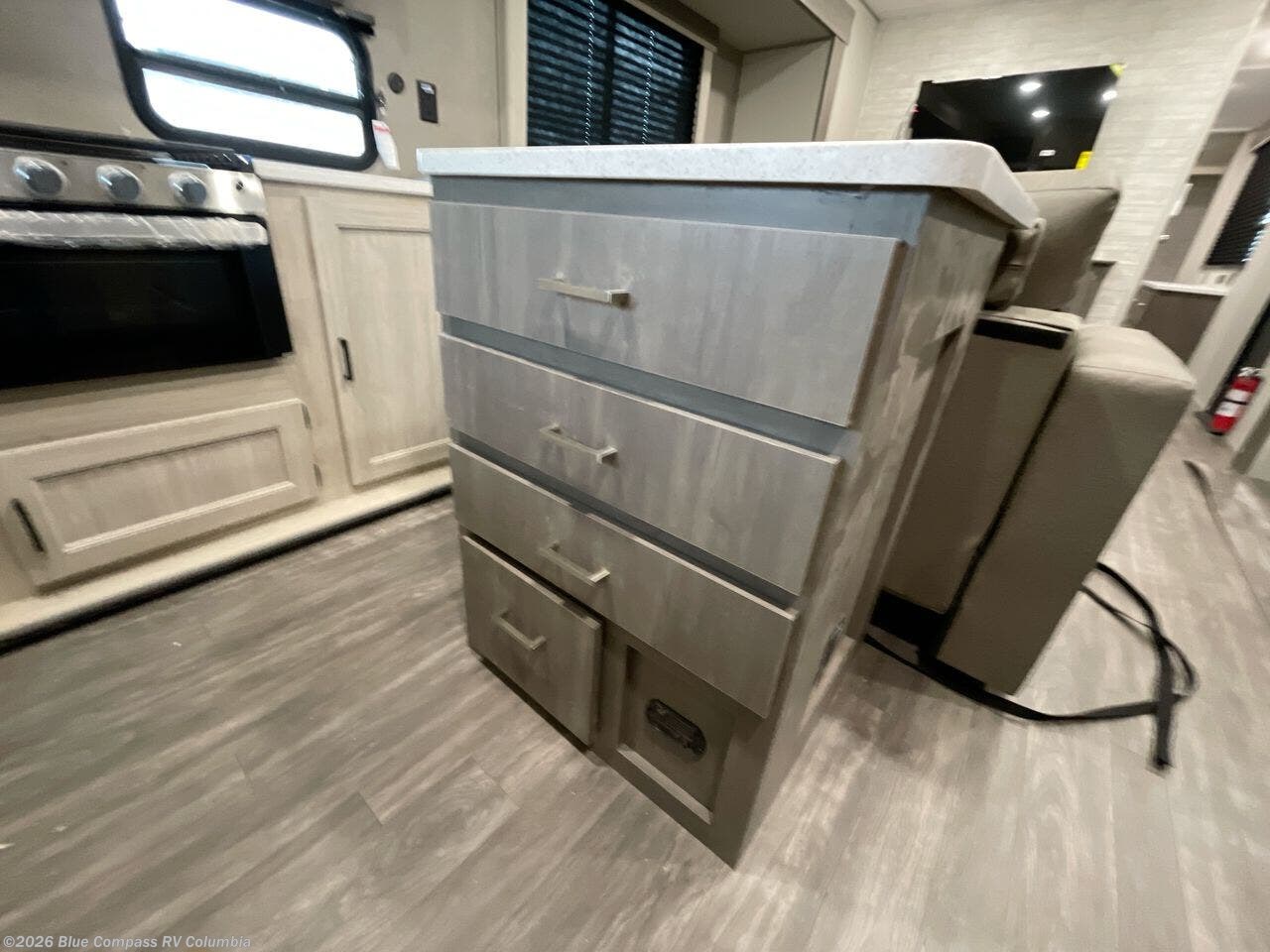 This travel trailer is perfect for those who enjoy comfort at the campground! The rear kitchen lets you make meals each day, and there is an island for additional counter space, plus a large pantry for snacks and dry goods. The sliding desk/table provides a versatile space to dine or get some work done, and the L-shaped sectional sofa gives you place to relax in the evenings. There is also an entertainment center with a TV so you can watch your favorite shows! A full bath on board means you won't have to leave your camper in the middle of the night, and a 60" x 74" RV queen bed provides a comfy place to sleep each night. The large closet, wardrobe and dresser will be great to store your clothes and shoes, and there is a second closet with washer/dryer prep if you choose to add these appliances!