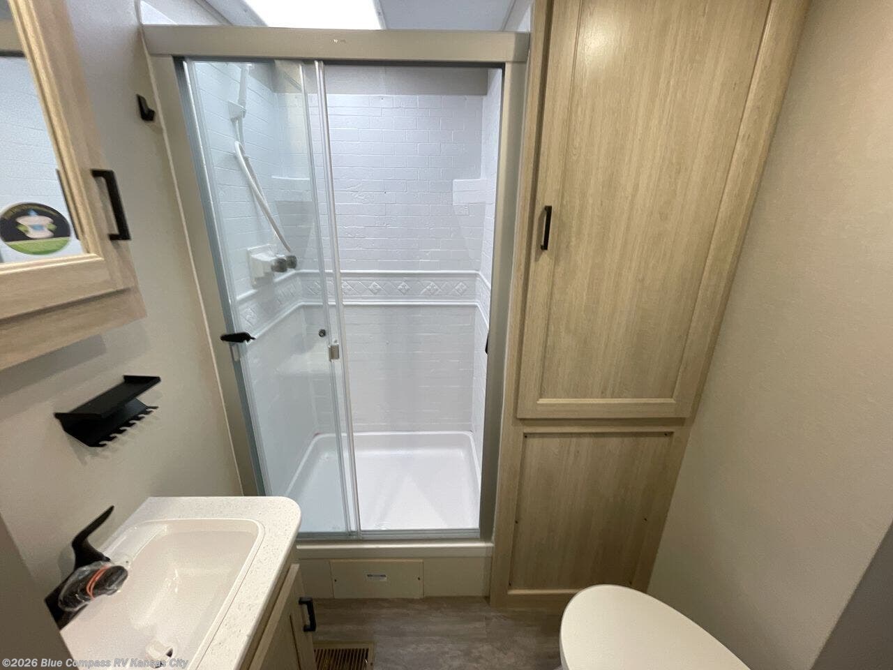This travel trailer is perfect for those who enjoy comfort at the campground! The rear kitchen lets you make meals each day, and there is an island for additional counter space, plus a large pantry for snacks and dry goods. The sliding desk/table provides a versatile space to dine or get some work done, and the L-shaped sectional sofa gives you place to relax in the evenings. There is also an entertainment center with a TV so you can watch your favorite shows! A full bath on board means you won't have to leave your camper in the middle of the night, and a 60" x 74" RV queen bed provides a comfy place to sleep each night. The large closet, wardrobe and dresser will be great to store your clothes and shoes, and there is a second closet with washer/dryer prep if you choose to add these appliances!