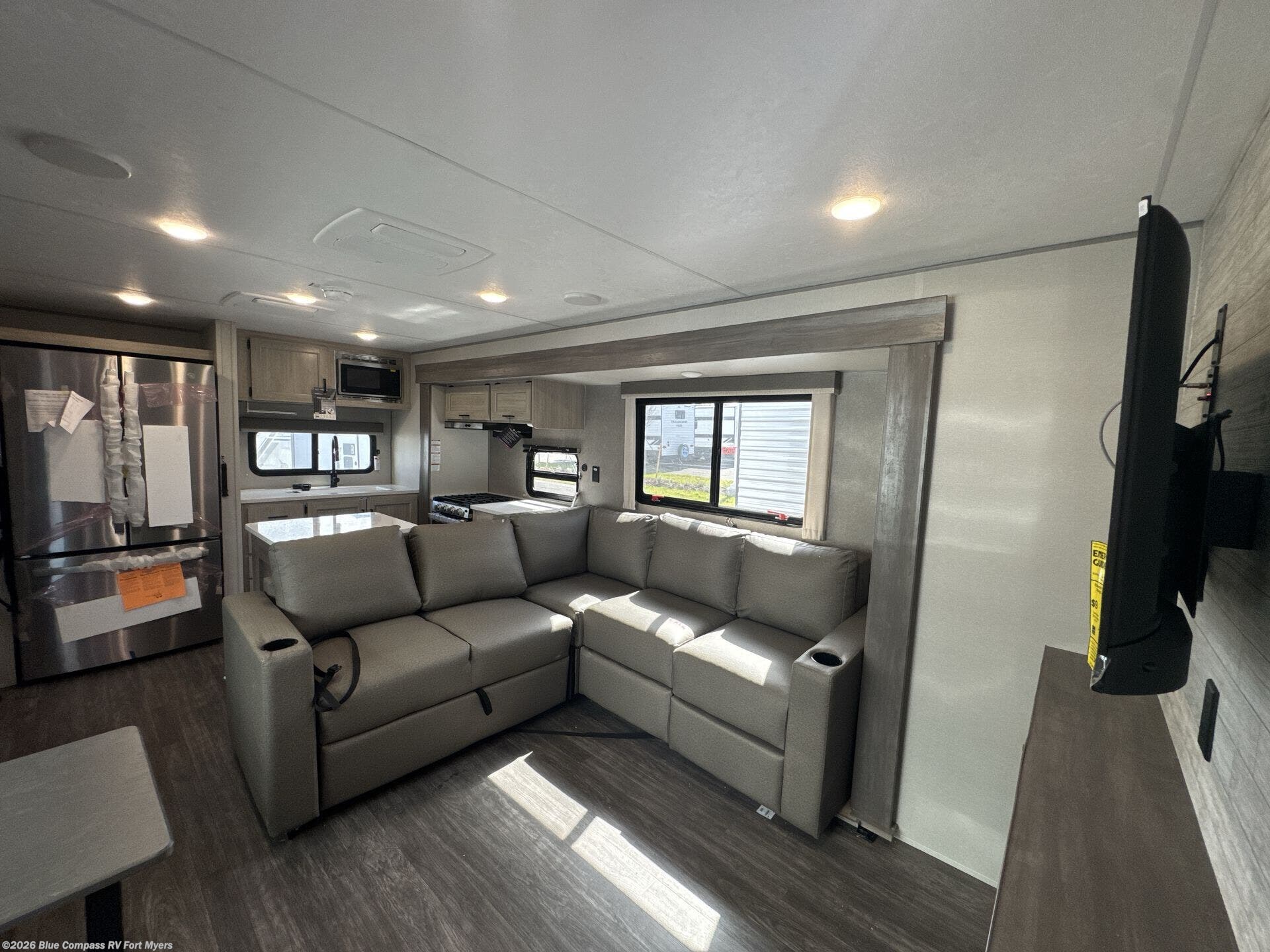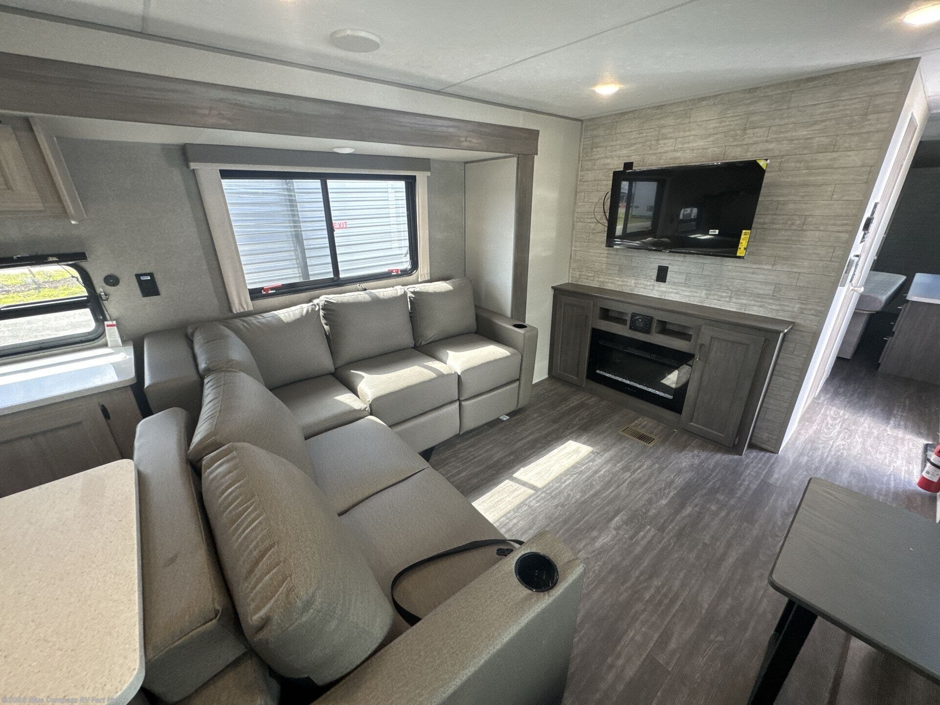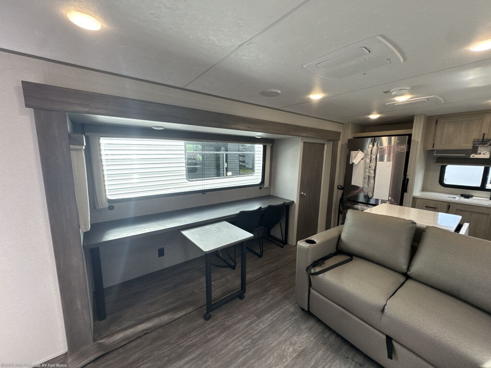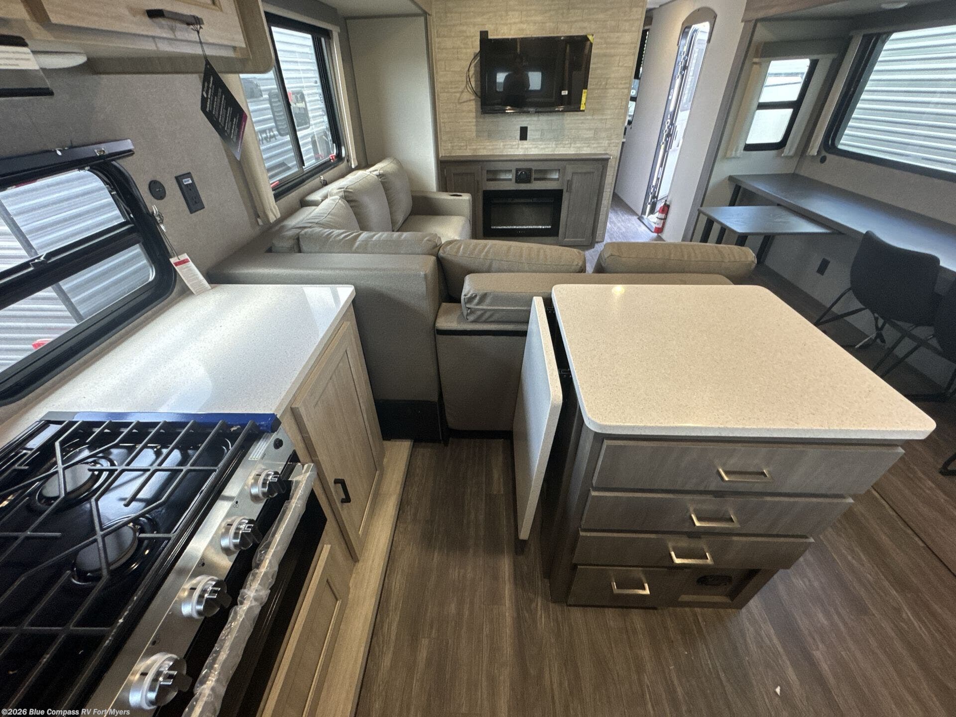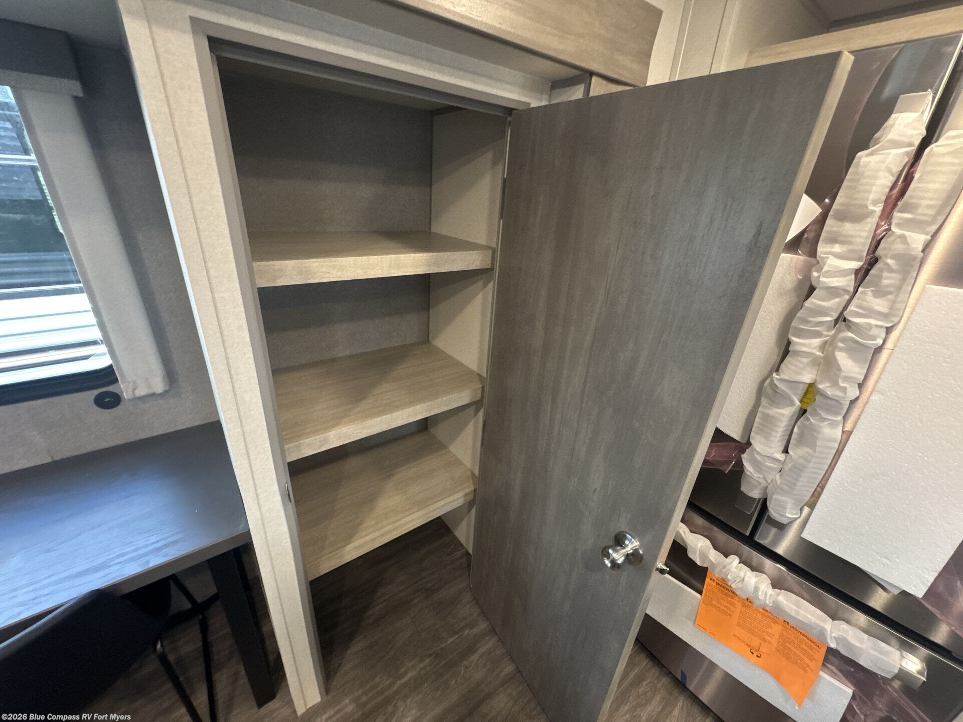 This travel trailer is perfect for those who enjoy comfort at the campground! The rear kitchen lets you make meals each day, and there is an island for additional counter space, plus a large pantry for snacks and dry goods. The sliding desk/table provides a versatile space to dine or get some work done, and the L-shaped sectional sofa gives you place to relax in the evenings. There is also an entertainment center with a TV so you can watch your favorite shows! A full bath on board means you won't have to leave your camper in the middle of the night, and a 60" x 74" RV queen bed provides a comfy place to sleep each night. The large closet, wardrobe and dresser will be great to store your clothes and shoes, and there is a second closet with washer/dryer prep if you choose to add these appliances!