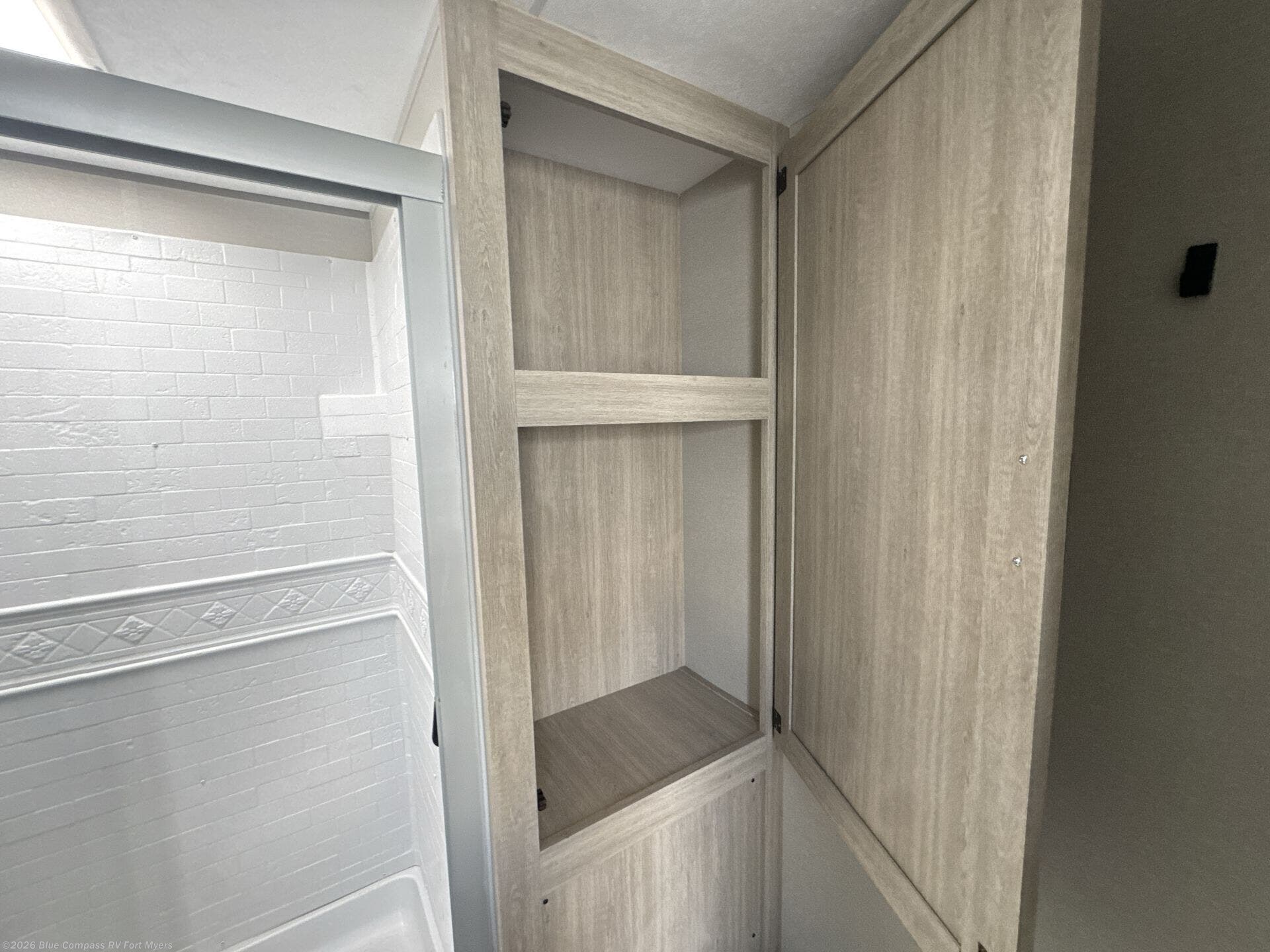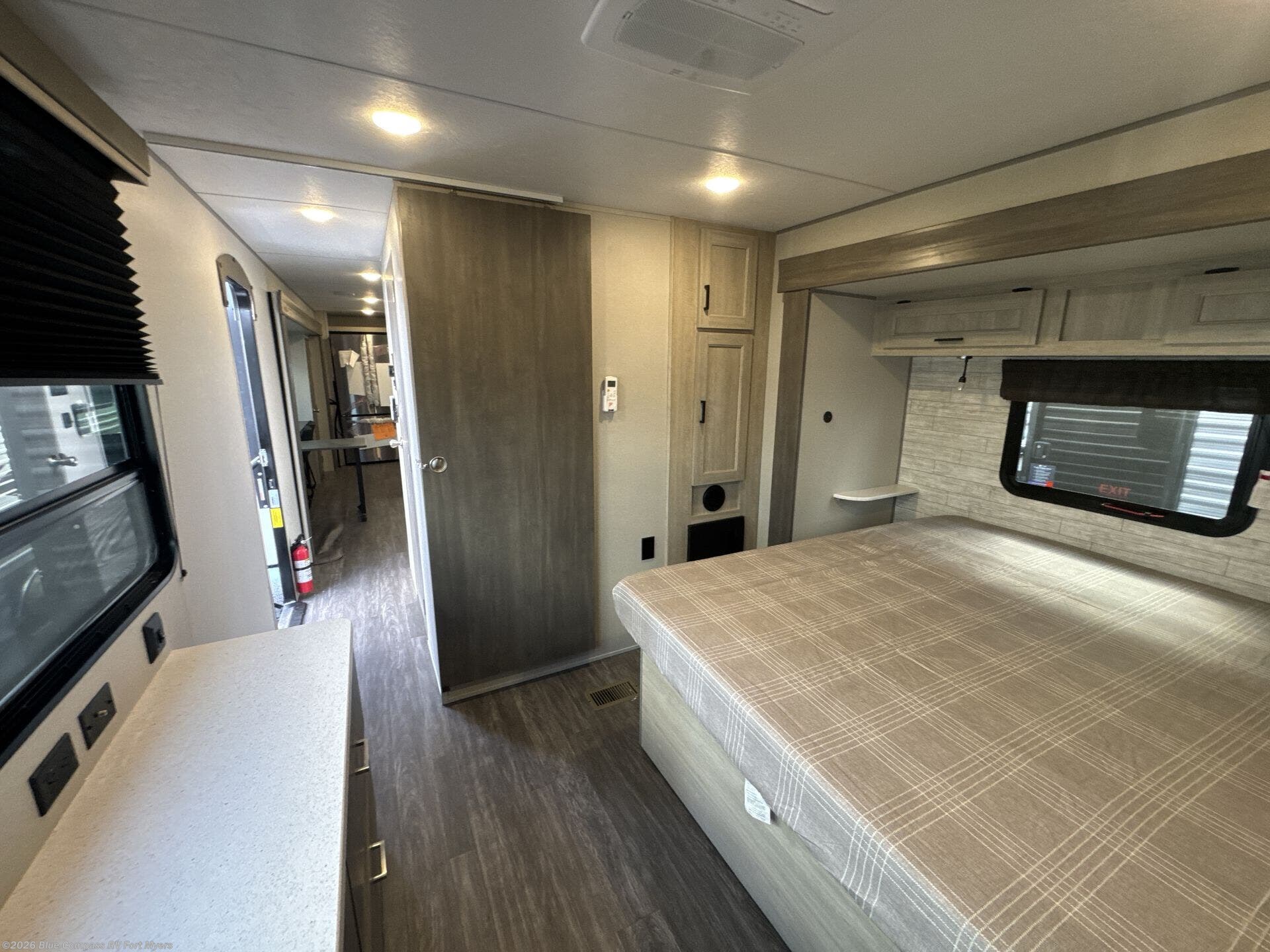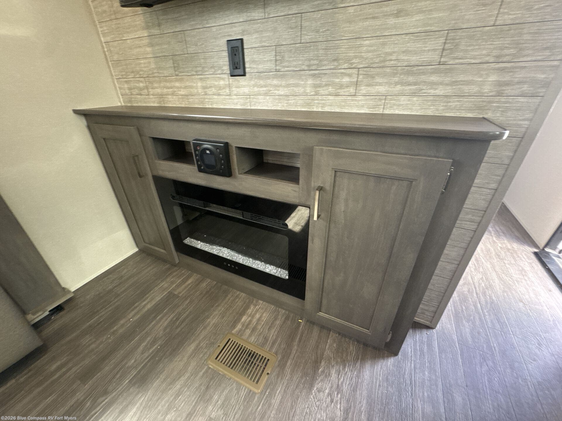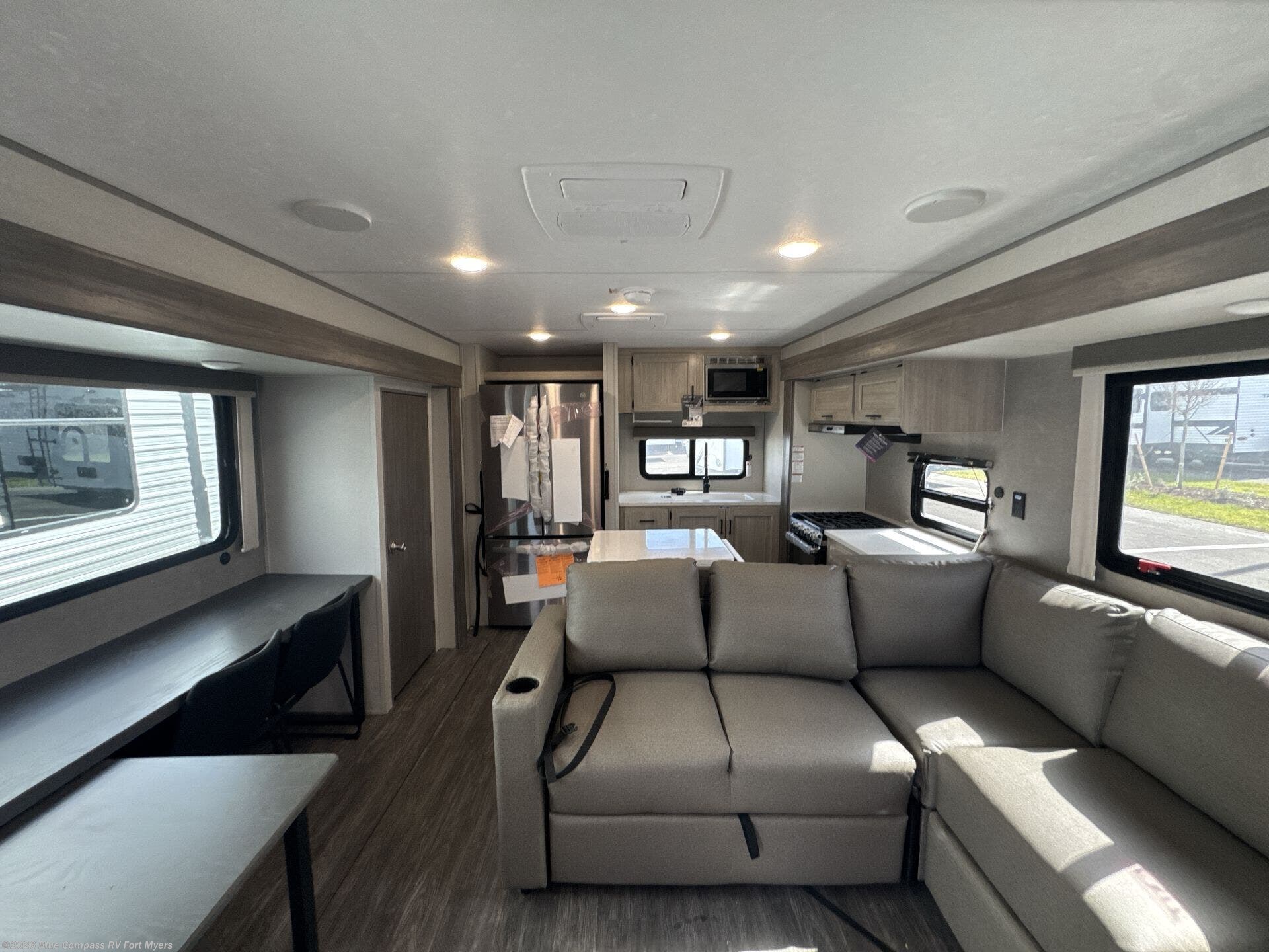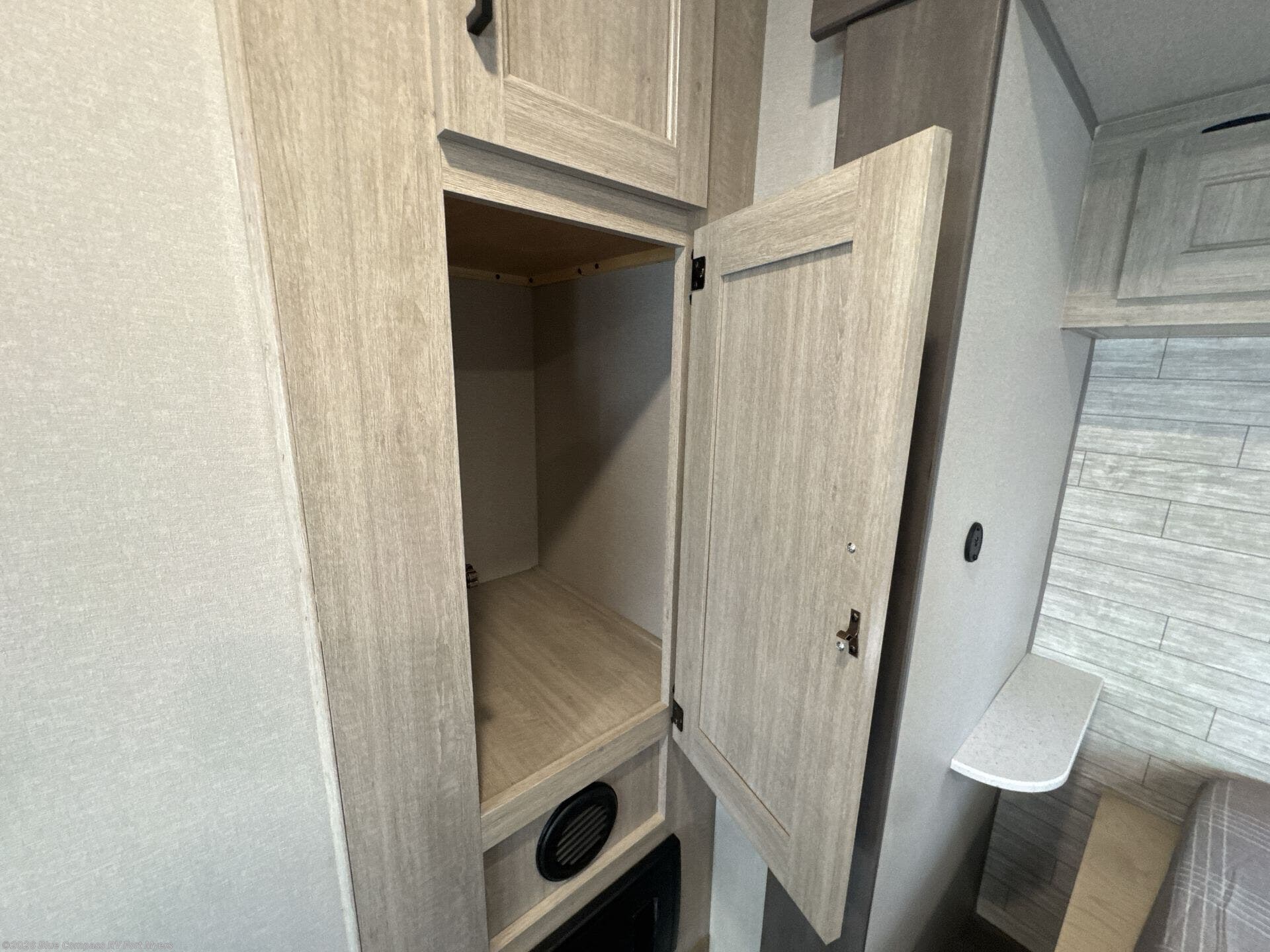 This travel trailer is perfect for those who enjoy comfort at the campground! The rear kitchen lets you make meals each day, and there is an island for additional counter space, plus a large pantry for snacks and dry goods. The sliding desk/table provides a versatile space to dine or get some work done, and the L-shaped sectional sofa gives you place to relax in the evenings. There is also an entertainment center with a TV so you can watch your favorite shows! A full bath on board means you won't have to leave your camper in the middle of the night, and a 60" x 74" RV queen bed provides a comfy place to sleep each night. The large closet, wardrobe and dresser will be great to store your clothes and shoes, and there is a second closet with washer/dryer prep if you choose to add these appliances!