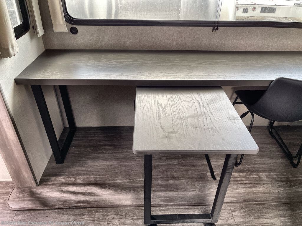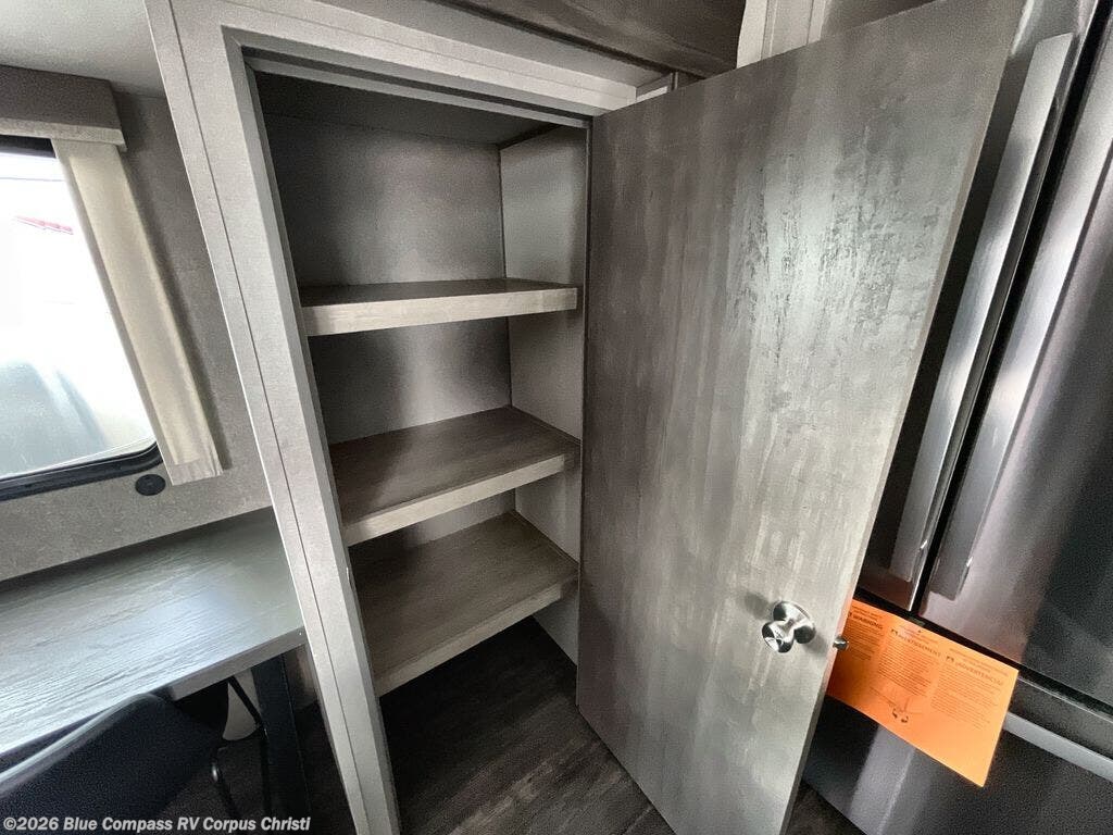 This travel trailer is perfect for those who enjoy comfort at the campground! The rear kitchen lets you make meals each day, and there is an island for additional counter space, plus a large pantry for snacks and dry goods. The sliding desk/table provides a versatile space to dine or get some work done, and the L-shaped sectional sofa gives you place to relax in the evenings. There is also an entertainment center with a TV so you can watch your favorite shows! A full bath on board means you won't have to leave your camper in the middle of the night, and a 60" x 74" RV queen bed provides a comfy place to sleep each night. The large closet, wardrobe and dresser will be great to store your clothes and shoes, and there is a second closet with washer/dryer prep if you choose to add these appliances!