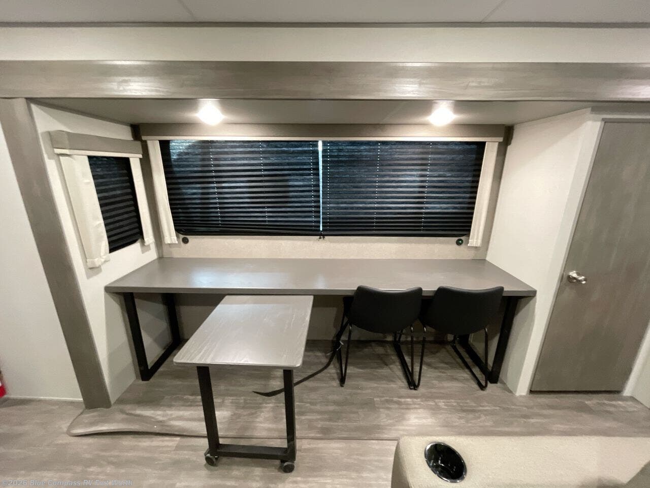 This travel trailer is perfect for those who enjoy comfort at the campground! The rear kitchen lets you make meals each day, and there is an island for additional counter space, plus a large pantry for snacks and dry goods. The sliding desk/table provides a versatile space to dine or get some work done, and the L-shaped sectional sofa gives you place to relax in the evenings. There is also an entertainment center with a TV so you can watch your favorite shows! A full bath on board means you won't have to leave your camper in the middle of the night, and a 60" x 74" RV queen bed provides a comfy place to sleep each night. The large closet, wardrobe and dresser will be great to store your clothes and shoes, and there is a second closet with washer/dryer prep if you choose to add these appliances!