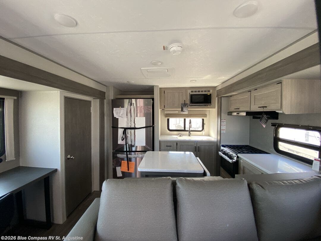 This travel trailer is perfect for those who enjoy comfort at the campground! The rear kitchen lets you make meals each day, and there is an island for additional counter space, plus a large pantry for snacks and dry goods. The sliding desk/table provides a versatile space to dine or get some work done, and the L-shaped sectional sofa gives you place to relax in the evenings. There is also an entertainment center with a TV so you can watch your favorite shows! A full bath on board means you won't have to leave your camper in the middle of the night, and a 60" x 74" RV queen bed provides a comfy place to sleep each night. The large closet, wardrobe and dresser will be great to store your clothes and shoes, and there is a second closet with washer/dryer prep if you choose to add these appliances!