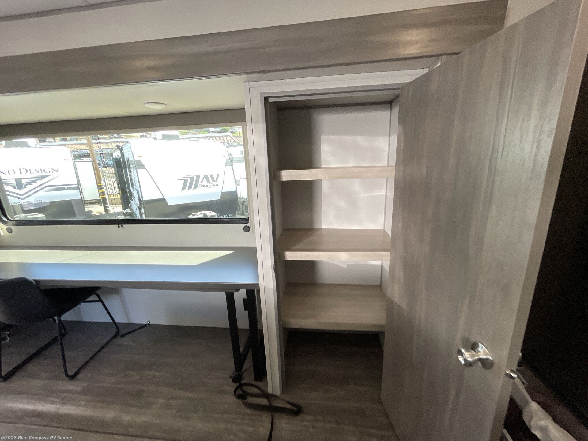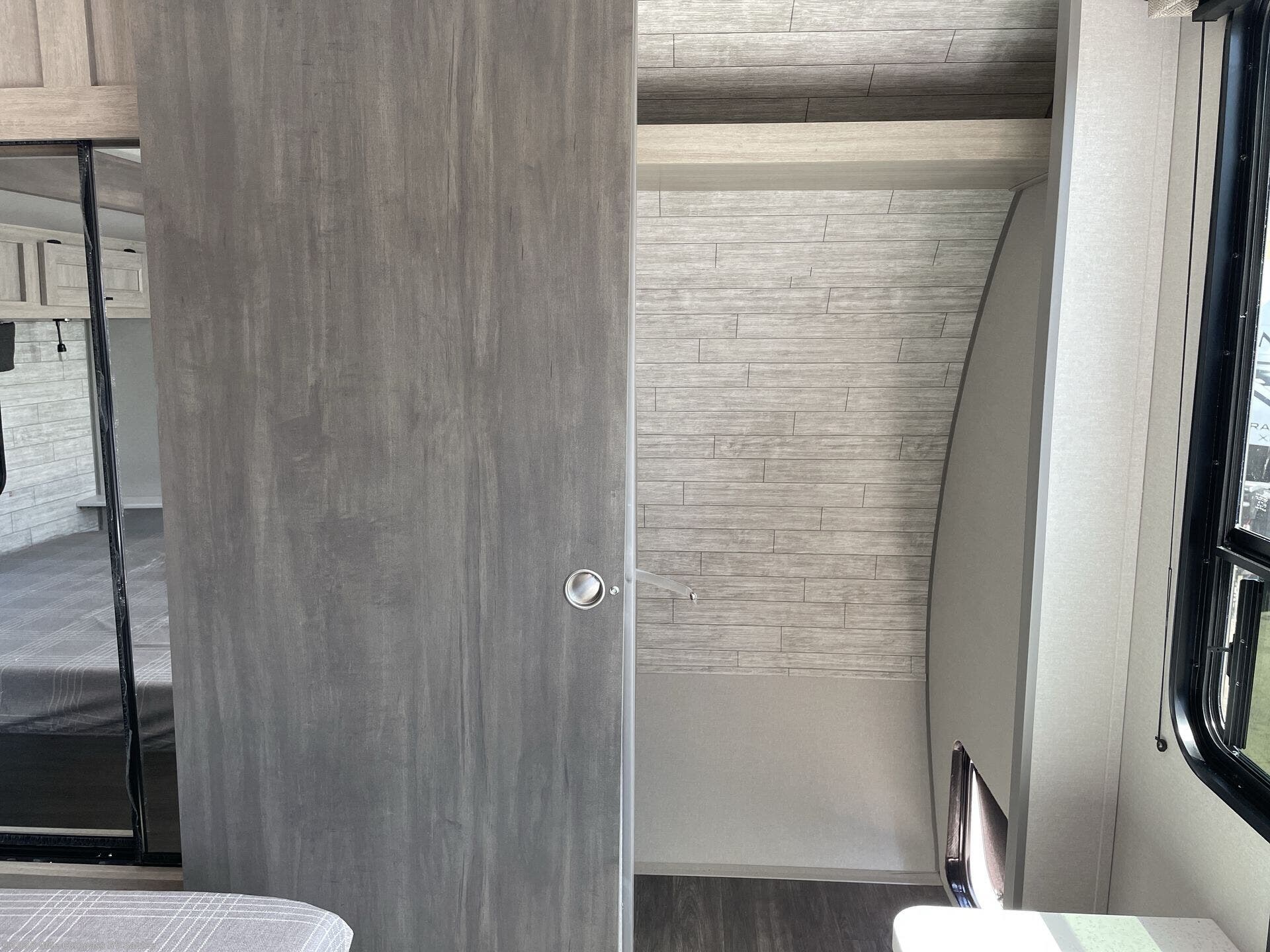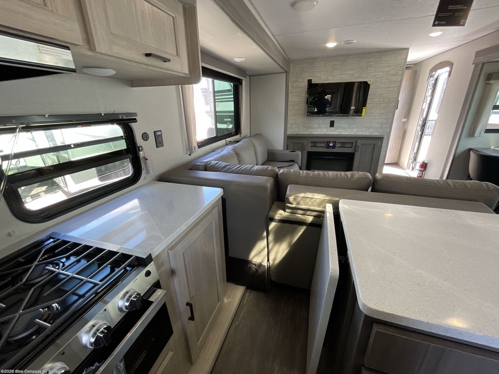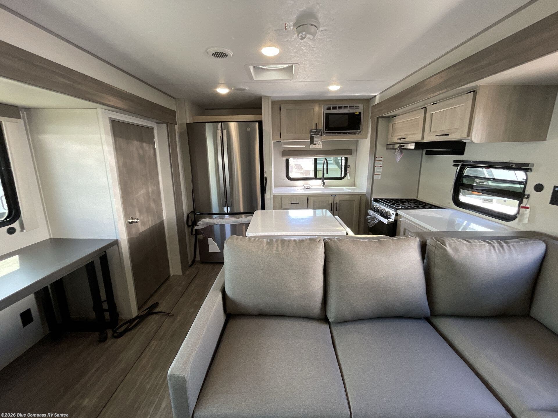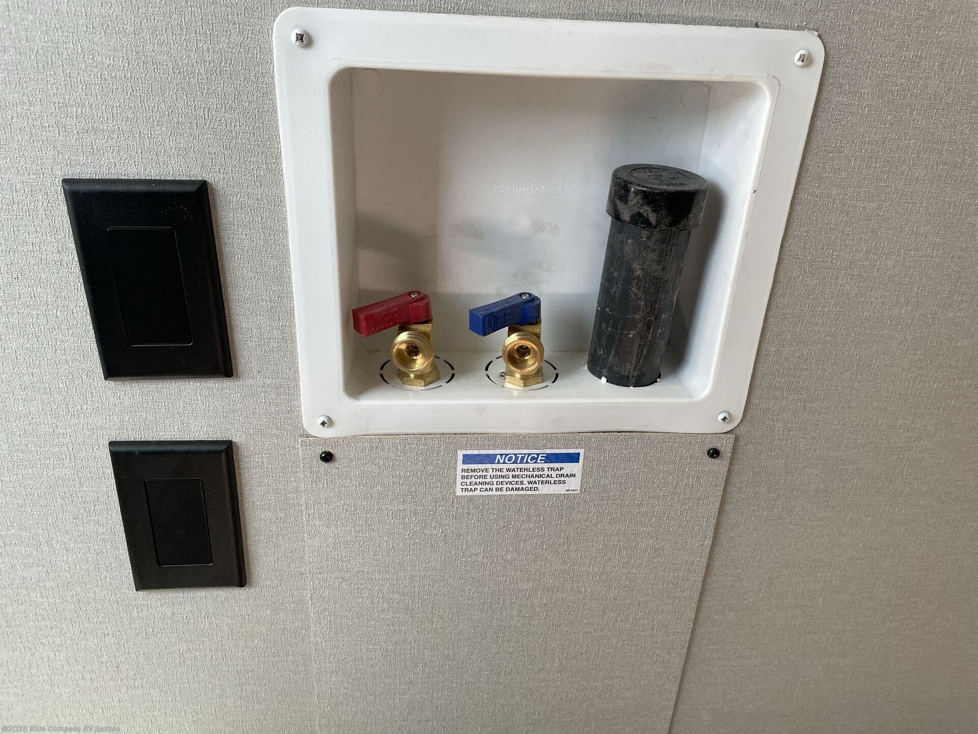This travel trailer is perfect for those who enjoy comfort at the campground! The rear kitchen lets you make meals each day, and there is an island for additional counter space, plus a large pantry for snacks and dry goods. The sliding desk/table provides a versatile space to dine or get some work done, and the L-shaped sectional sofa gives you place to relax in the evenings. There is also an entertainment center with a TV so you can watch your favorite shows! A full bath on board means you won't have to leave your camper in the middle of the night, and a 60" x 74" RV queen bed provides a comfy place to sleep each night. The large closet, wardrobe and dresser will be great to store your clothes and shoes, and there is a second closet with washer/dryer prep if you choose to add these appliances!