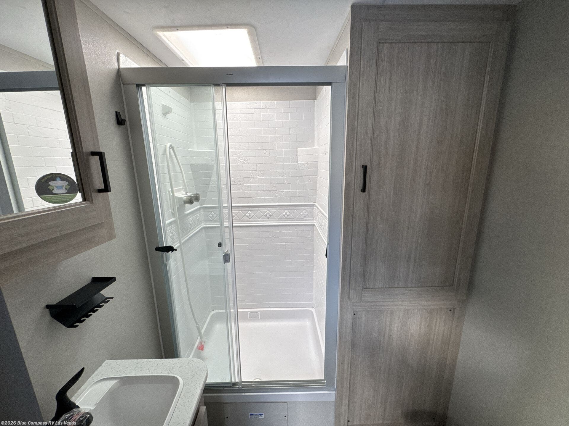 This travel trailer is perfect for those who enjoy comfort at the campground! The rear kitchen lets you make meals each day, and there is an island for additional counter space, plus a large pantry for snacks and dry goods. The sliding desk/table provides a versatile space to dine or get some work done, and the L-shaped sectional sofa gives you place to relax in the evenings. There is also an entertainment center with a TV so you can watch your favorite shows! A full bath on board means you won't have to leave your camper in the middle of the night, and a 60" x 74" RV queen bed provides a comfy place to sleep each night. The large closet, wardrobe and dresser will be great to store your clothes and shoes, and there is a second closet with washer/dryer prep if you choose to add these appliances!