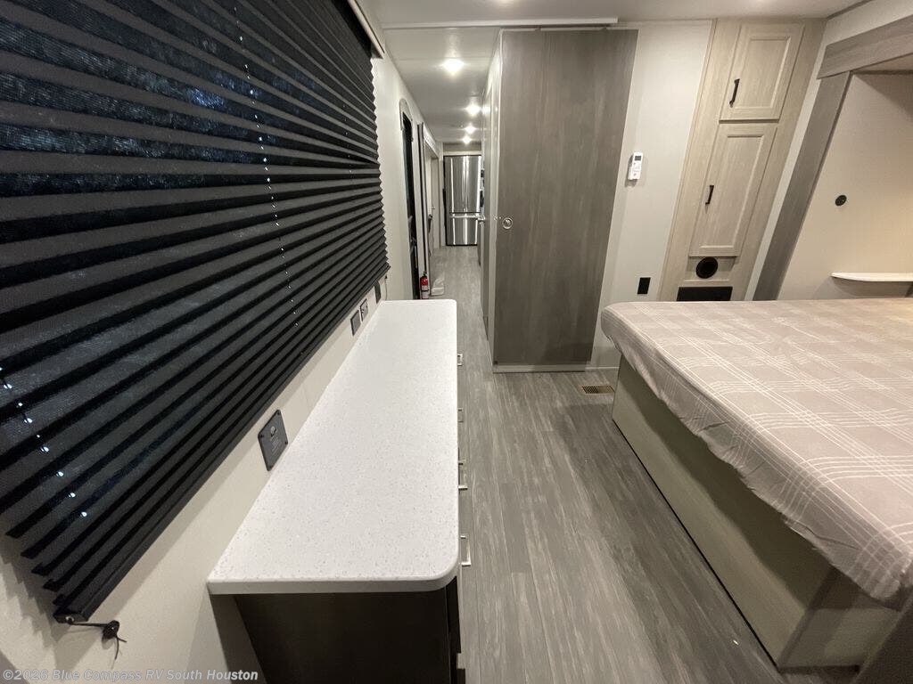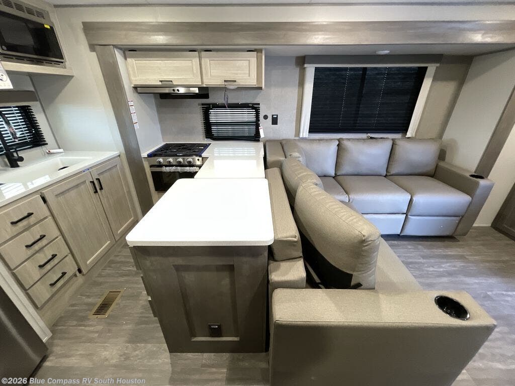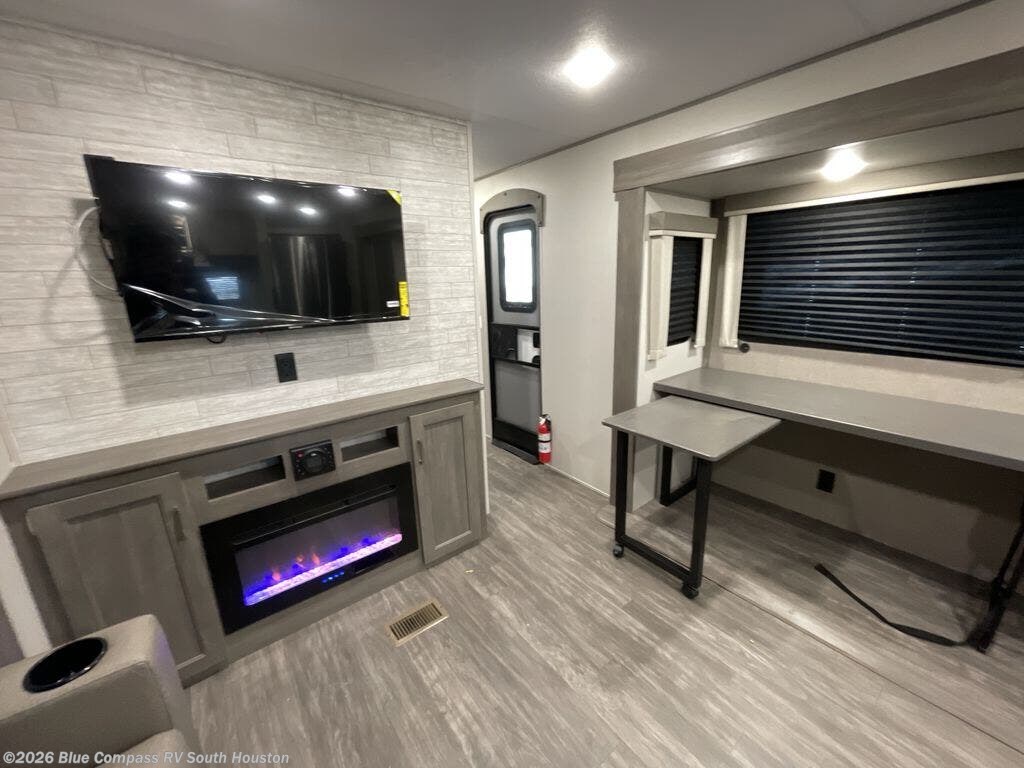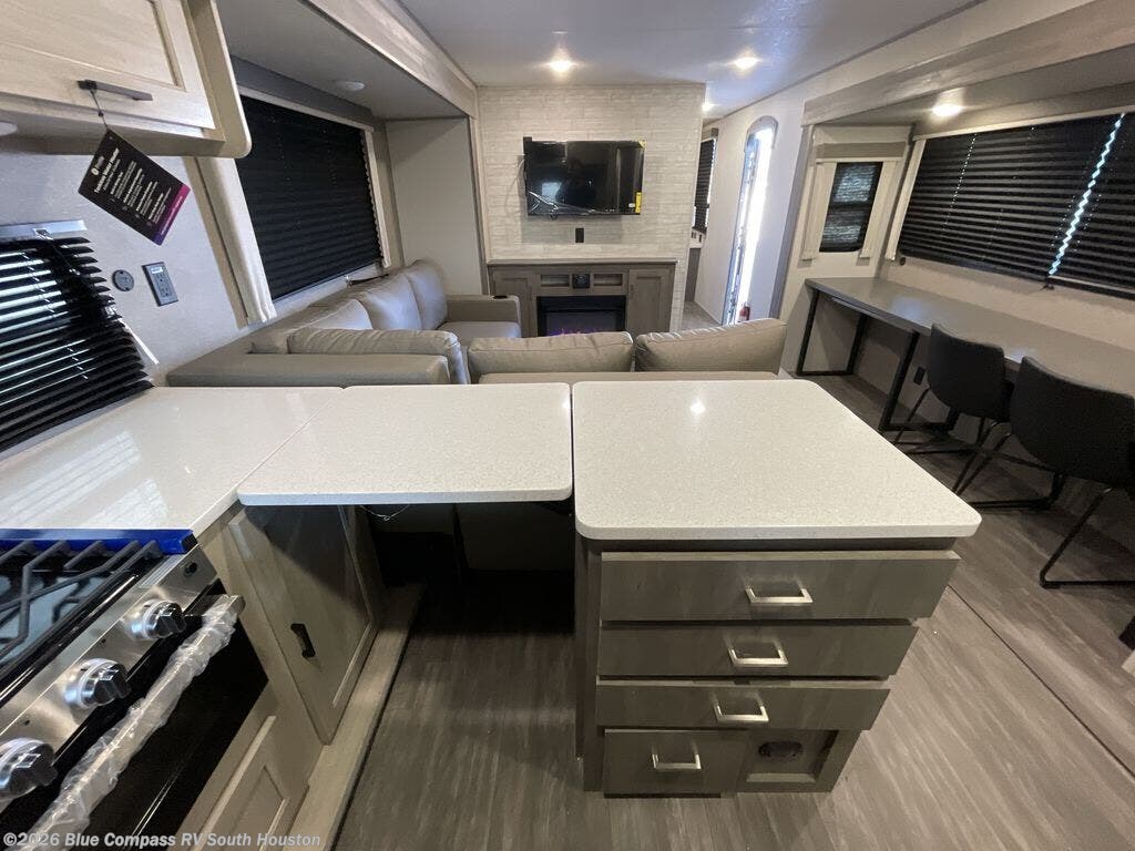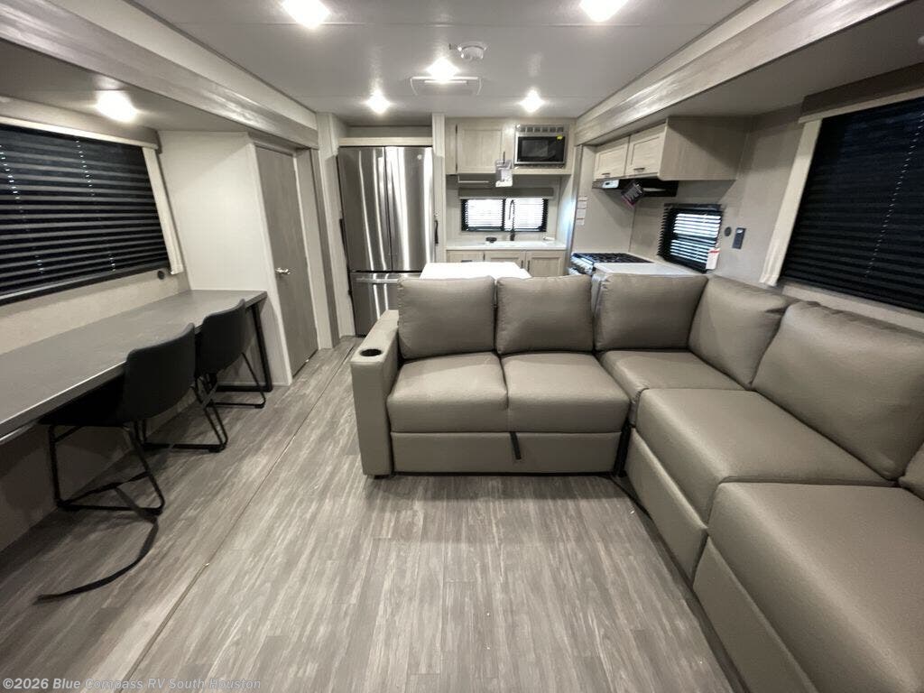 This travel trailer is perfect for those who enjoy comfort at the campground! The rear kitchen lets you make meals each day, and there is an island for additional counter space, plus a large pantry for snacks and dry goods. The sliding desk/table provides a versatile space to dine or get some work done, and the L-shaped sectional sofa gives you place to relax in the evenings. There is also an entertainment center with a TV so you can watch your favorite shows! A full bath on board means you won't have to leave your camper in the middle of the night, and a 60" x 74" RV queen bed provides a comfy place to sleep each night. The large closet, wardrobe and dresser will be great to store your clothes and shoes, and there is a second closet with washer/dryer prep if you choose to add these appliances!