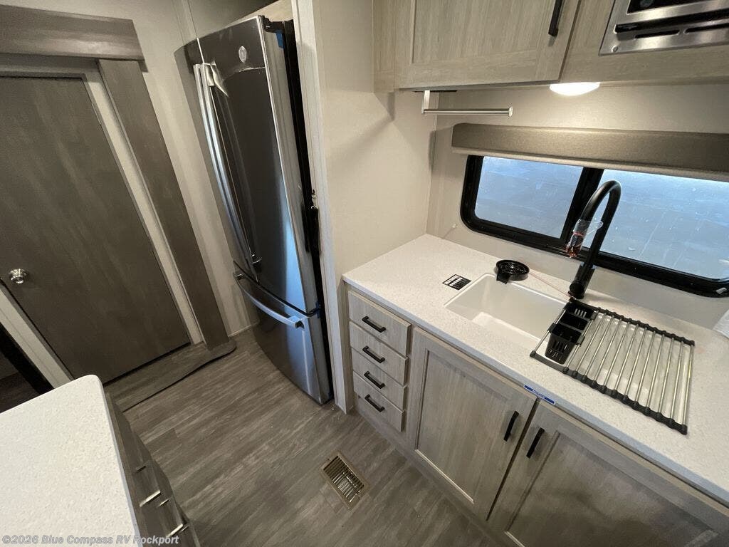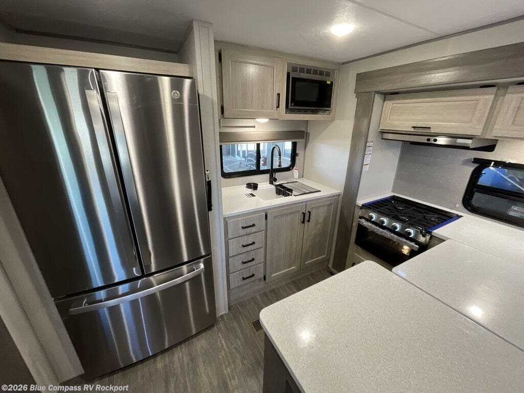 This travel trailer is perfect for those who enjoy comfort at the campground! The rear kitchen lets you make meals each day, and there is an island for additional counter space, plus a large pantry for snacks and dry goods. The sliding desk/table provides a versatile space to dine or get some work done, and the L-shaped sectional sofa gives you place to relax in the evenings. There is also an entertainment center with a TV so you can watch your favorite shows! A full bath on board means you won't have to leave your camper in the middle of the night, and a 60" x 74" RV queen bed provides a comfy place to sleep each night. The large closet, wardrobe and dresser will be great to store your clothes and shoes, and there is a second closet with washer/dryer prep if you choose to add these appliances!