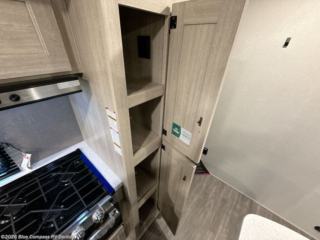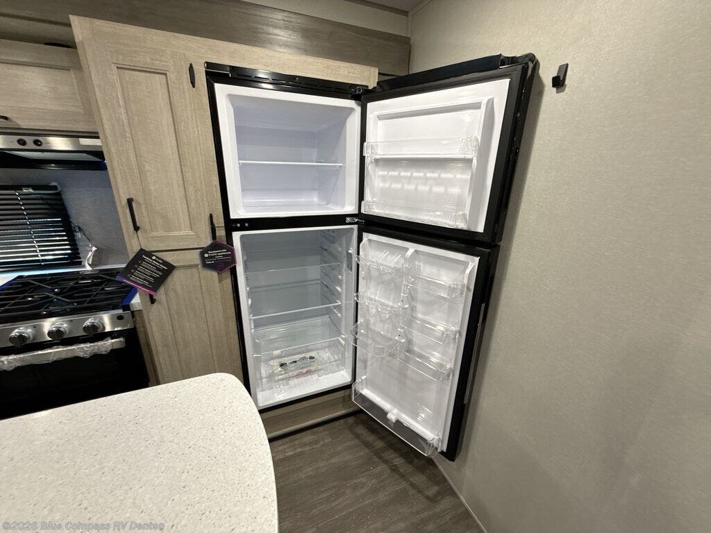 This travel trailer will feel a little more like home with its front private bedroom that includes a 60" x 74" queen bed, plus two closets for storage. And one of the closets includes washer and dryer prep if you choose that option. The rear living area will be a favorite hangout spot with its 68" sofa, theater seating, and entertainment center, plus there is a booth dinette for dining or game night. A kitchen island comes standard, along with a 12V 10.7 cu. ft. refrigerator, a three burner cooktop, plus a microwave oven; everything you need to make home-cooked meals!