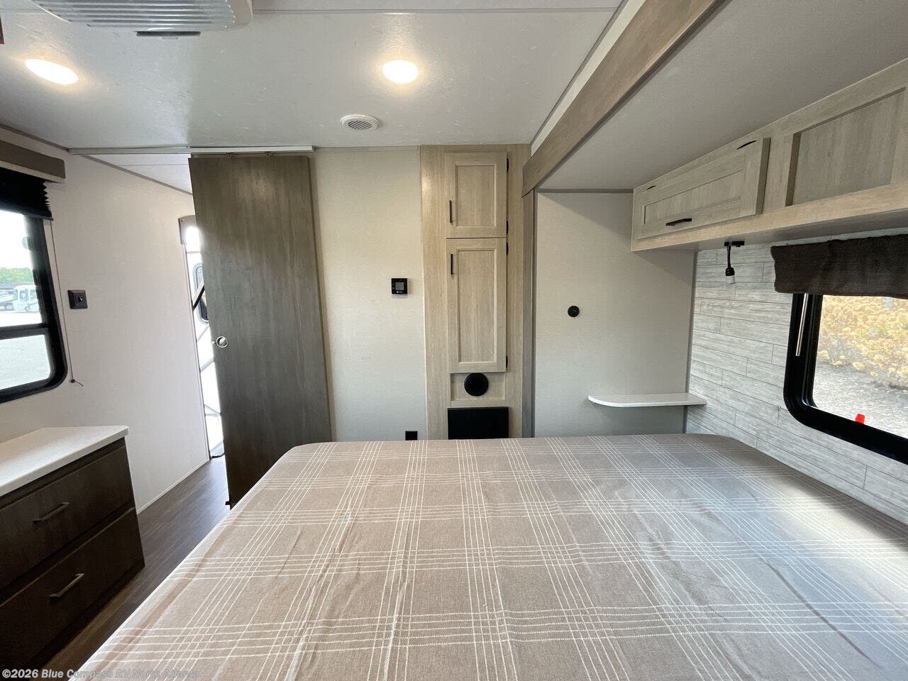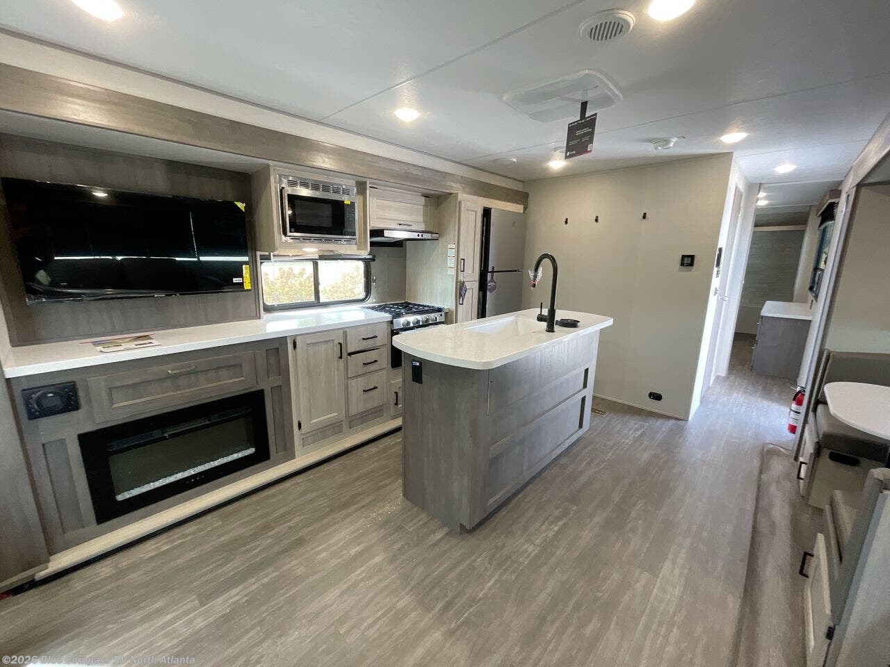 This travel trailer will feel a little more like home with its front private bedroom that includes a 60" x 74" queen bed, plus two closets for storage. And one of the closets includes washer and dryer prep if you choose that option. The rear living area will be a favorite hangout spot with its 68" sofa, theater seating, and entertainment center, plus there is a booth dinette for dining or game night. A kitchen island comes standard, along with a 12V 10.7 cu. ft. refrigerator, a three burner cooktop, plus a microwave oven; everything you need to make home-cooked meals!