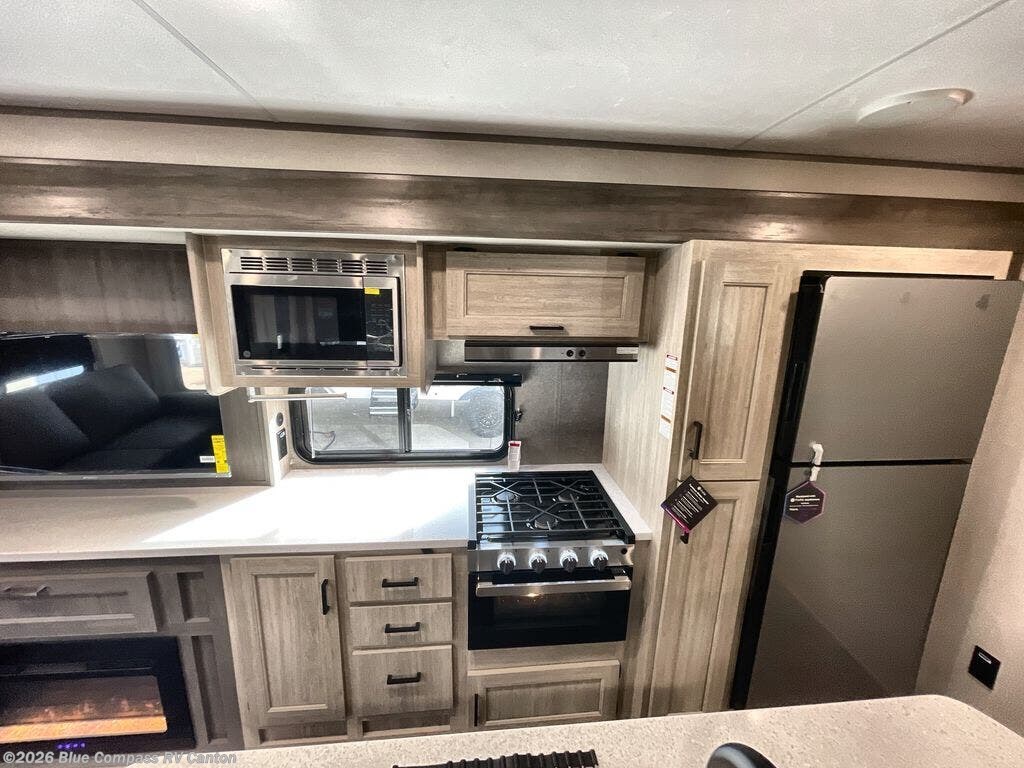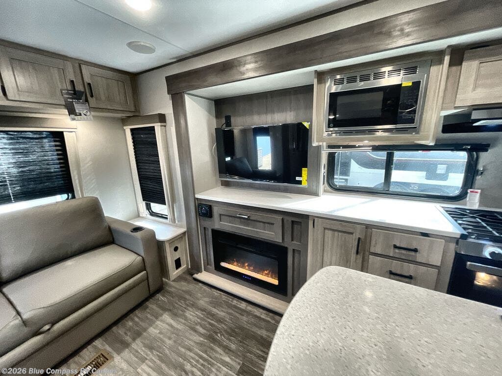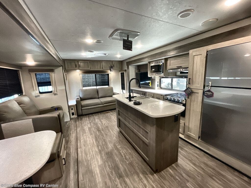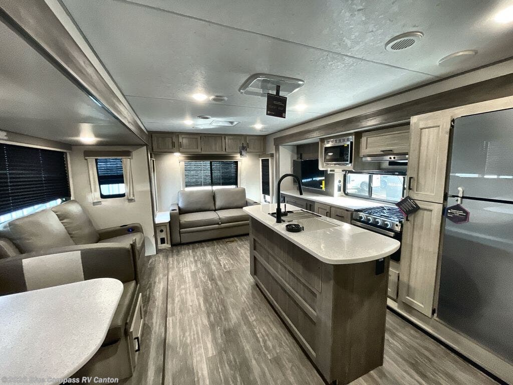 This travel trailer will feel a little more like home with its front private bedroom that includes a 60" x 74" queen bed, plus two closets for storage. And one of the closets includes washer and dryer prep if you choose that option. The rear living area will be a favorite hangout spot with its 68" sofa, theater seating, and entertainment center, plus there is a booth dinette for dining or game night. A kitchen island comes standard, along with a 12V 10.7 cu. ft. refrigerator, a three burner cooktop, plus a microwave oven; everything you need to make home-cooked meals!