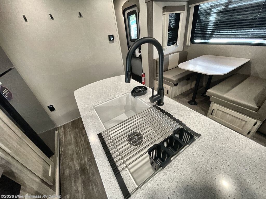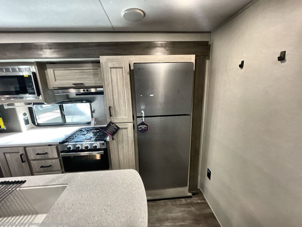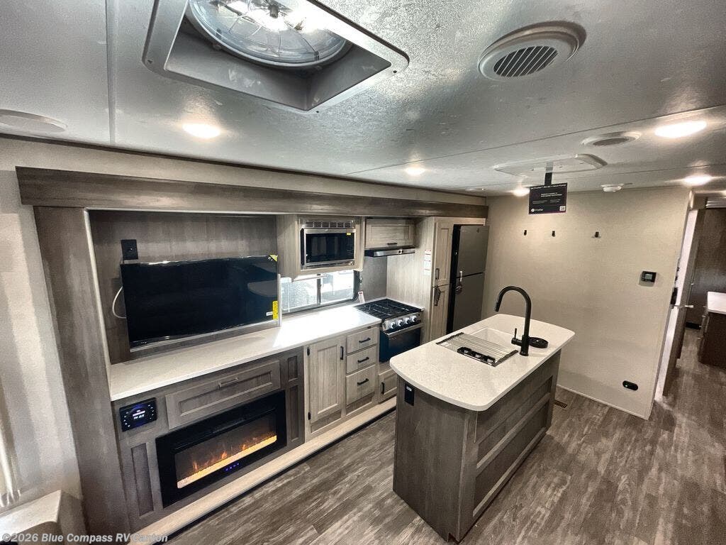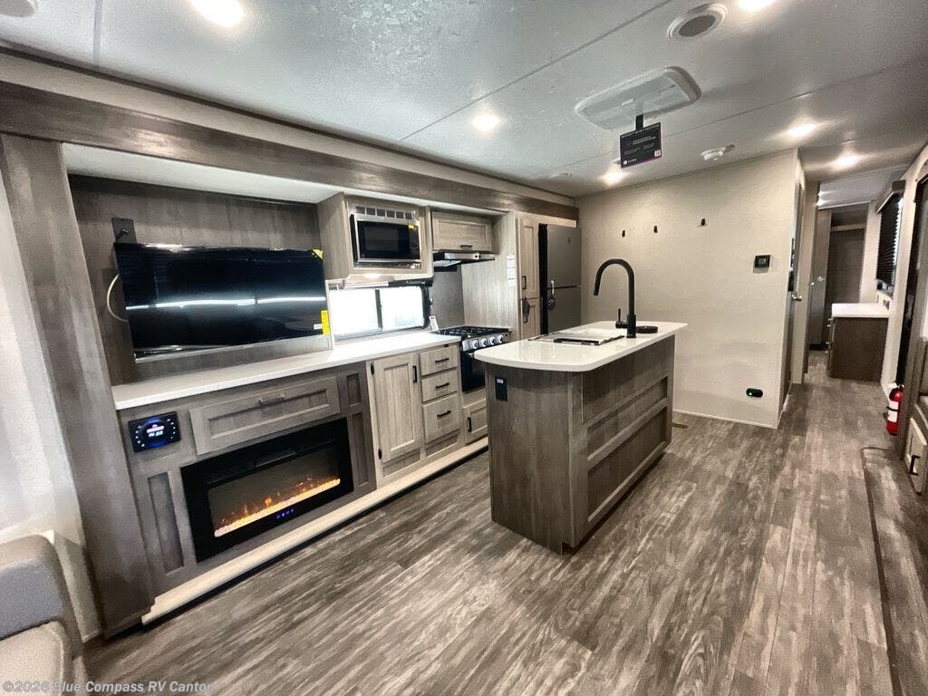 This travel trailer will feel a little more like home with its front private bedroom that includes a 60" x 74" queen bed, plus two closets for storage. And one of the closets includes washer and dryer prep if you choose that option. The rear living area will be a favorite hangout spot with its 68" sofa, theater seating, and entertainment center, plus there is a booth dinette for dining or game night. A kitchen island comes standard, along with a 12V 10.7 cu. ft. refrigerator, a three burner cooktop, plus a microwave oven; everything you need to make home-cooked meals!