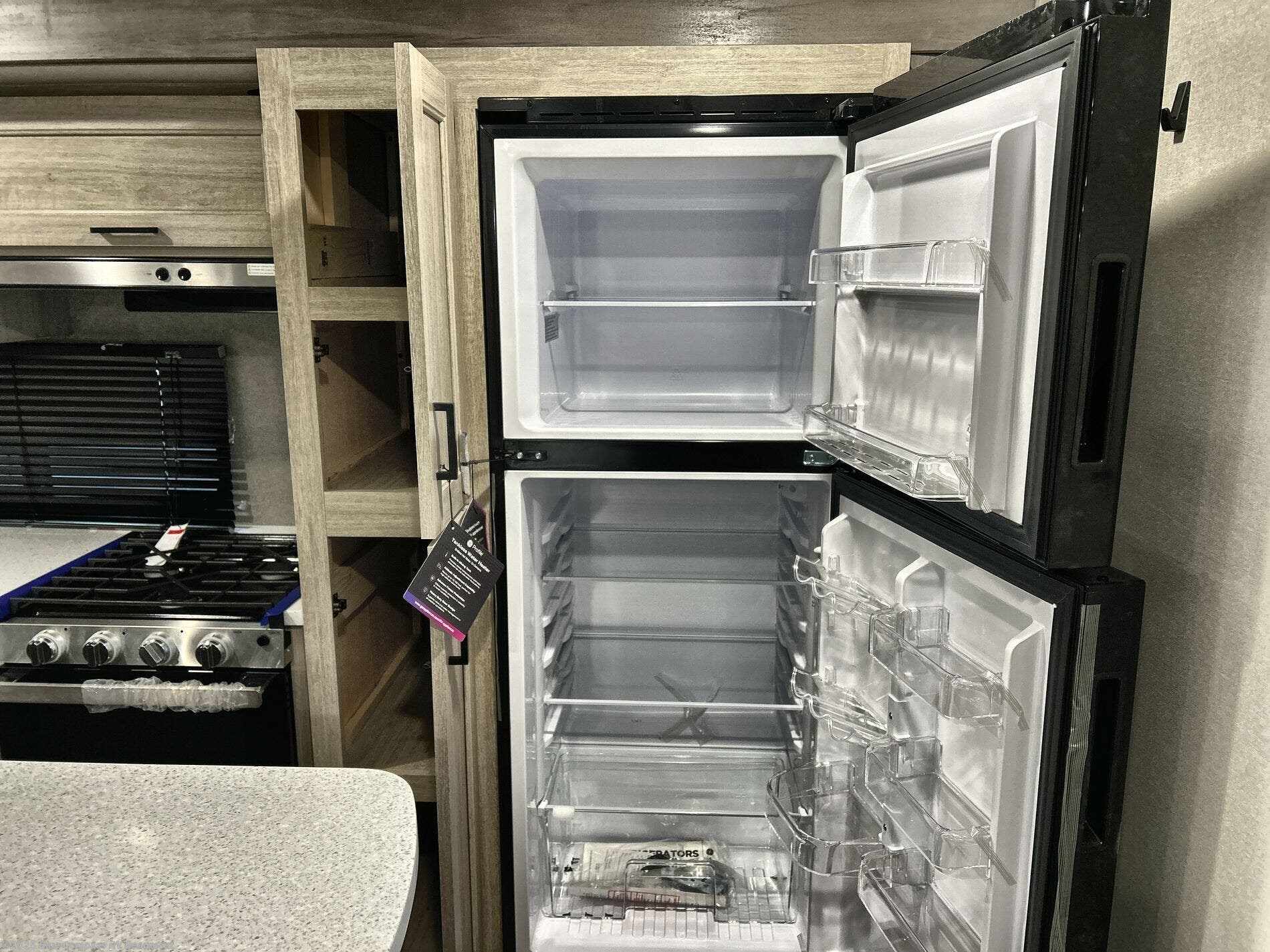 This travel trailer will feel a little more like home with its front private bedroom that includes a 60" x 74" queen bed, plus two closets for storage. And one of the closets includes washer and dryer prep if you choose that option. The rear living area will be a favorite hangout spot with its 68" sofa, theater seating, and entertainment center, plus there is a booth dinette for dining or game night. A kitchen island comes standard, along with a 12V 10.7 cu. ft. refrigerator, a three burner cooktop, plus a microwave oven; everything you need to make home-cooked meals!