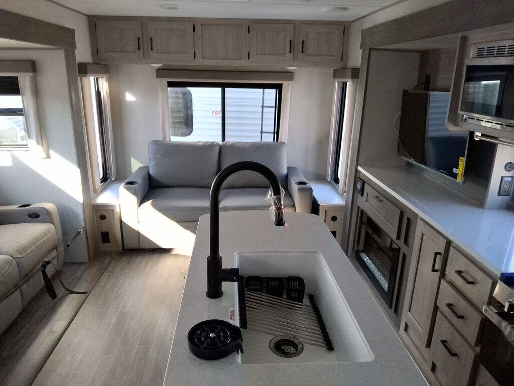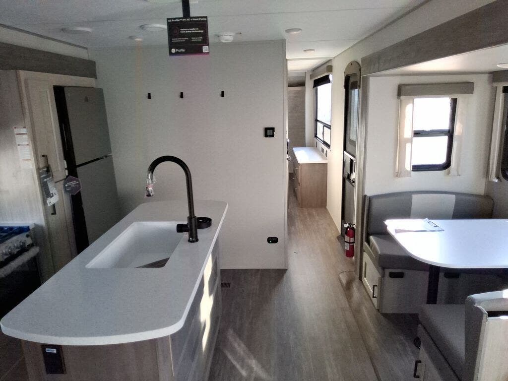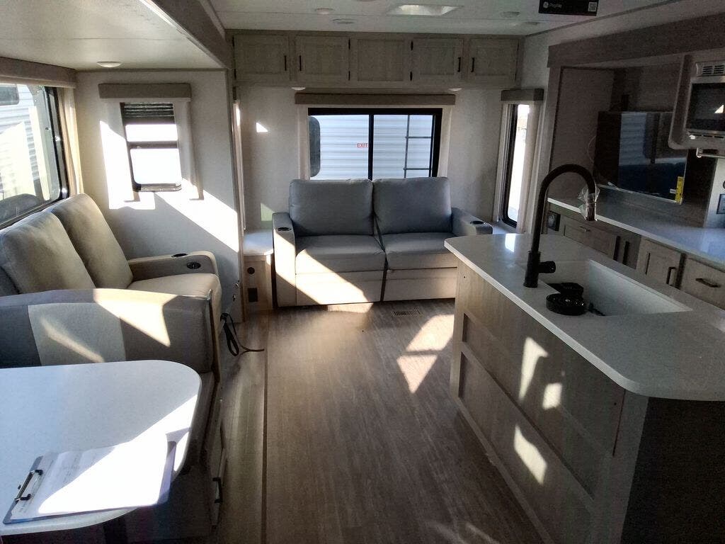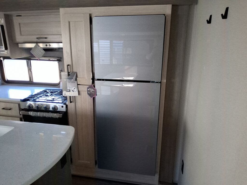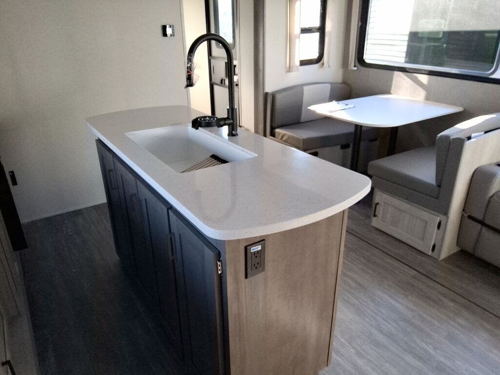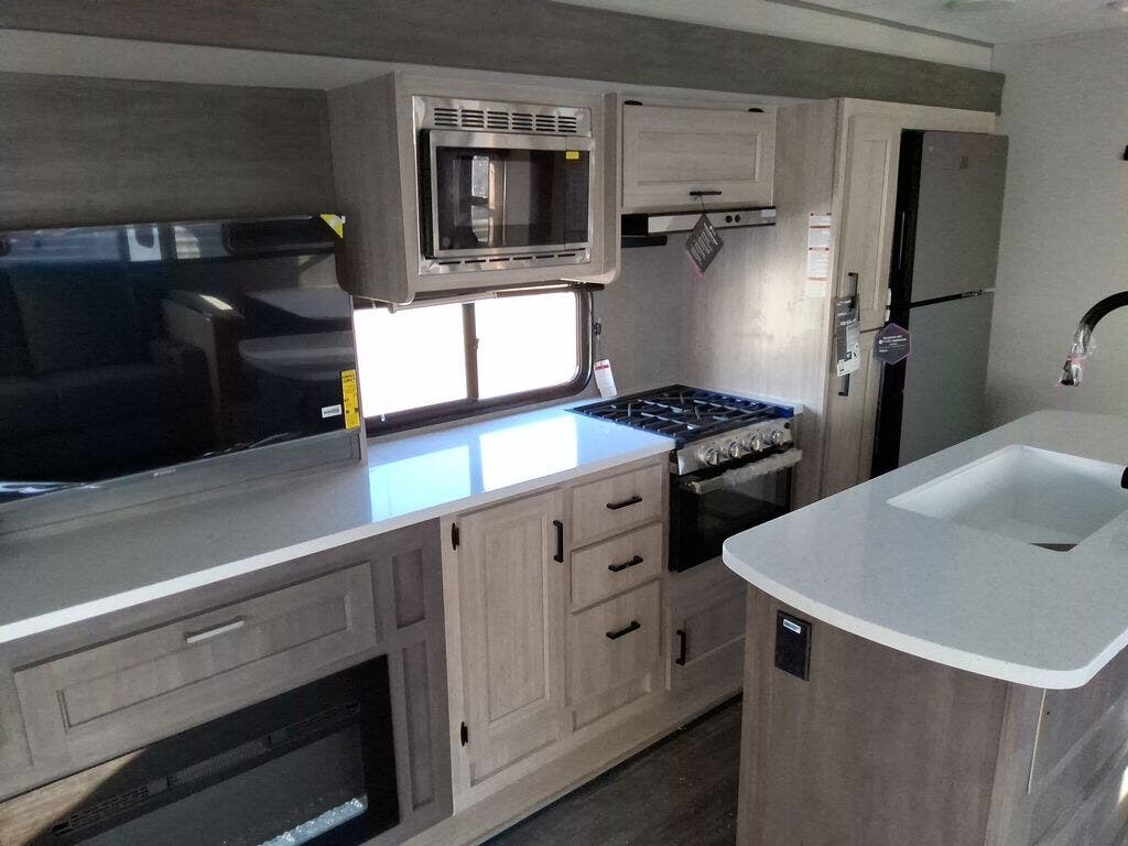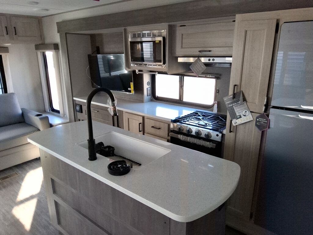 This travel trailer will feel a little more like home with its front private bedroom that includes a 60" x 74" queen bed, plus two closets for storage. And one of the closets includes washer and dryer prep if you choose that option. The rear living area will be a favorite hangout spot with its 68" sofa, theater seating, and entertainment center, plus there is a booth dinette for dining or game night. A kitchen island comes standard, along with a 12V 10.7 cu. ft. refrigerator, a three burner cooktop, plus a microwave oven; everything you need to make home-cooked meals!