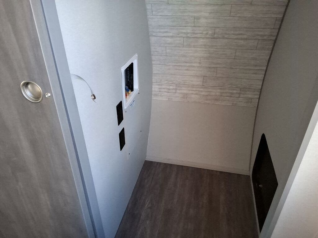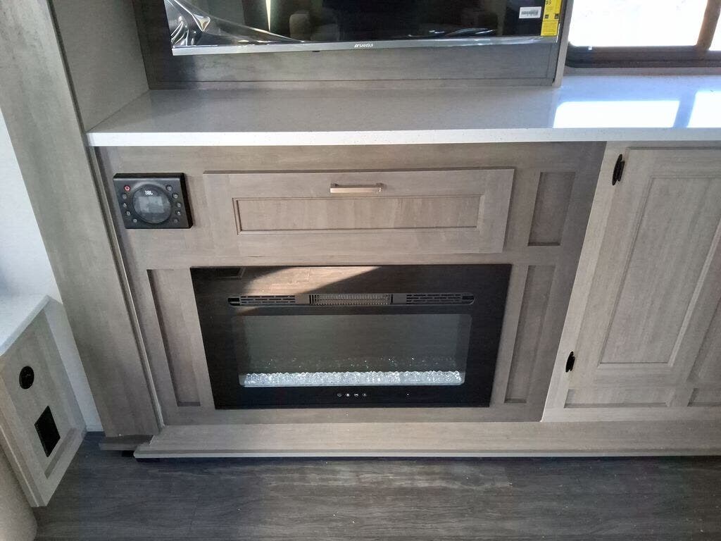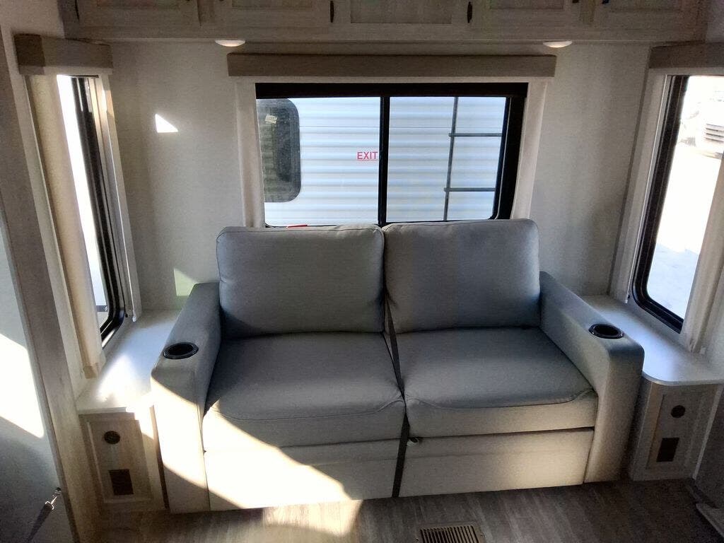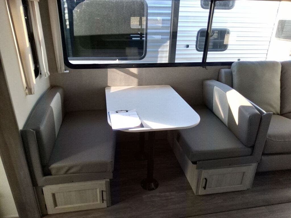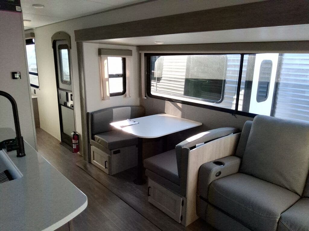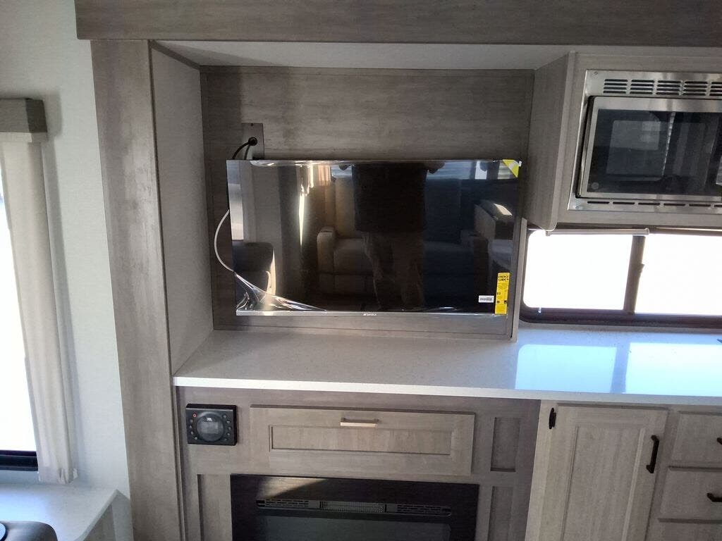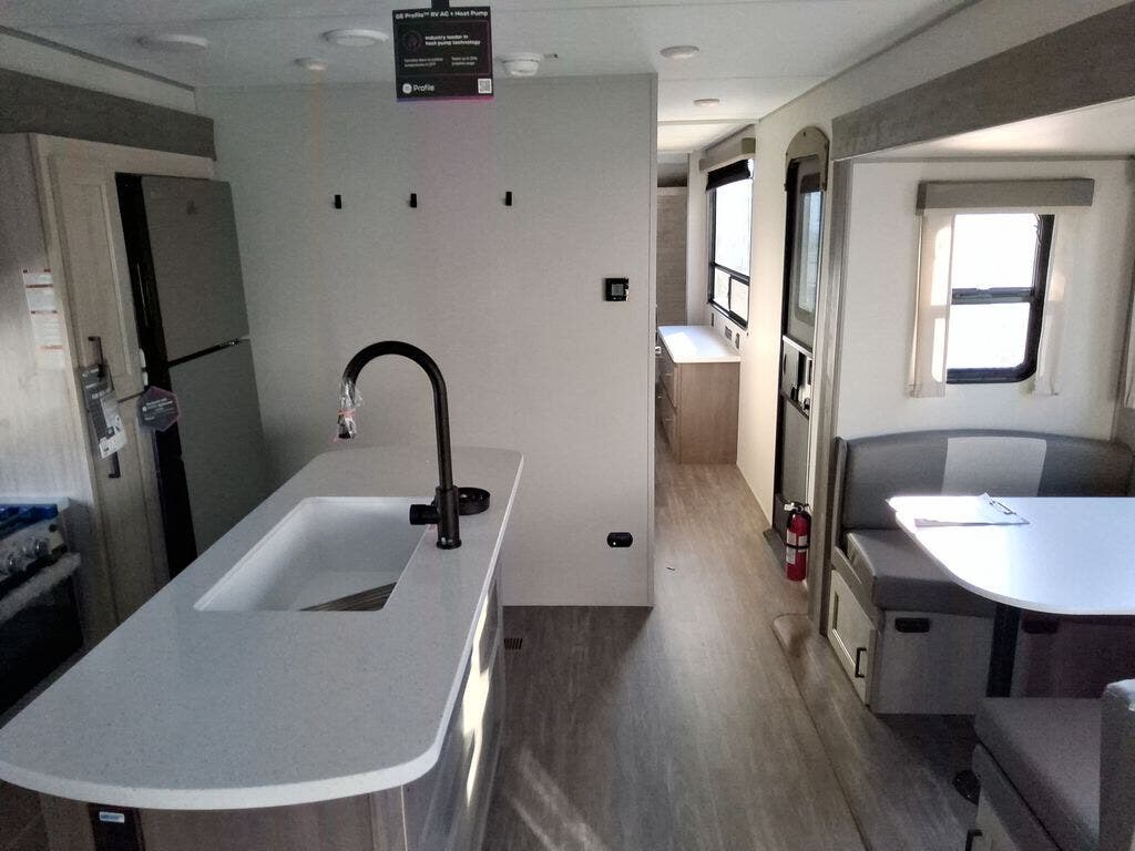 This travel trailer will feel a little more like home with its front private bedroom that includes a 60" x 74" queen bed, plus two closets for storage. And one of the closets includes washer and dryer prep if you choose that option. The rear living area will be a favorite hangout spot with its 68" sofa, theater seating, and entertainment center, plus there is a booth dinette for dining or game night. A kitchen island comes standard, along with a 12V 10.7 cu. ft. refrigerator, a three burner cooktop, plus a microwave oven; everything you need to make home-cooked meals!