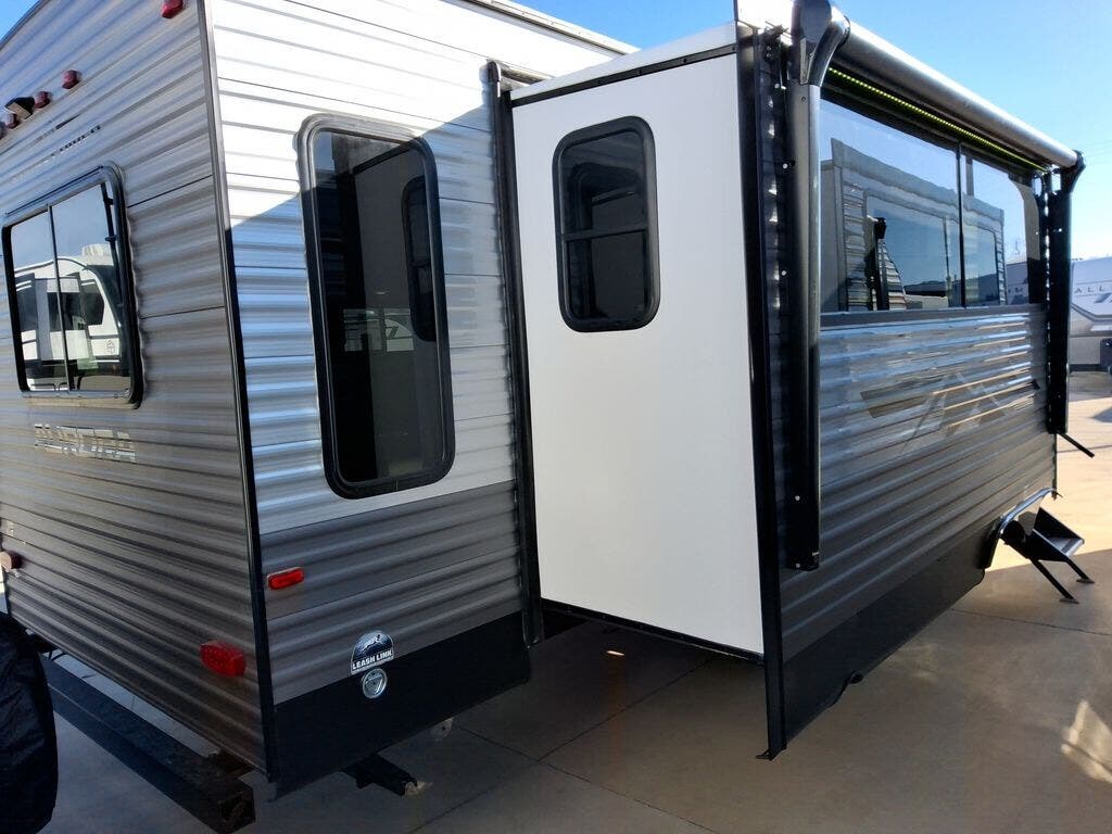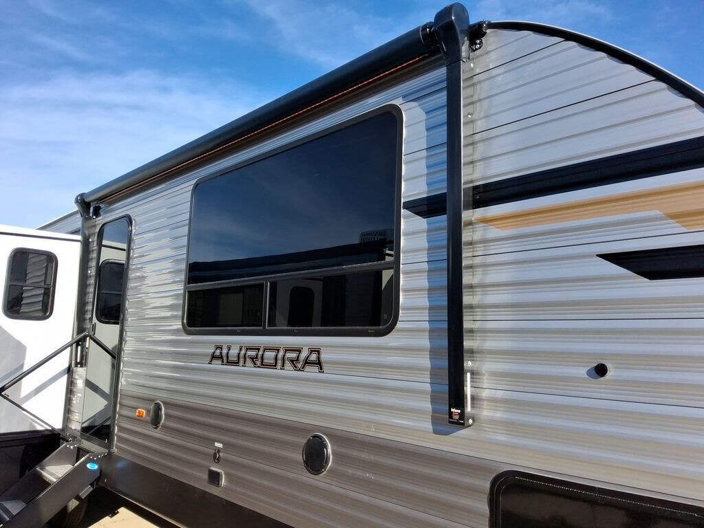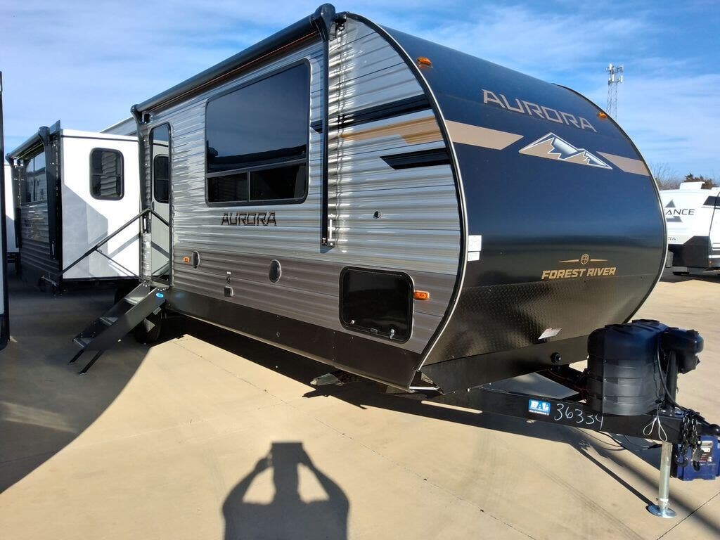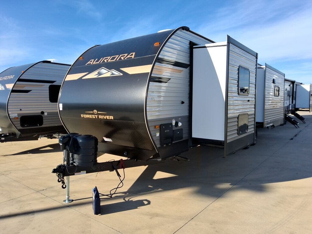 Comfortability, usability, and quality is what you will find in each one of these Forest River Aurora travel trailers, toy haulers or destination trailers! They are designed with a superior build and packed full with industry leading, functional, and distinctive standard features. SolidStep entrance steps and a Safe-T rail door assist on main entry door to help you safely enter and exit the unit. The diamond plate rock guard will protect your unit from road debris and the nitrogen filled radial tires, which keep their pressure longer, offer better fuel economy. You will also find upgraded JBL Elite exterior speakers outside, an electric awning with multicolor lights and remote, plus flush mount baggage doors for easy packing. The interiors are beautifully designed with a deep undermount farm style sink, stainless steel appliances, and linoleum flooring in the slide outs which will be easy to clean. Come find your favorite model today!