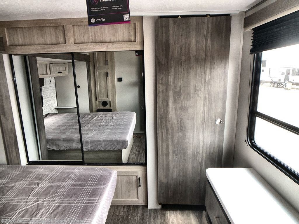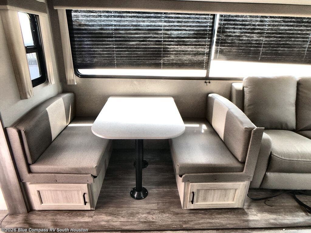 This travel trailer will feel a little more like home with its front private bedroom that includes a 60" x 74" queen bed, plus two closets for storage. And one of the closets includes washer and dryer prep if you choose that option. The rear living area will be a favorite hangout spot with its 68" sofa, theater seating, and entertainment center, plus there is a booth dinette for dining or game night. A kitchen island comes standard, along with a 12V 10.7 cu. ft. refrigerator, a three burner cooktop, plus a microwave oven; everything you need to make home-cooked meals!