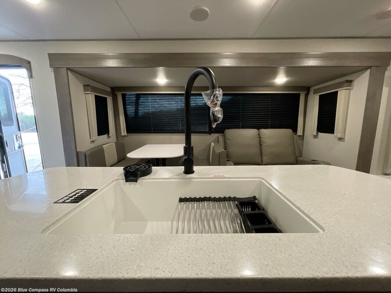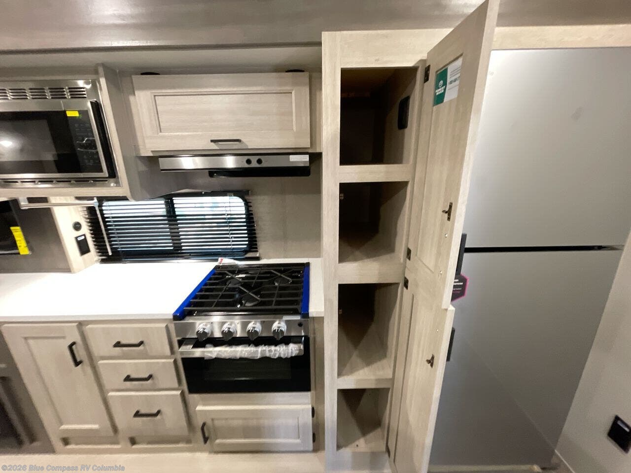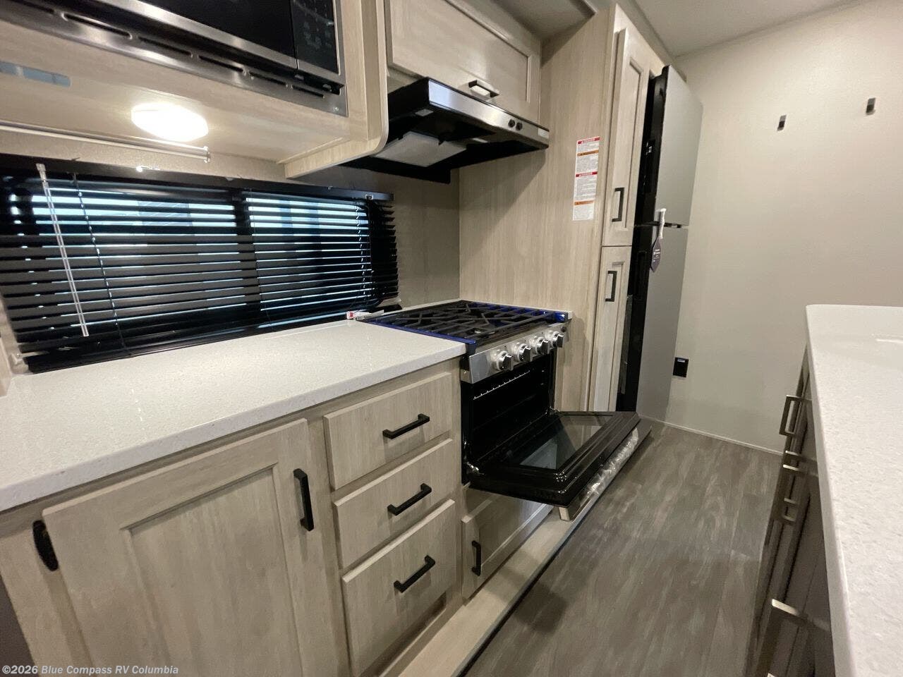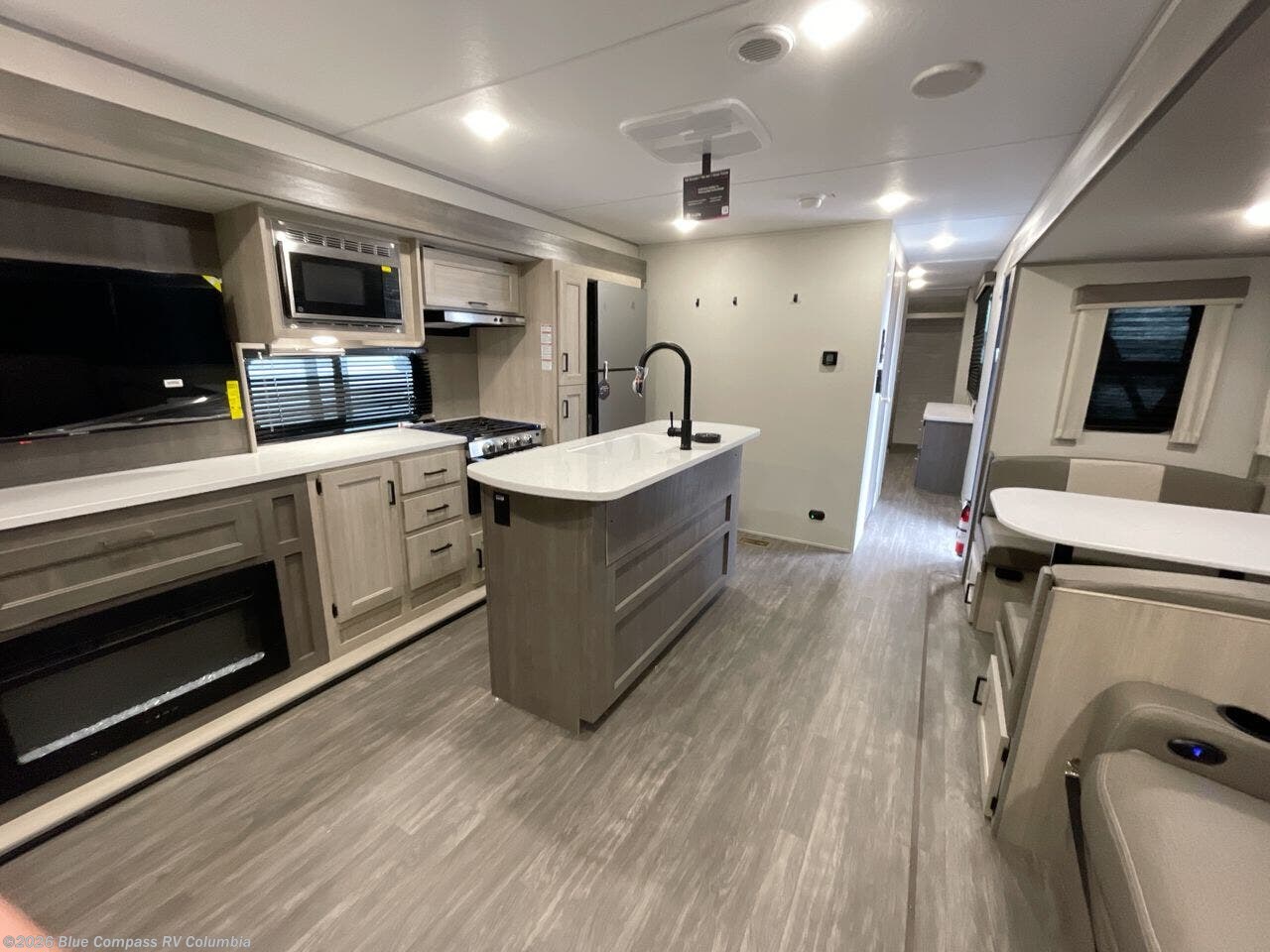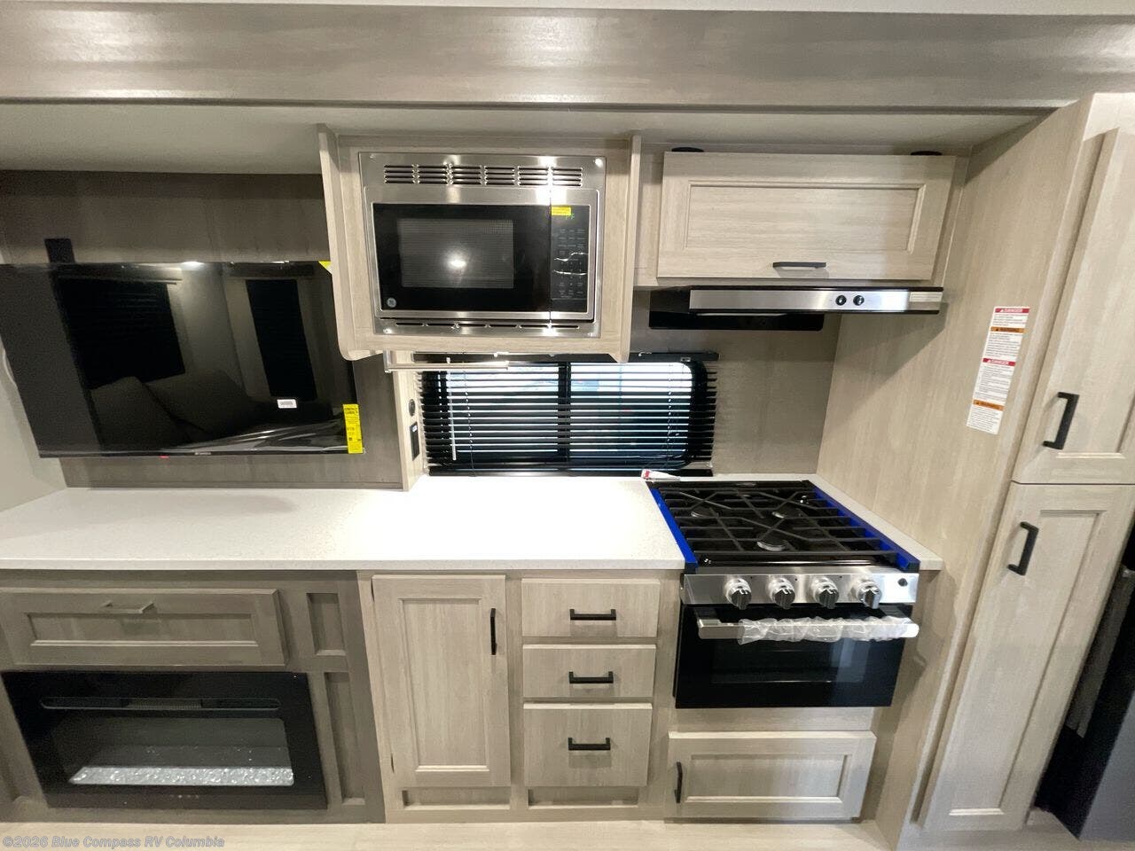 This travel trailer will feel a little more like home with its front private bedroom that includes a 60" x 74" queen bed, plus two closets for storage. And one of the closets includes washer and dryer prep if you choose that option. The rear living area will be a favorite hangout spot with its 68" trundle sofa, theater seating, and entertainment center, plus there is a booth dinette for dining or game night. A kitchen island comes standard, along with a 12V 10.7 cu. ft. refrigerator, a three-burner cooktop, plus a microwave oven; everything you need to make home-cooked meals!