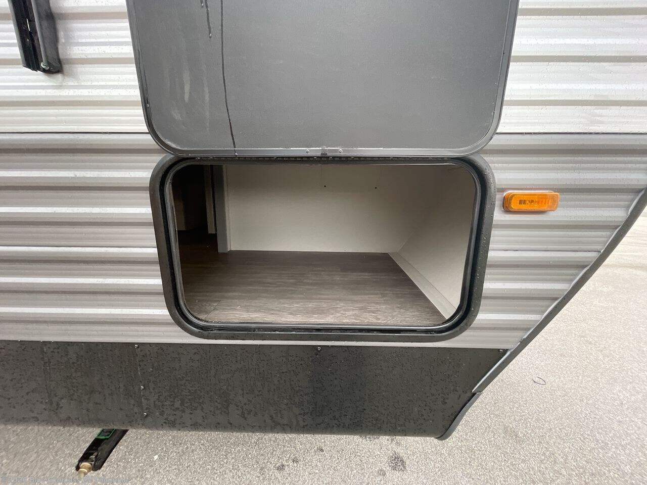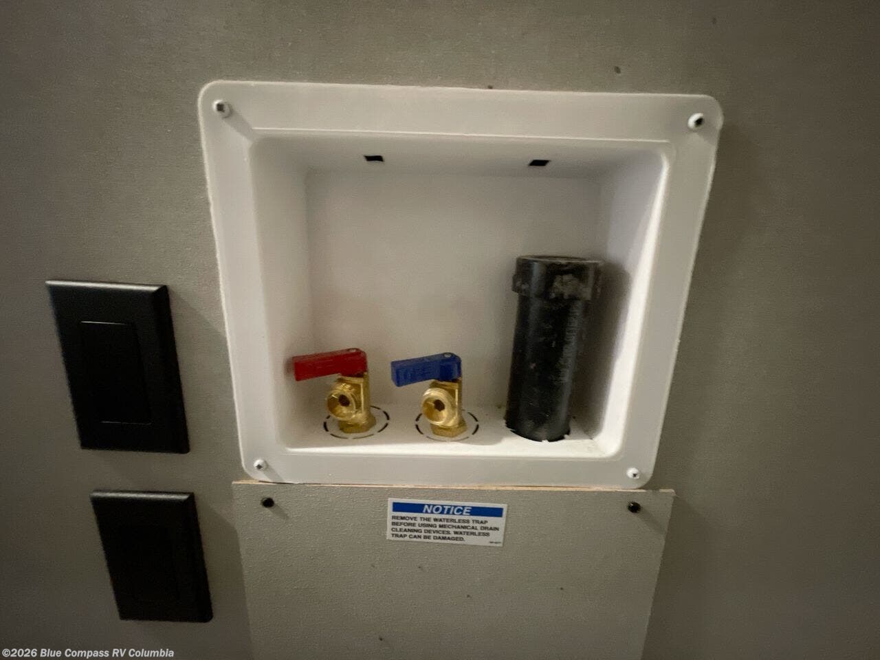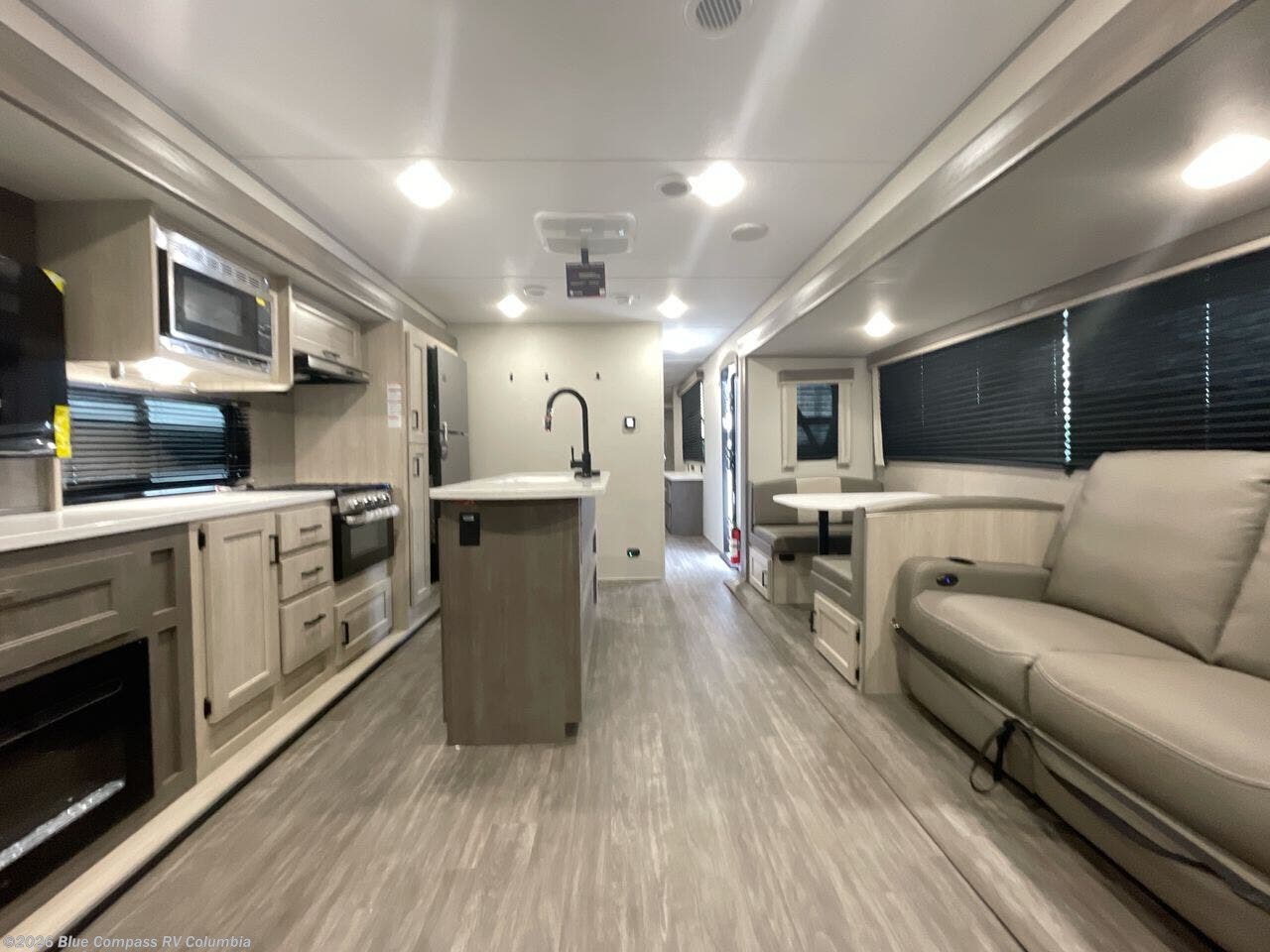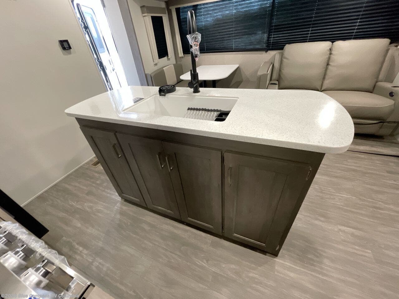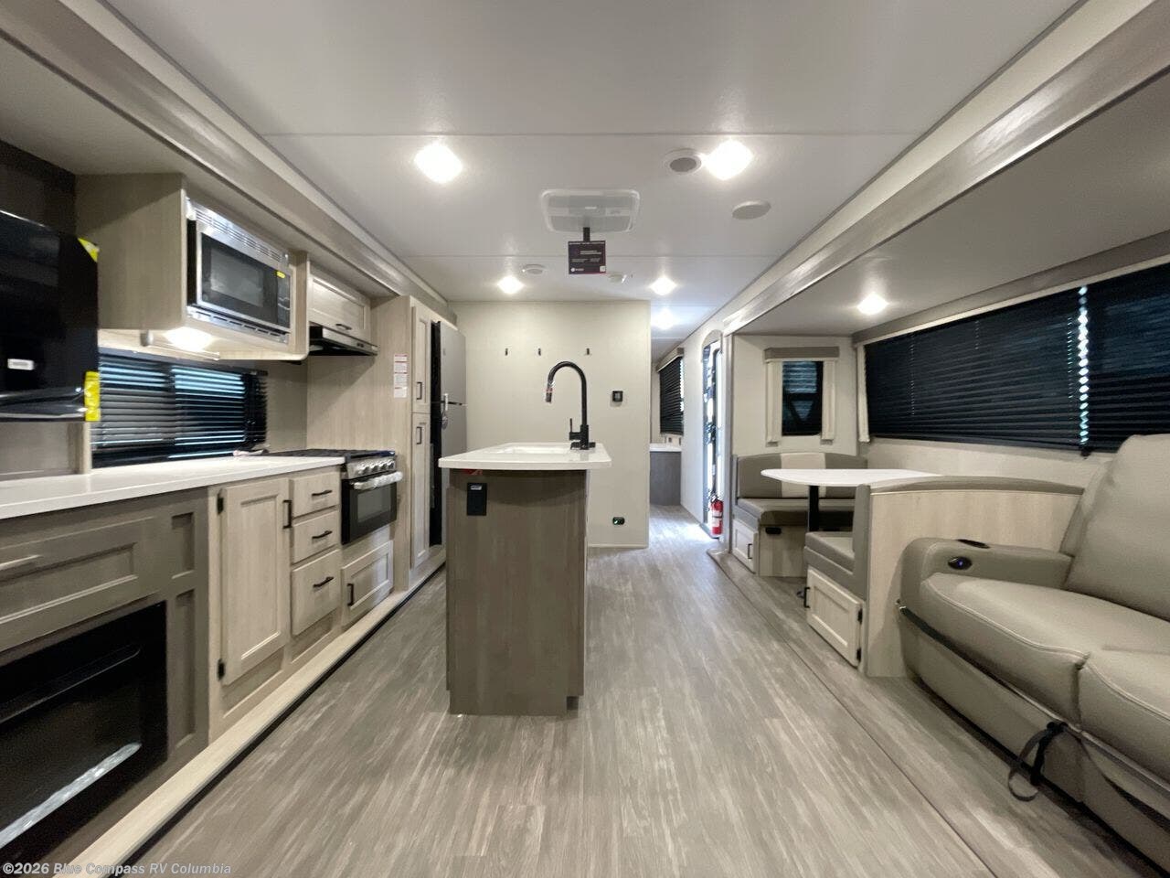 This travel trailer will feel a little more like home with its front private bedroom that includes a 60" x 74" queen bed, plus two closets for storage. And one of the closets includes washer and dryer prep if you choose that option. The rear living area will be a favorite hangout spot with its 68" trundle sofa, theater seating, and entertainment center, plus there is a booth dinette for dining or game night. A kitchen island comes standard, along with a 12V 10.7 cu. ft. refrigerator, a three-burner cooktop, plus a microwave oven; everything you need to make home-cooked meals!