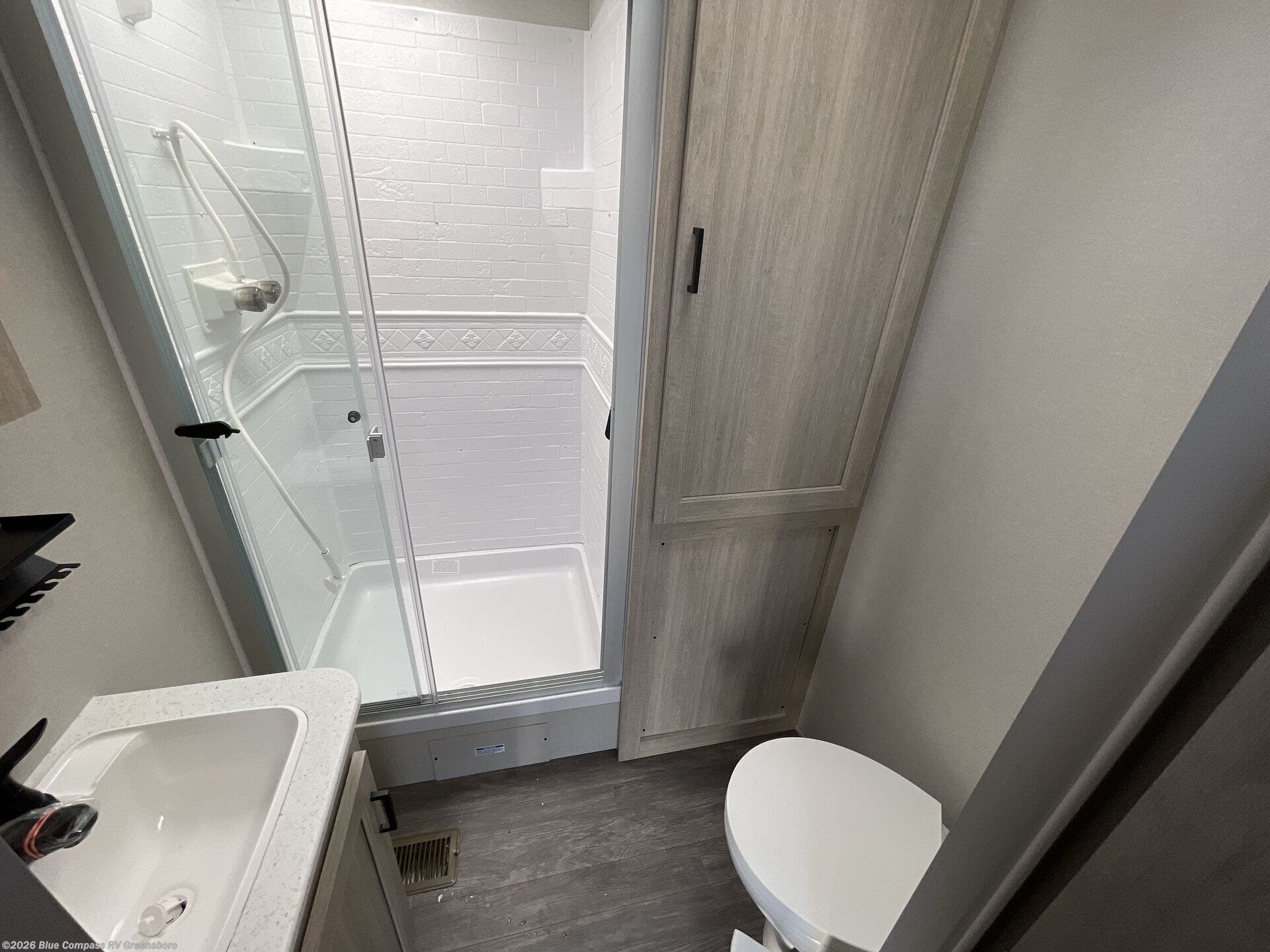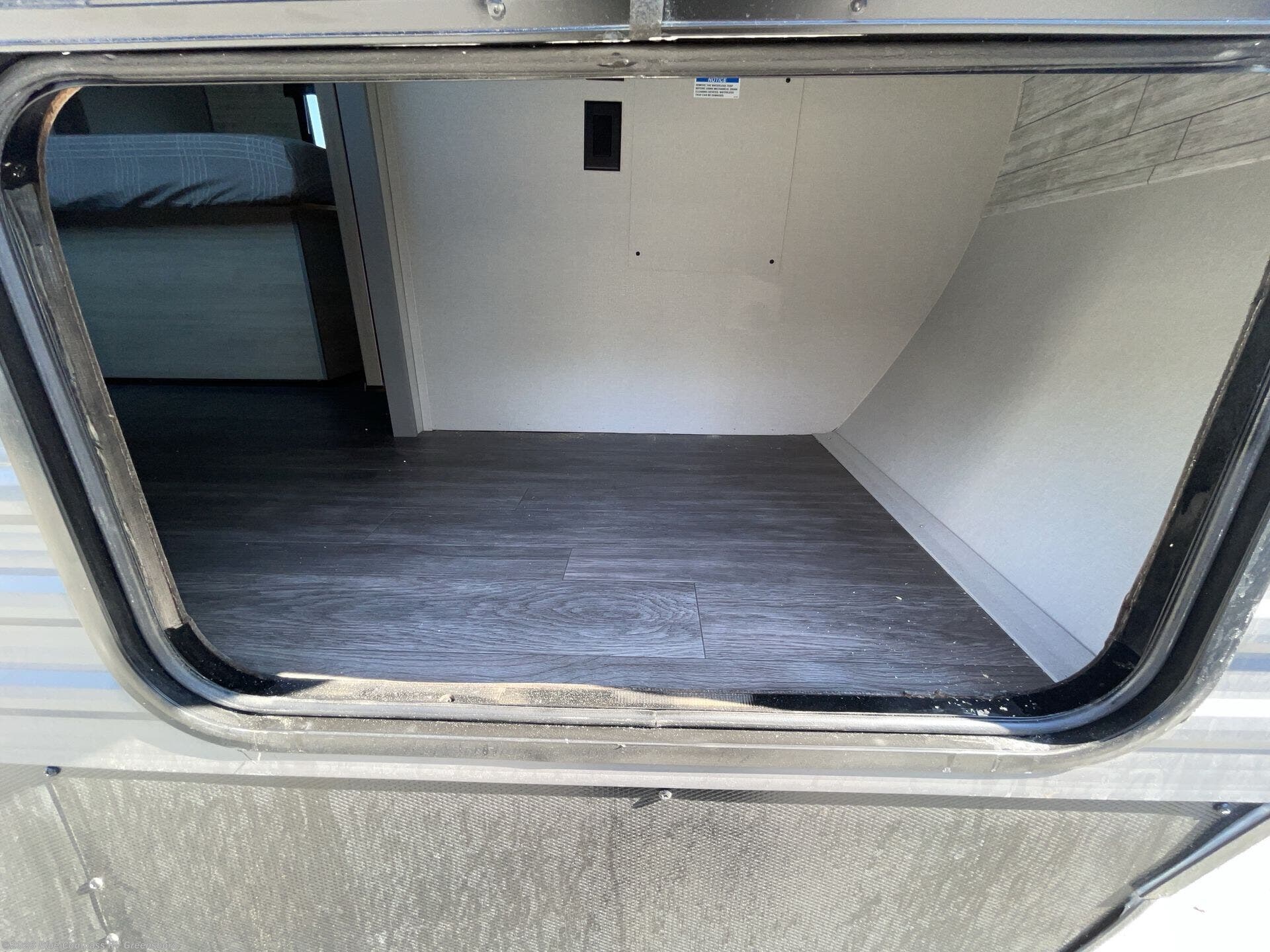 This travel trailer will feel a little more like home with its front private bedroom that includes a 60" x 74" queen bed, plus two closets for storage. And one of the closets includes washer and dryer prep if you choose that option. The rear living area will be a favorite hangout spot with its 68" trundle sofa, theater seating, and entertainment center, plus there is a booth dinette for dining or game night. A kitchen island comes standard, along with a 12V 10.7 cu. ft. refrigerator, a three-burner cooktop, plus a microwave oven; everything you need to make home-cooked meals!