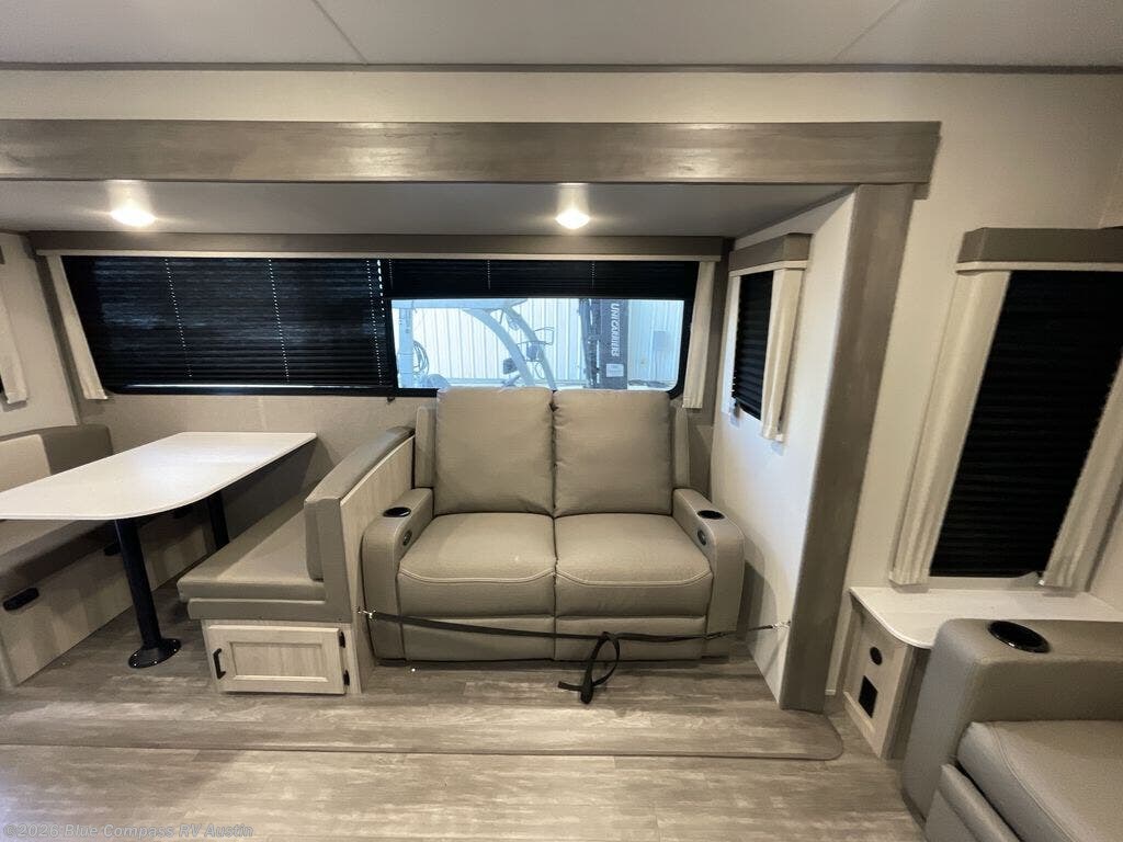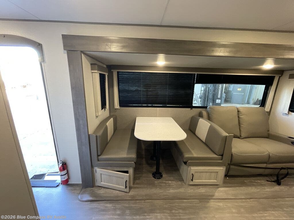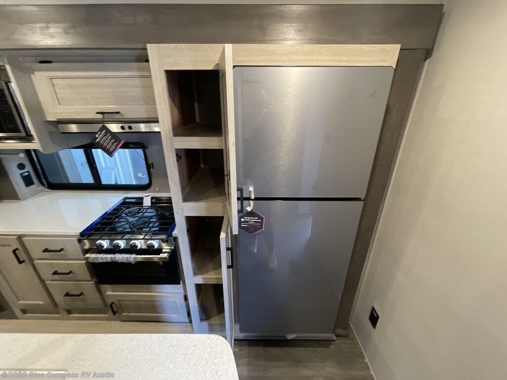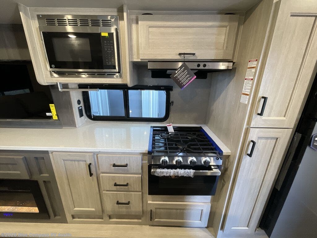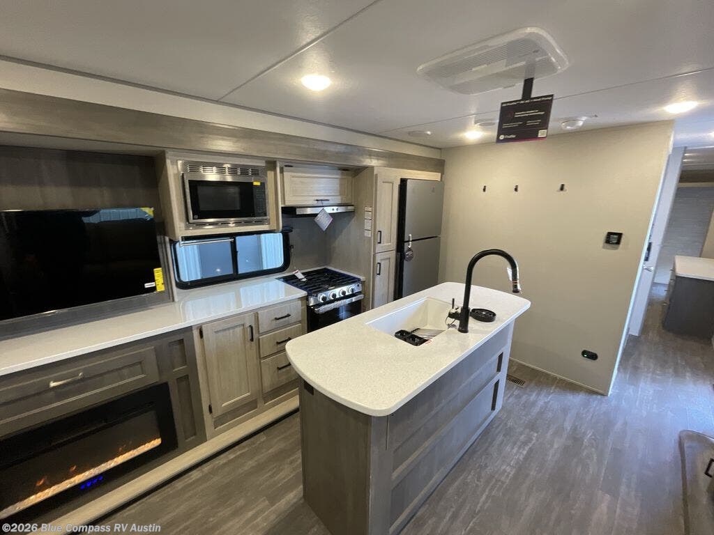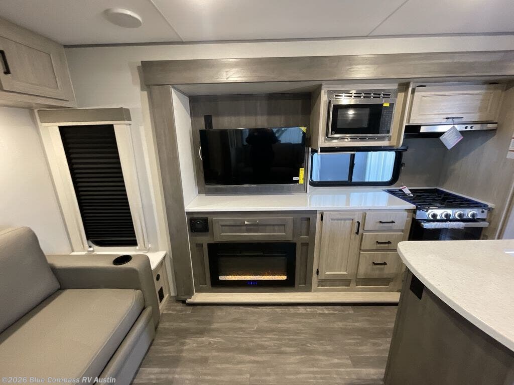 This travel trailer will feel a little more like home with its front private bedroom that includes a 60" x 74" queen bed, plus two closets for storage. And one of the closets includes washer and dryer prep if you choose that option. The rear living area will be a favorite hangout spot with its 68" sofa, theater seating, and entertainment center, plus there is a booth dinette for dining or game night. A kitchen island comes standard, along with a 12V 10.7 cu. ft. refrigerator, a three burner cooktop, plus a microwave oven; everything you need to make home-cooked meals!