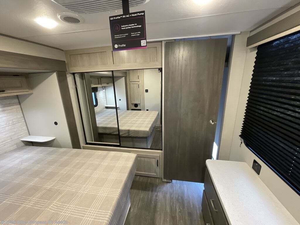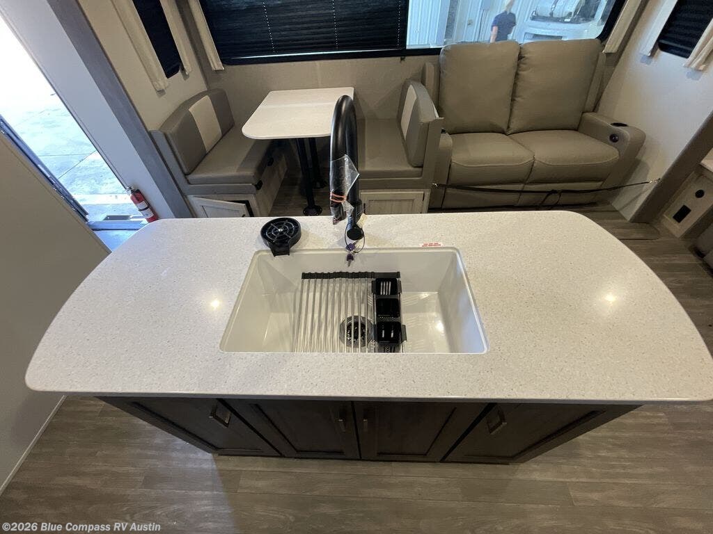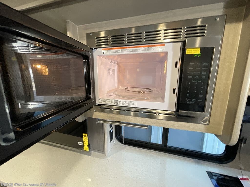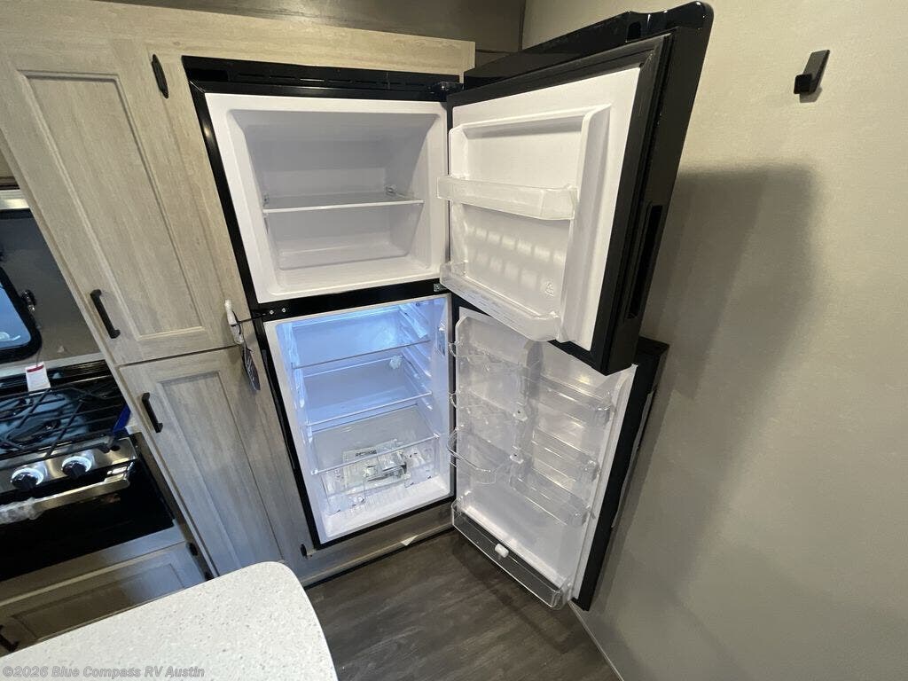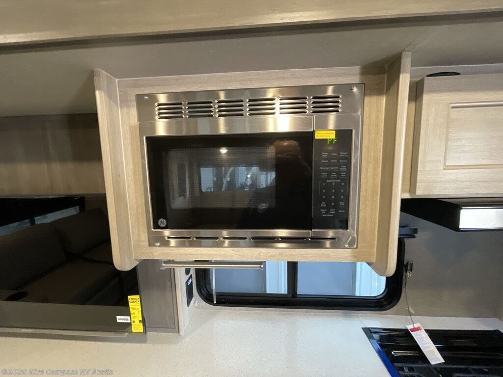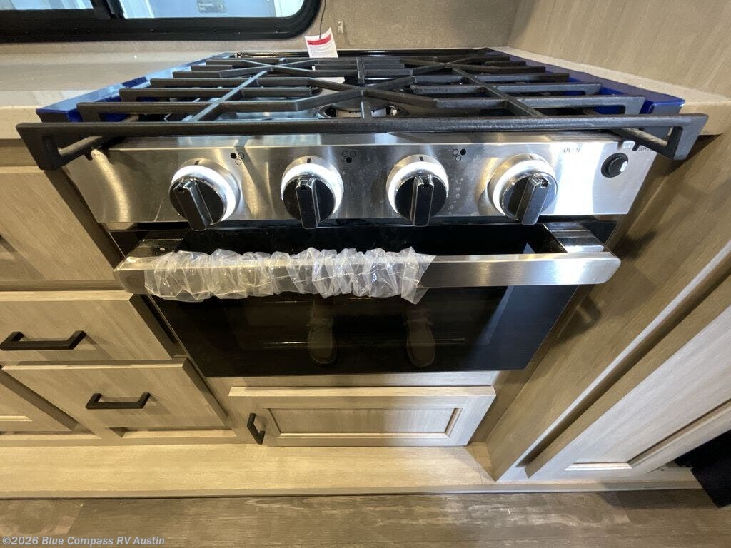 This travel trailer will feel a little more like home with its front private bedroom that includes a 60" x 74" queen bed, plus two closets for storage. And one of the closets includes washer and dryer prep if you choose that option. The rear living area will be a favorite hangout spot with its 68" sofa, theater seating, and entertainment center, plus there is a booth dinette for dining or game night. A kitchen island comes standard, along with a 12V 10.7 cu. ft. refrigerator, a three burner cooktop, plus a microwave oven; everything you need to make home-cooked meals!