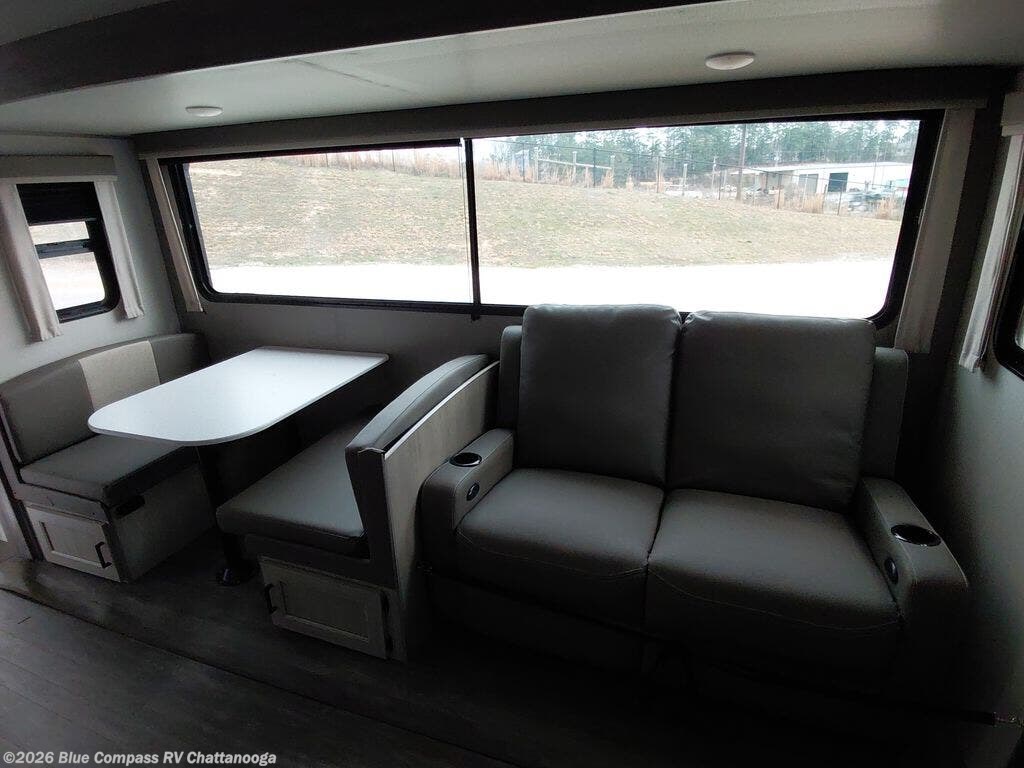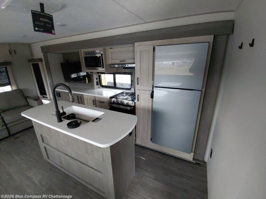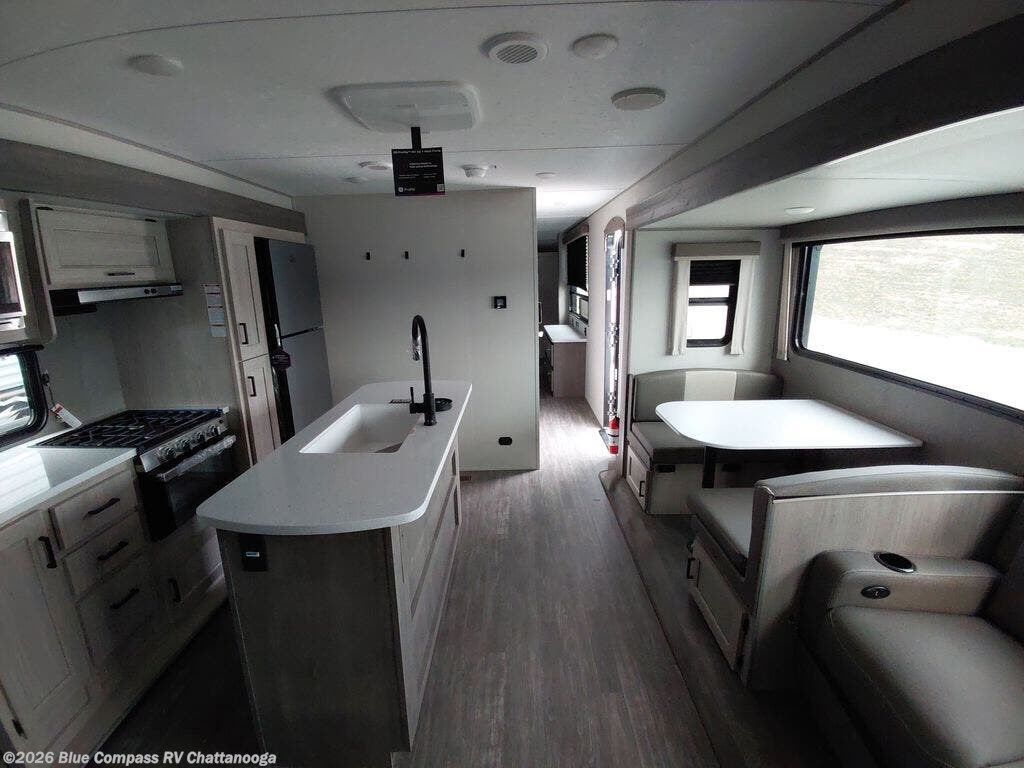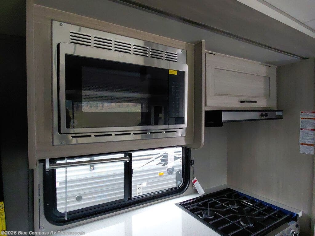 This travel trailer will feel a little more like home with its front private bedroom that includes a 60" x 74" queen bed, plus two closets for storage. And one of the closets includes washer and dryer prep if you choose that option. The rear living area will be a favorite hangout spot with its 68" trundle sofa, theater seating, and entertainment center, plus there is a booth dinette for dining or game night. A kitchen island comes standard, along with a 12V 10.7 cu. ft. refrigerator, a three-burner cooktop, plus a microwave oven; everything you need to make home-cooked meals!