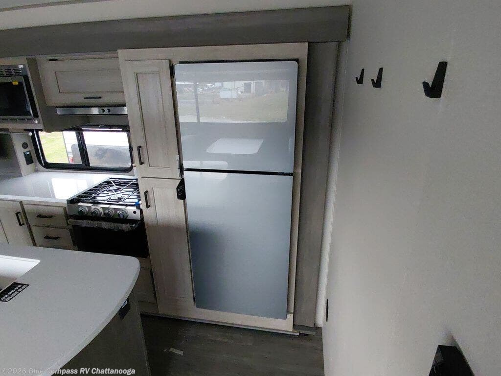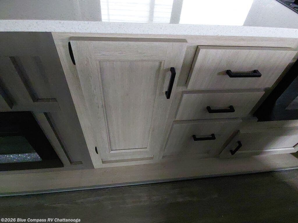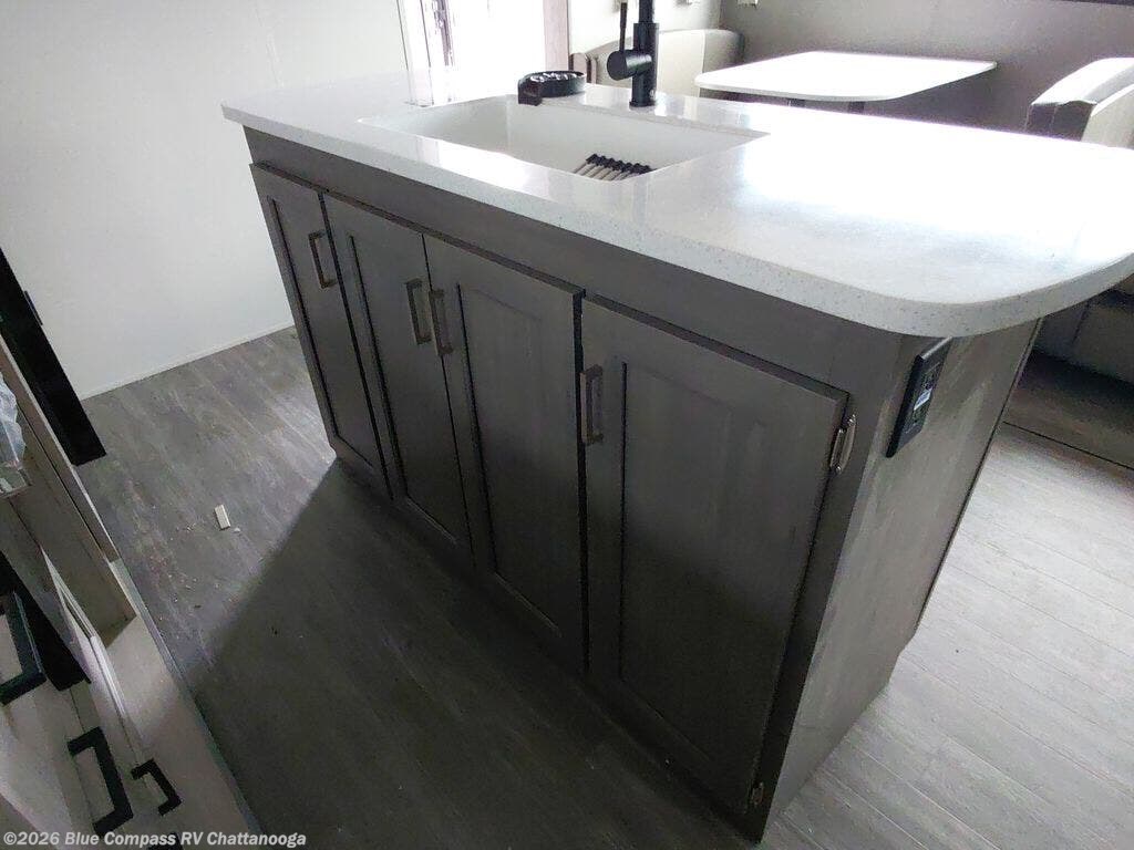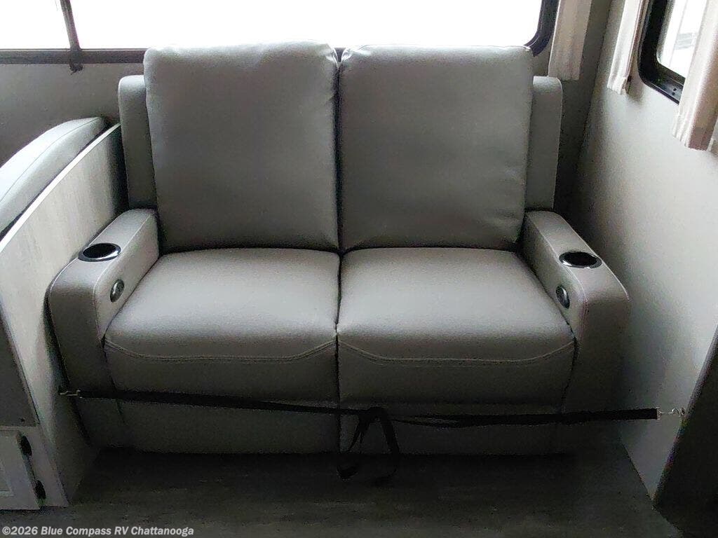 This travel trailer will feel a little more like home with its front private bedroom that includes a 60" x 74" queen bed, plus two closets for storage. And one of the closets includes washer and dryer prep if you choose that option. The rear living area will be a favorite hangout spot with its 68" trundle sofa, theater seating, and entertainment center, plus there is a booth dinette for dining or game night. A kitchen island comes standard, along with a 12V 10.7 cu. ft. refrigerator, a three-burner cooktop, plus a microwave oven; everything you need to make home-cooked meals!