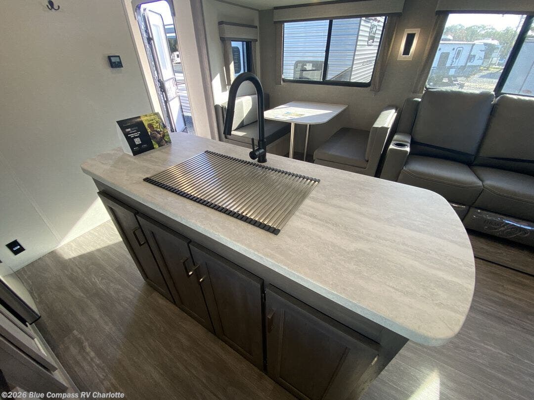 This travel trailer will feel a little more like home with its front private bedroom that includes a 60" x 74" queen bed, plus two closets for storage. And one of the closets includes washer and dryer prep if you choose that option. The rear living area will be a favorite hangout spot with its 68" trundle sofa, theater seating, and entertainment center, plus there is a booth dinette for dining or game night. A kitchen island comes standard, along with a 12V 10.7 cu. ft. refrigerator, a three-burner cooktop, plus a microwave oven; everything you need to make home-cooked meals!