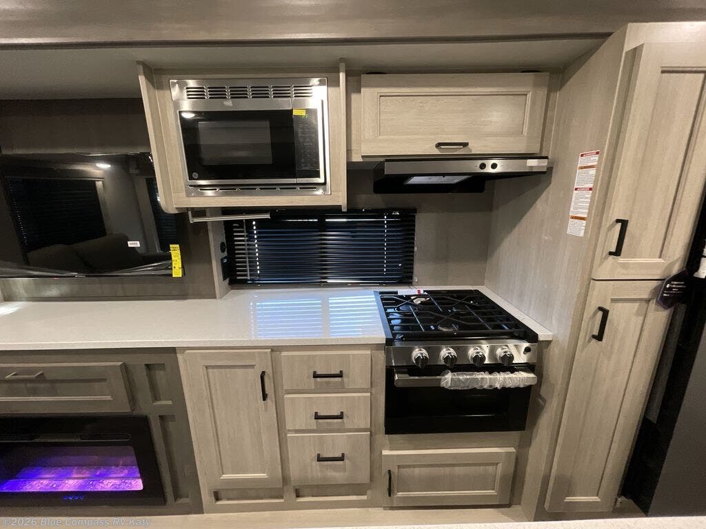 This travel trailer will feel a little more like home with its front private bedroom that includes a 60" x 74" queen bed, plus two closets for storage. And one of the closets includes washer and dryer prep if you choose that option. The rear living area will be a favorite hangout spot with its 68" trundle sofa, theater seating, and entertainment center, plus there is a booth dinette for dining or game night. A kitchen island comes standard, along with a 12V 10.7 cu. ft. refrigerator, a three-burner cooktop, plus a microwave oven; everything you need to make home-cooked meals!