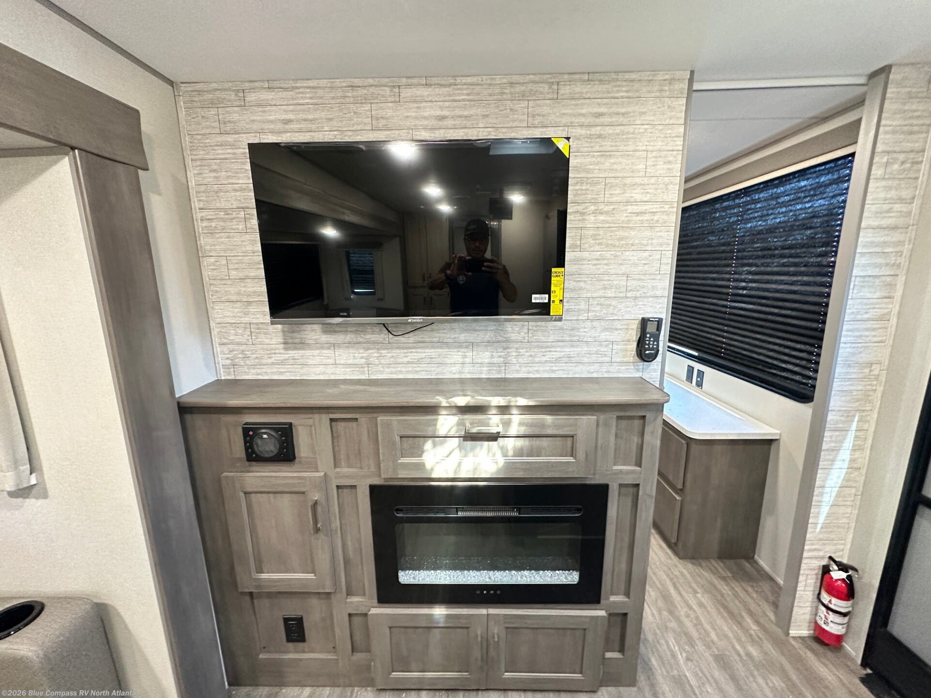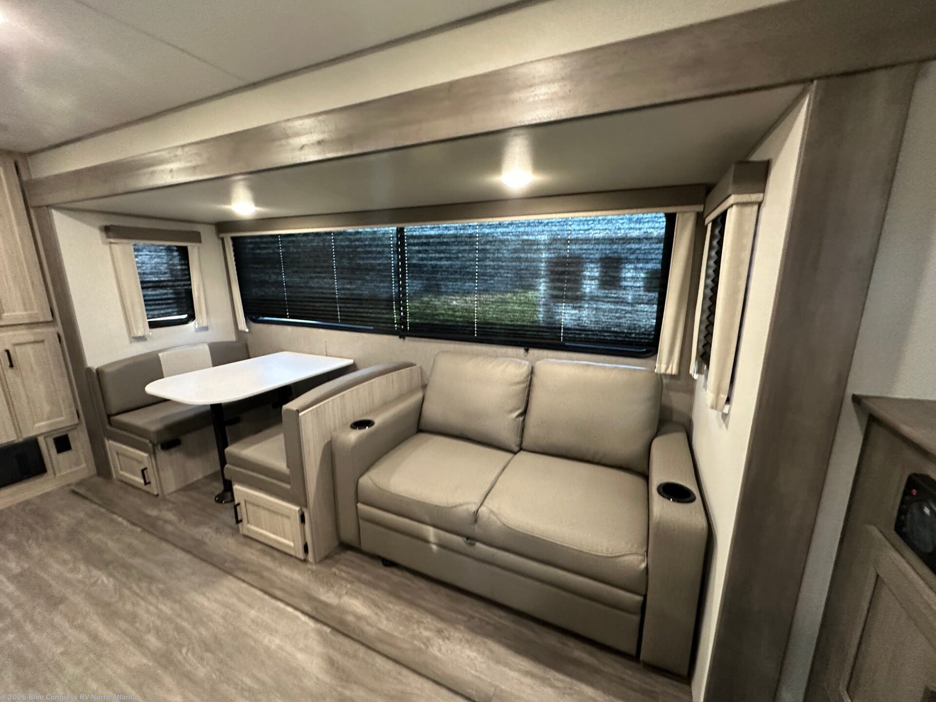 With two full bedrooms, everyone will have their own privacy in this travel trailer! The rear bedroom features a 60" x 74" queen bed slide across from a wardrobe and bed TV top with a cabinet, and the front bedroom features a 60" x 74" queen bed slide across from a dresser, plus a front closet that has an area with washer and dryer prep. You can prepare your best meals with the three burner cooktop, enjoy them at the booth dinette, and store any leftovers in the 10.7 cu. ft. refrigerator. After a fun day outdoors, you can rinse off in the 34" x 34" radius shower pan with glass shower door in the full bathroom or relax on the 68" sofa which has an arm rest with a cupholder and is next to the entertainment center with an optional fireplace!