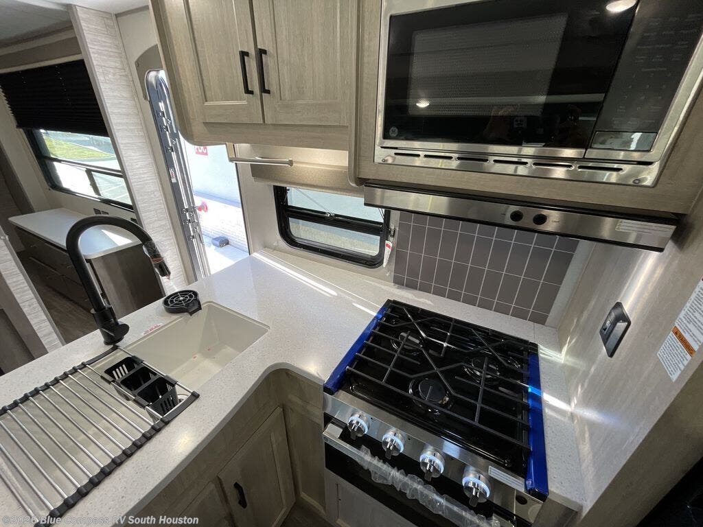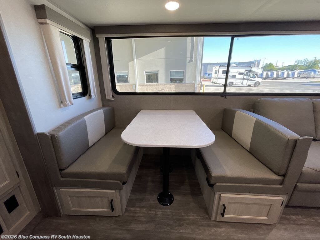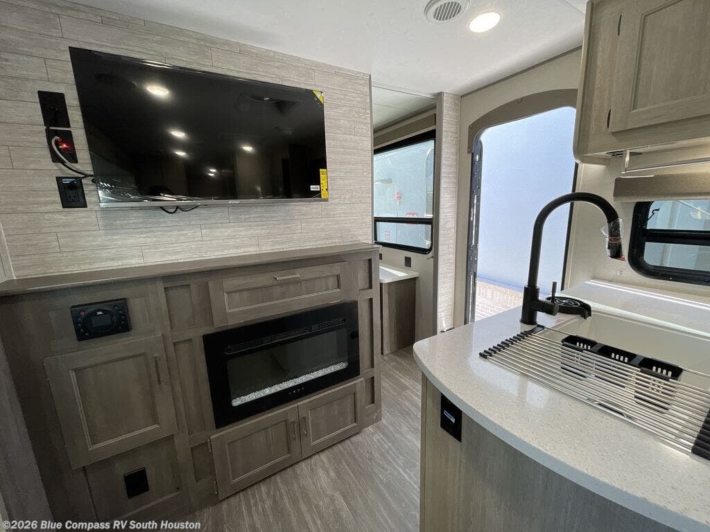With two full bedrooms, everyone will have their own privacy in this travel trailer! The rear bedroom features a 60" x 74" queen bed slide across from a wardrobe and bed TV top with a cabinet, and the front bedroom features a 60" x 74" queen bed slide across from a dresser, plus a front closet that has an area with washer and dryer prep. You can prepare your best meals with the three burner cooktop, enjoy them at the booth dinette, and store any leftovers in the 10.7 cu. ft. refrigerator. After a fun day outdoors, you can rinse off in the 34" x 34" radius shower pan with glass shower door in the full bathroom or relax on the 68" sofa which has an arm rest with a cupholder and is next to the entertainment center with an optional fireplace!