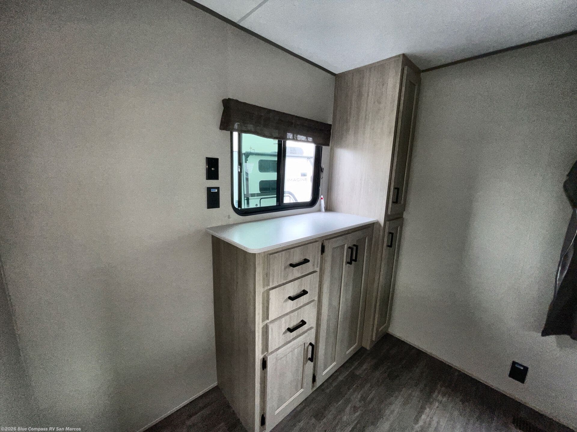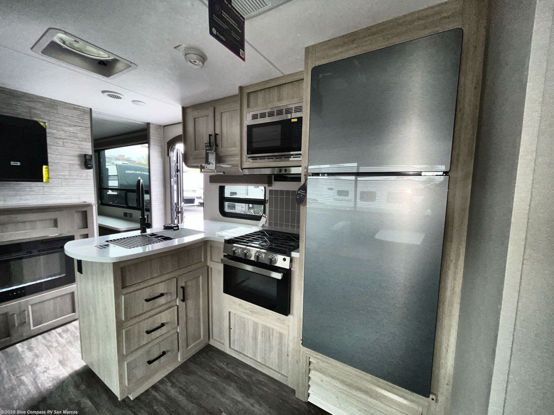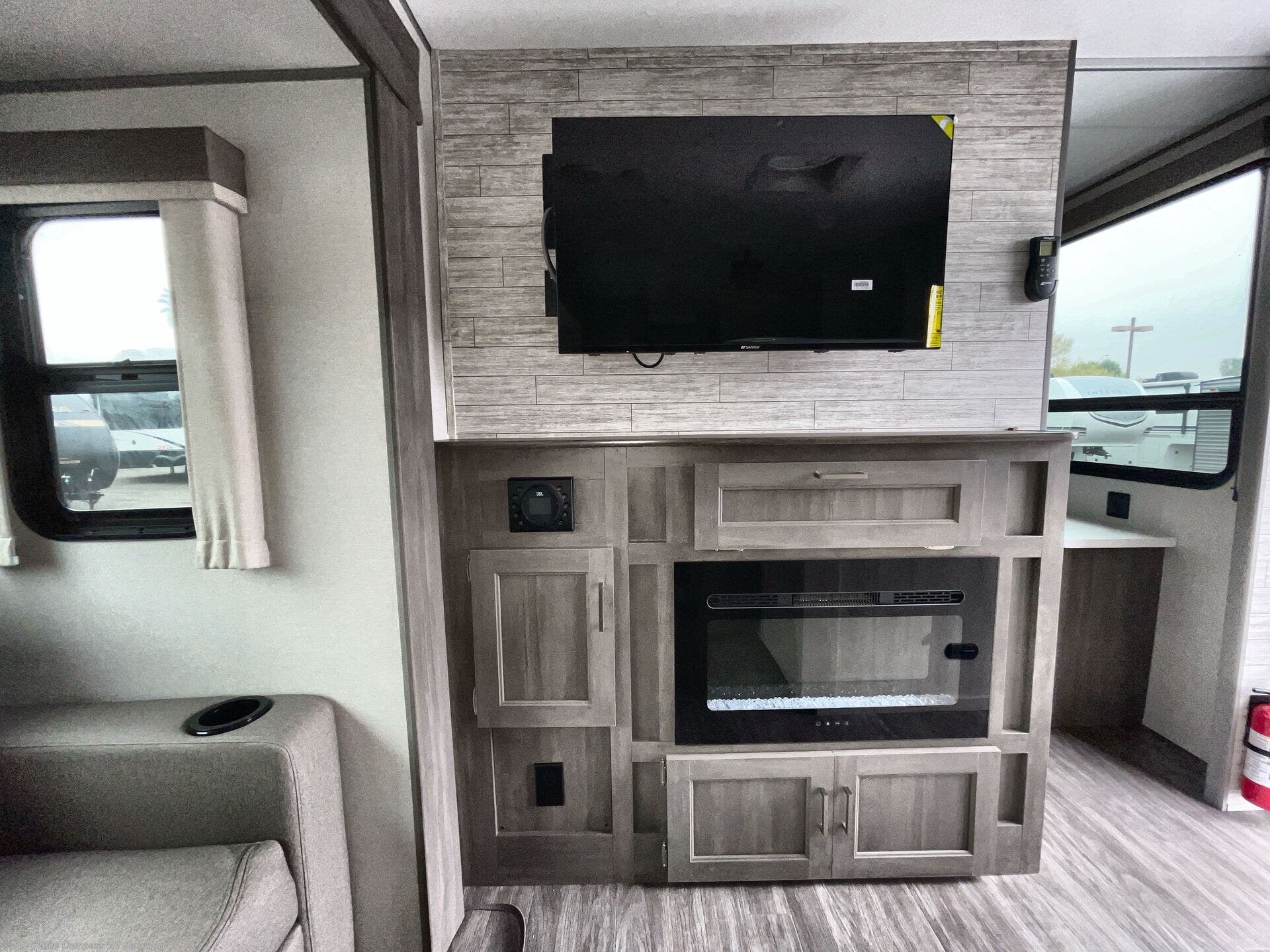With two full bedrooms, everyone will have their own privacy in this travel trailer! The rear bedroom features a 60" x 74" queen bed slide across from a wardrobe and bed TV top with a cabinet, and the front bedroom features a 60" x 74" queen bed slide across from a dresser, plus a front closet that has an area with washer and dryer prep. You can prepare your best meals with the three-burner cooktop, enjoy them at the booth dinette, and store any leftovers in the 10.7 cu. ft. refrigerator. After a fun day outdoors, you can rinse off in the 34" x 34" radius shower pan with glass shower door in the full bathroom or relax on the 68" trundle sofa which has an arm rest with a cupholder and is next to the entertainment center with an optional fireplace!