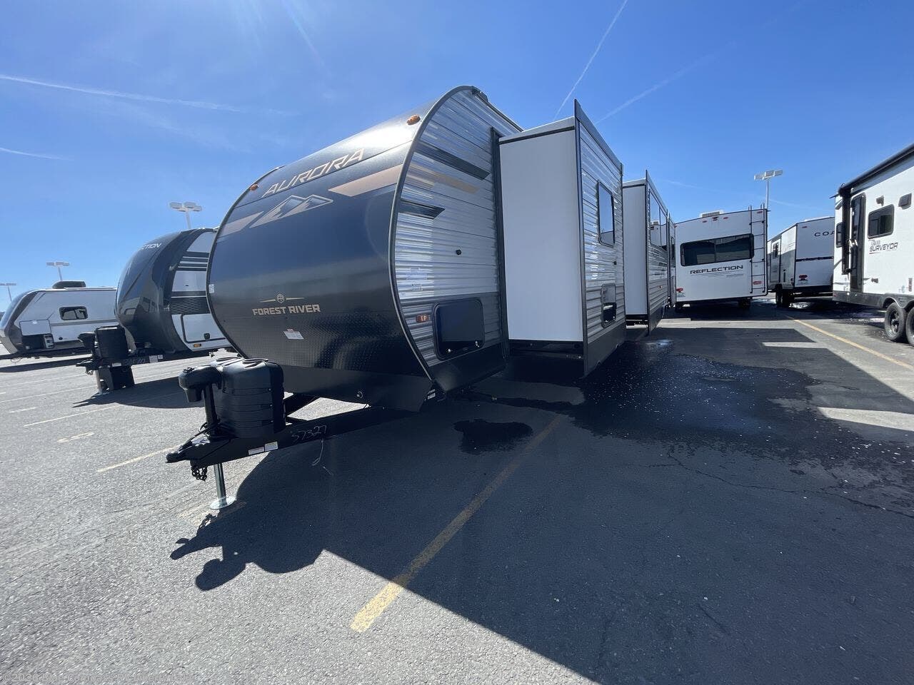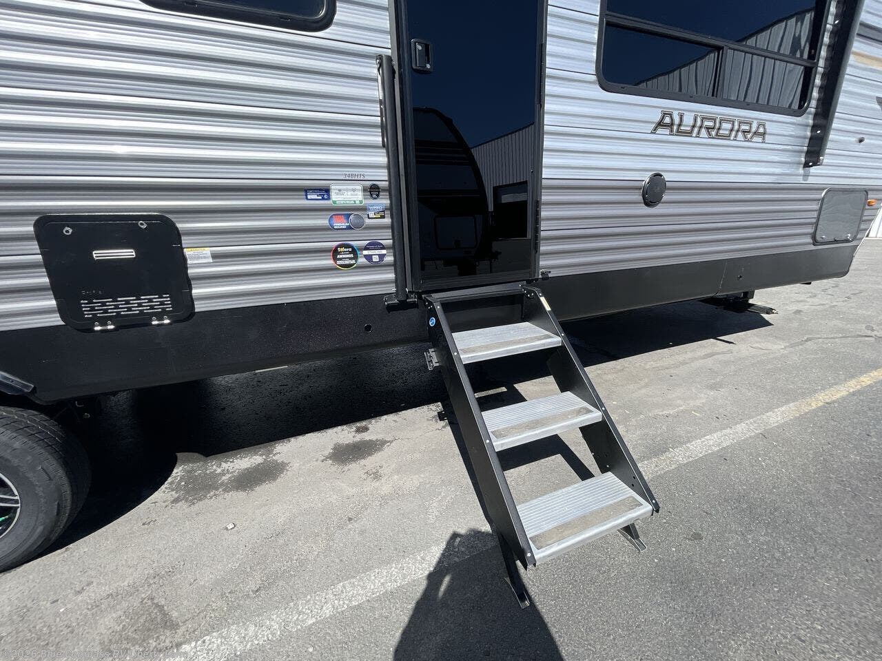 Comfortability, usability, and quality is what you will find in each one of these Forest River Aurora travel trailers, toy haulers or destination trailers! They are designed with a superior build and packed full with industry leading, functional, and distinctive standard features. SolidStep entrance steps and a Safe-T rail door assist on main entry door to help you safely enter and exit the unit. The diamond plate rock guard will protect your unit from road debris and the nitrogen filled radial tires, which keep their pressure longer, offer better fuel economy. You will also find upgraded JBL Elite exterior speakers outside, an electric awning with multicolor lights and remote, plus flush mount baggage doors for easy packing. The interiors are beautifully designed with a deep undermount farm style sink, stainless steel appliances, and linoleum flooring in the slide outs which will be easy to clean. Come find your favorite model today!